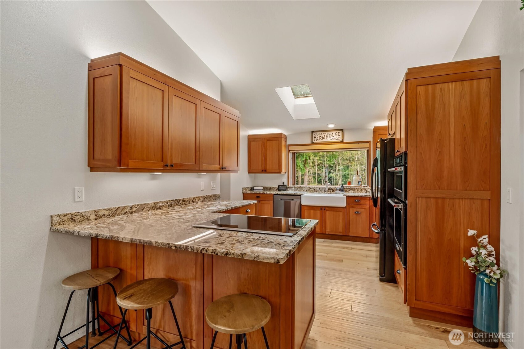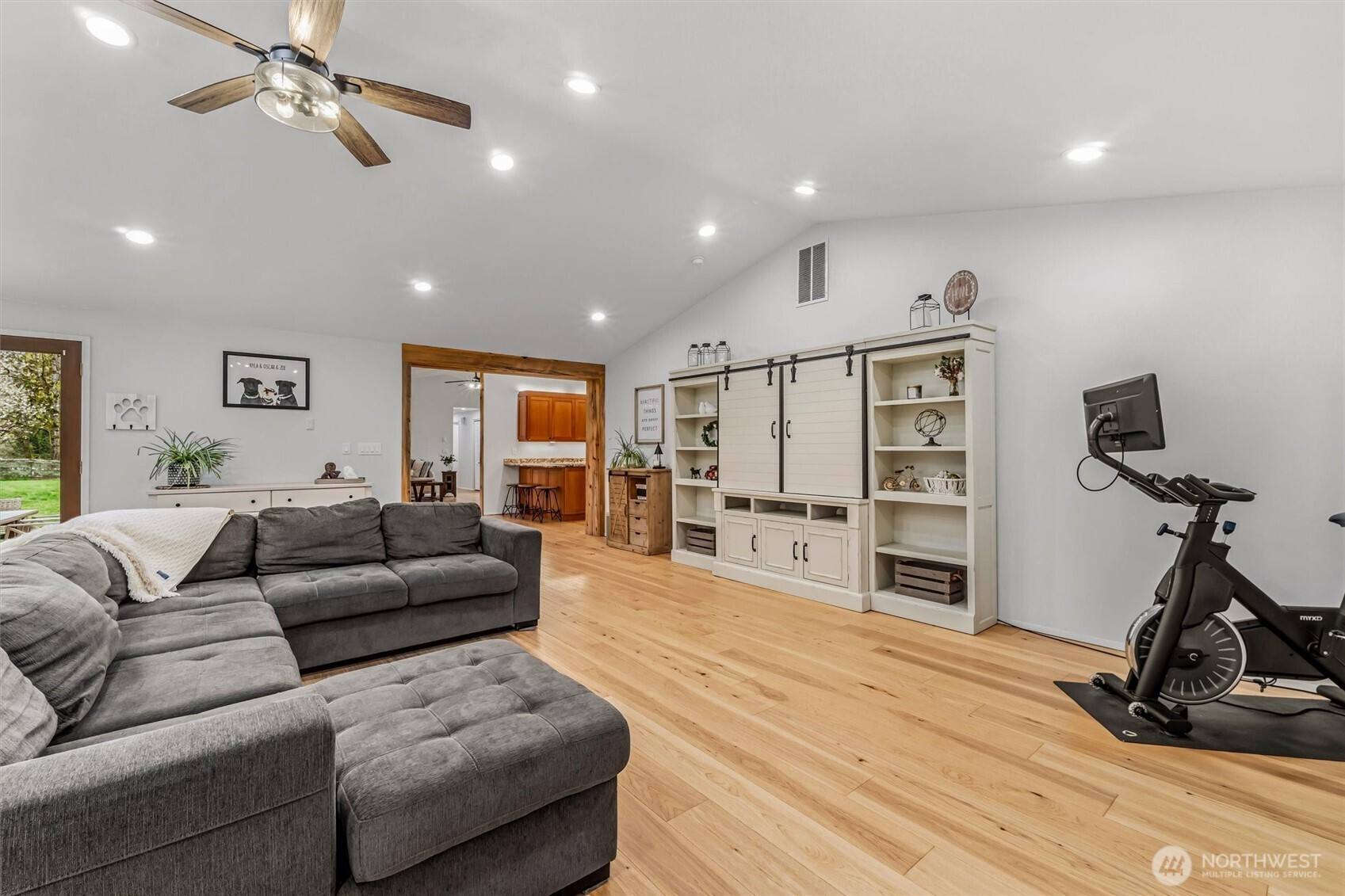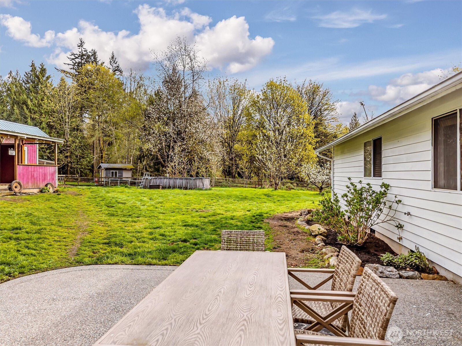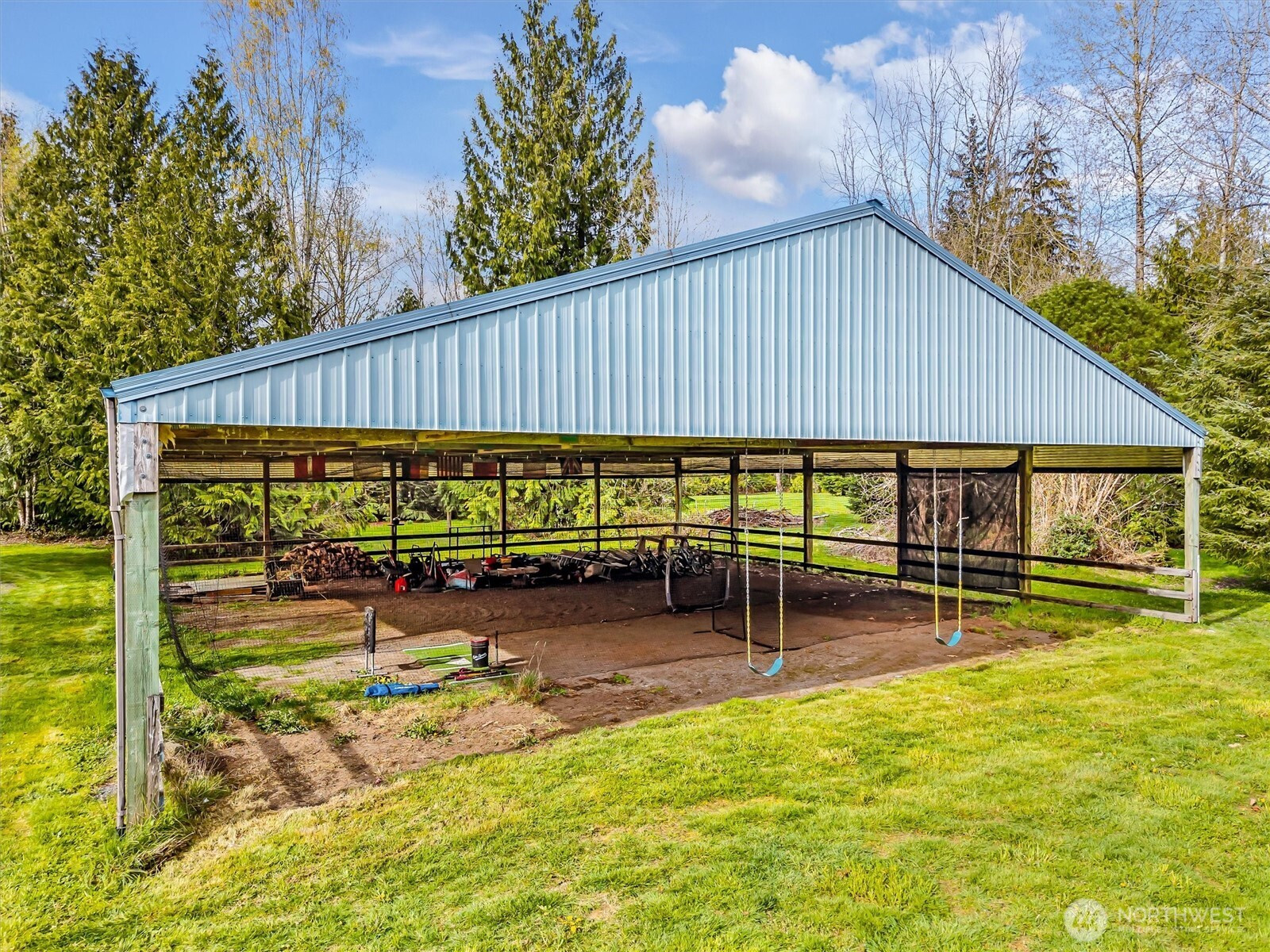 The Country Escape You've Been Dreaming Of! Five-acre properties in this sought-after community don't come along often, & this beautifully updated 2800 sq. ft. rambler delivers the space, features, & flexibility you've been looking for set against a stunning country backdrop. The kitchen impresses with granite countertops, custom cabinetry, an induction cooktop, farmhouse sink, & a generous walk-in pantry. A wood burning stove anchors the light-filled living room, while rich engineered hardwood flows throughout for a warm, polished feel. The converted garage expands the living space with a family room, den, ideal for working from home, an additional ¾ bath, & laundry room. The expansive Great Room is the true heart of the home. Soaring space perfect for gatherings large & small, with French doors that seamlessly connect indoor living to your stunning outdoor acreage. This hobby farm has it all! Cool off in the above-ground pool, collect eggs from your chicken coop, & breathe in the serenity only acreage living provides. The barn, complete with stalls & a garage door for covered parking, plus an approx. 60x60 covered arena handles equestrian & storage. A separate outbuilding offers even more room for a shop or additional storage. A serene seasonal pond completes this picture-perfect property. Home is prewired for a generator for peace of mind in every season. Minutes to Hwy 9, town, & the Centennial Trail. This is country living, elevated. Welcome to the Marysville Highlands!