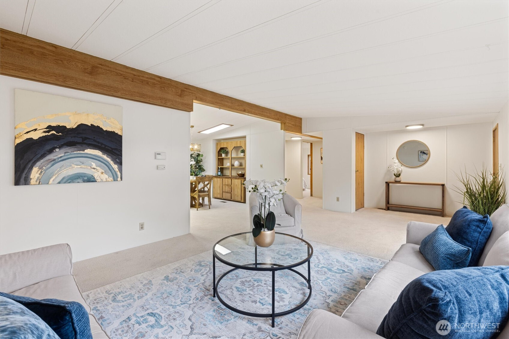 Affordable & well cared for 2 Bdrm/2 Ba (1,056sf) Mfg home in a 55+ adult commty 0.25mi to desirable Silver Lake Public Park. Large & beautiful, easy care yard w/ a small pond & mature landscaping w/ large covered deck. Home has newer flooring thru-out, updated wall finish/remodeled kitchen, excellent natural lighting living room. NEW ROOF in 2024, NEW WATER HEATER 2025, NEWER VINYL WINDOWS. Guest parking off cul-de-sac in front of home. Carport + 1 uncovered parking behind home. Park features clubhouse with gaming options. Move in ready. Seller moving abroad. Personal items negotiable. Two different roads to access this home in park. Space rent includes water/sewer/garbage. Quality built home w/copper wiring.