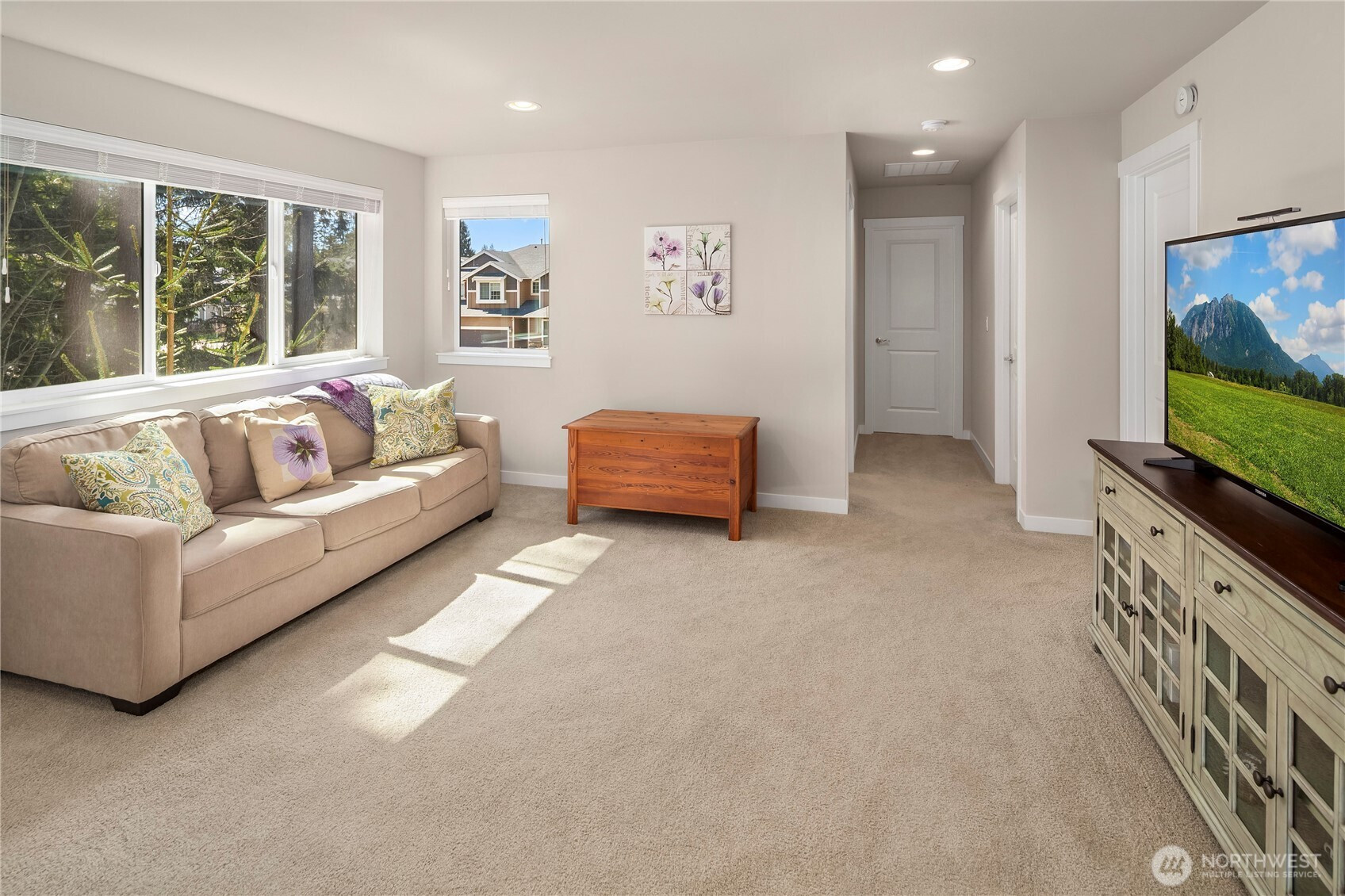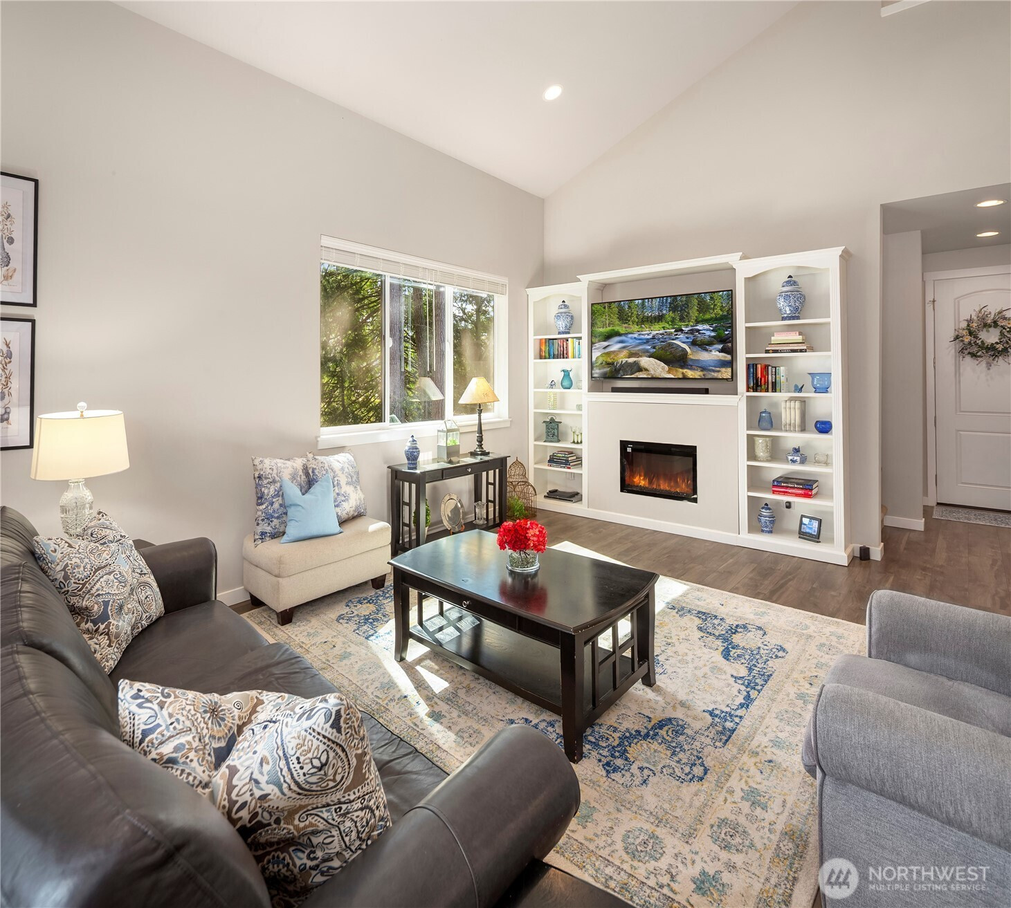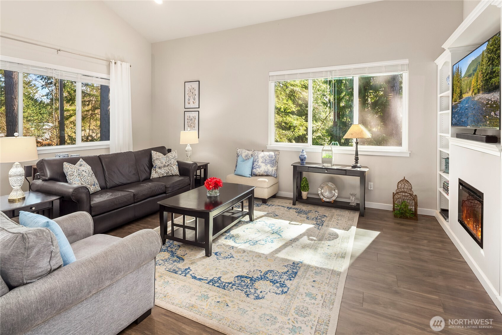 Welcome to Parkland Place (Silver Lake area)—where suburban sophistication meets a serene country vibe. Enjoy the best of both worlds — peaceful, scenic surroundings paired with modern design and amenities. Step outside to your own private retreat, featuring a tranquil, tree-lined backyard framed by mature evergreens and an elevated deck with enclosed railing—perfect for morning coffee or evening gatherings. Inside, discover a beautifully designed open floor plan with gorgeous, engineered wood floors. & great room w/vaulted ceilings. The spacious great room features vaulted ceiling, oversized windows, a custom bookcase with built-in shelving, and a sleek electric fireplace. The chef's kitchen ideal for both cooking and entertaining--offers warm mocha-colored cabinets, quartz countertops, an oversized island, stainless steel appliances, a gas range, and a walk-in pantry. Follow the captivating staircase to upstairs featuring 4 bedrooms & 2.75 BAs--The main level also includes a versatile bedroom (currently used as an office) and ¾ bath. Upstairs, enjoy a bright loft area, a luxurious primary suite, two additional bedrooms, and a full main bathroom—all designed for comfort and functionality. A two-car garage w/overhead storage racks, a fully fenced yard, located near local amenities and Mill Creek Town Center. This home offers the perfect blend of modern elegance, everyday convenience, and peaceful country charm. Come see why Parkland Place is the perfect place to call home!