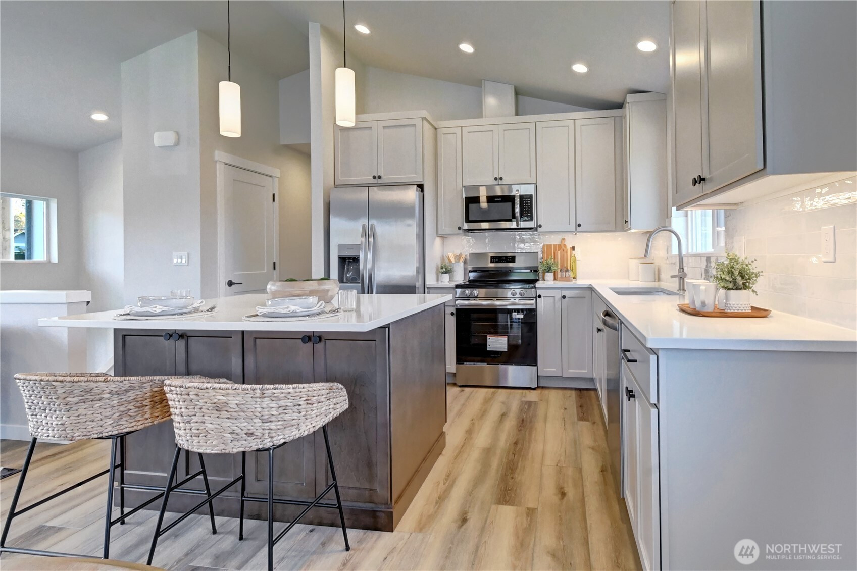LAKEFRONT LIVING! NEW WATERFRONT HOME situated lakeside in the gated Rainbow Springs Community. A PNW gem with access to a community riverfront park w/picturesque sandy beach, lake trails, and other private park amenities. This new home boasts designer finishes and upgrades throughout! Gourmet kitchen, dining, and living spaces w/ample lighting from surrounding windows, peaceful views of Rainbow Springs Lake. Enjoy SS appliances, quartz counters, quality cabinetry, beautiful/durable Luxury Vinyl Plank Flooring throughout, designer carpet in 3 bedrooms, plus a bonus room. Lakeside access to the HUGE backyard. The spacious primary suite features a stunning tile shower, walk-in closet, and more waterfront views! A MUST-SEE QUALITY HOME!