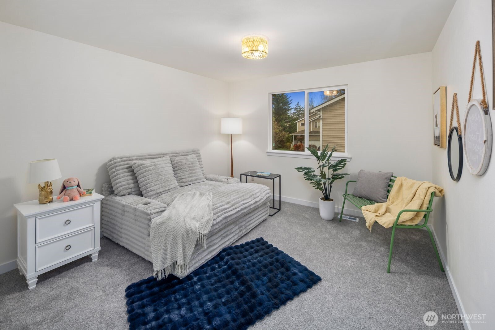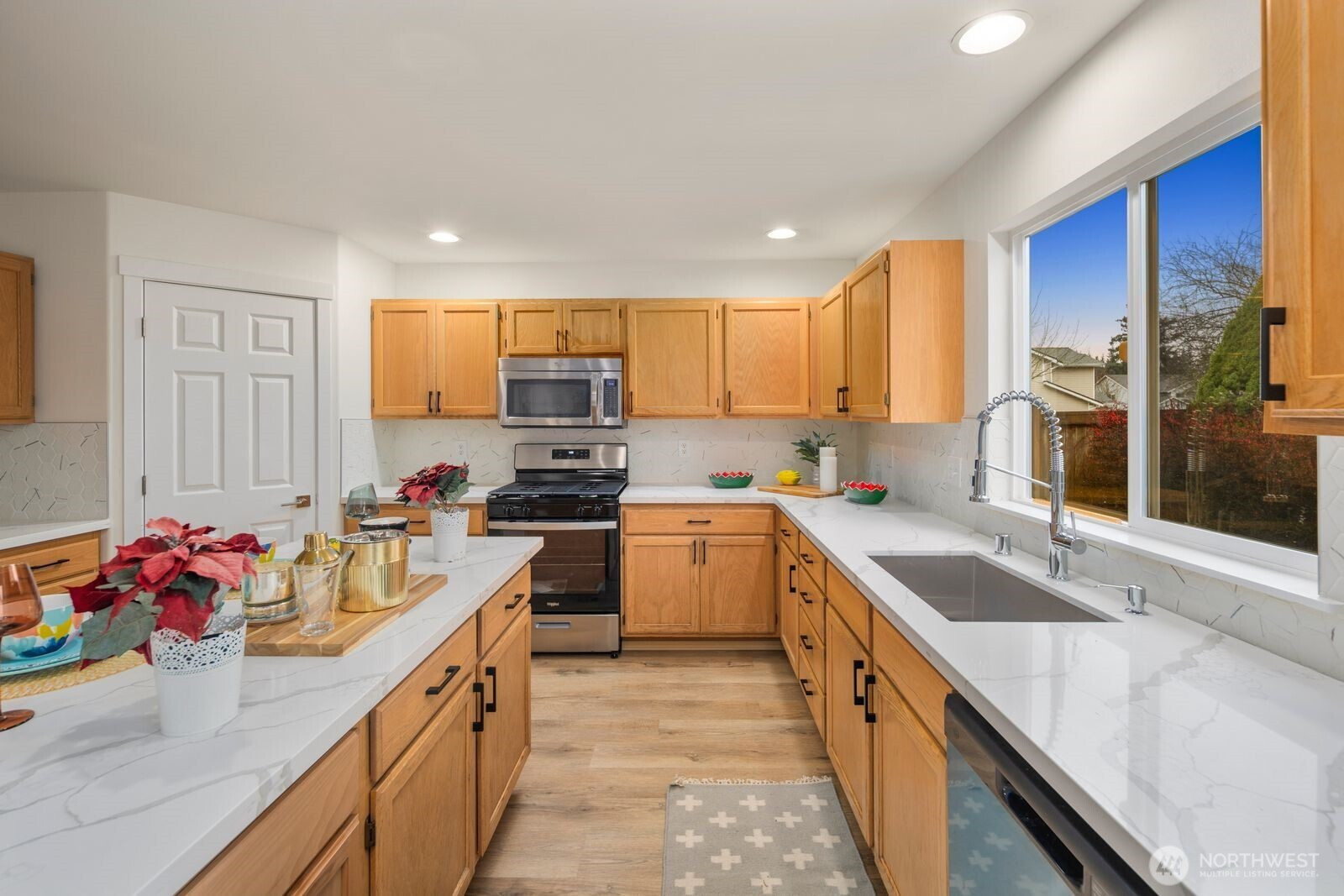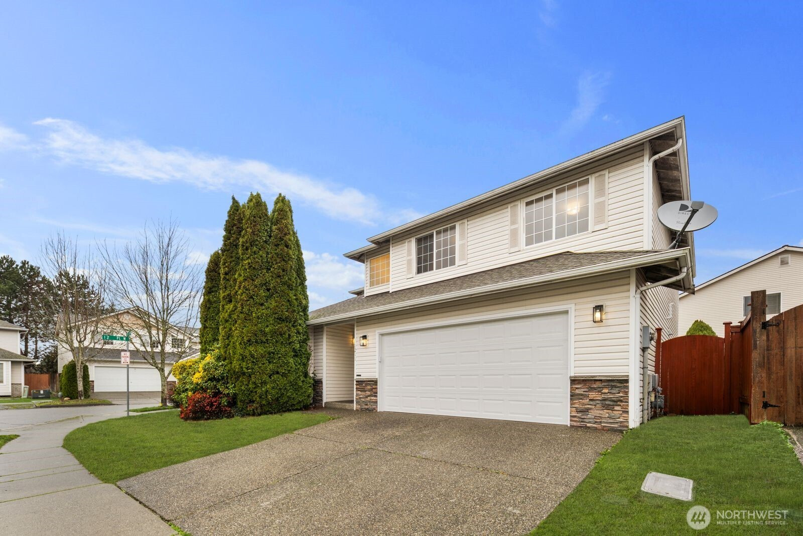 Beautifully updated 2-story home in Sunridge Highlands on a premium corner lot! Open layout w/ gas-fireplace living rm & main-level guest suite w/ full Bath & WIC. Rounded corner walls + New interior paint, LVP floors, carpet, counters, backsplashes, fixtures, doorknobs, & renovated Baths w/ modern finishes. Kitchen w/ Walk-In Pantry, New undermount sink, faucet, gas stove, & dishwasher. Primary Suite offers double-door entry, soaking tub, shower, dual vanities, & WIC. Stairs w/ Skylight. Dual sliding glass door leads to the fully fenced private back yard w/ patio & shed. Move-in ready & perfect for all lifestyles! Walkable to Martha Lake Elem. Short drive to Lynnwood High, Alderwood Mall, Costco, Target, & more at the I-5 & I-405 freeways.