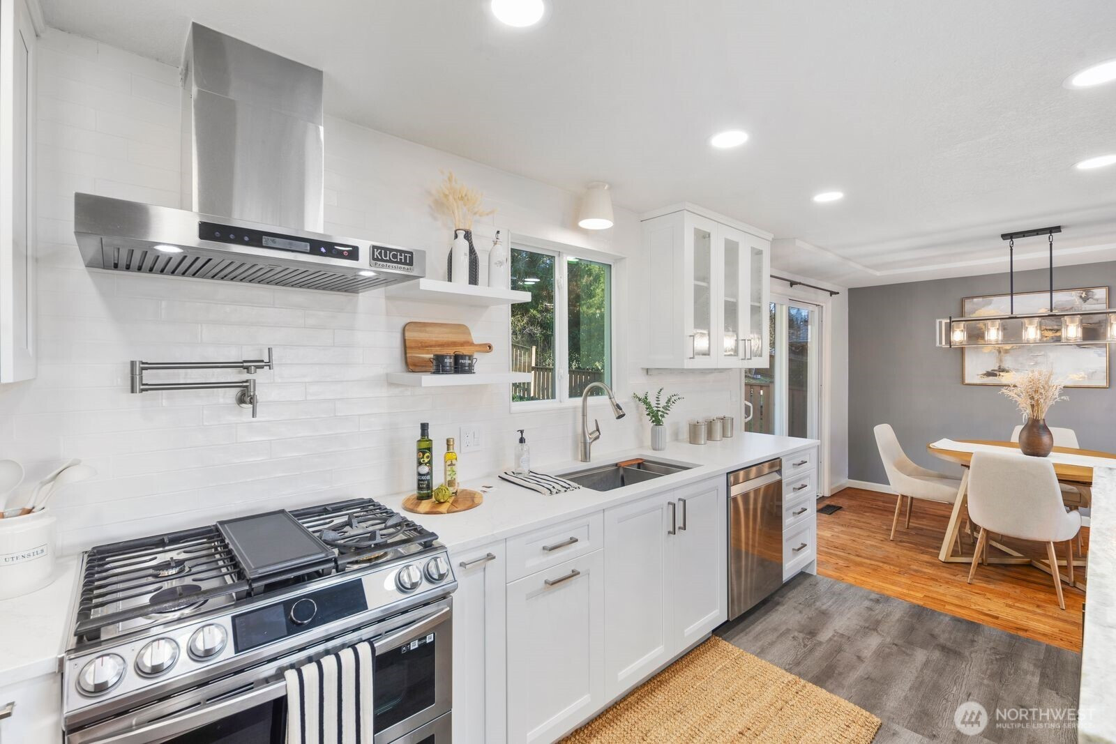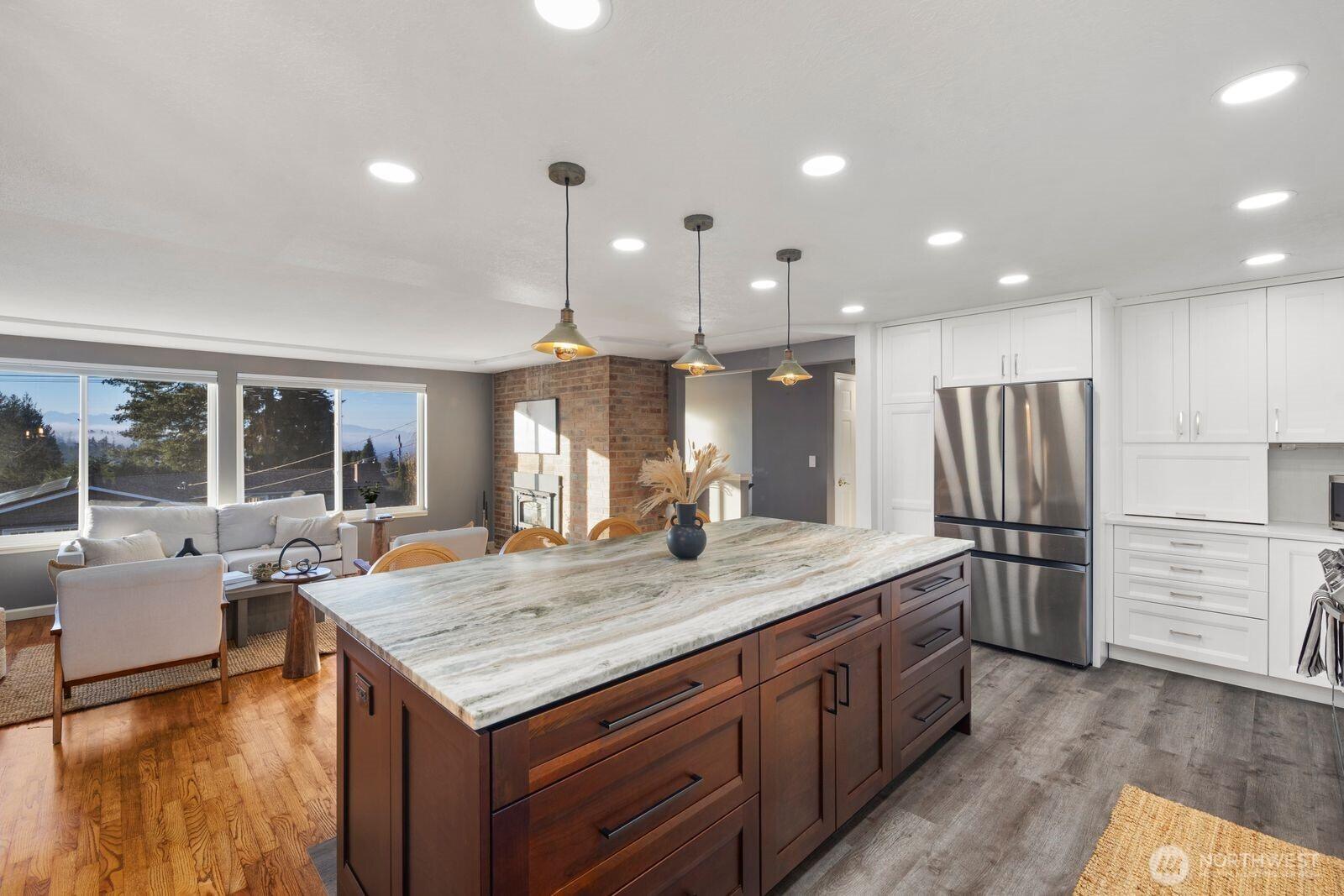 Turnkey Edmonds Bowl mid-century split-level w/ open-concept living. Light-filled main features spacious living w/ brick fireplace & large picture windows w/ Sound & Olympic views. Remodeled chef’s kitchen offers huge slab island, quartz counters, shaker cabinets, pot filler, SS appliances w/ dual ovens & open shelving. Dining area opens to fully-fenced backyard. 3-beds on main, including the Primary Suite. All baths updated. Lower-level rec room provides great flex space. Hardwoods throughout. Updated lighting, 2-car garage. New furnace & heat pump (2024) & attic insulation (2025). Sited on a large 1/4 acre lot on a residential street. 2-car garage & ample street parking. Moments to DT Edmonds shops, restaurants, farmer's market & beach.
