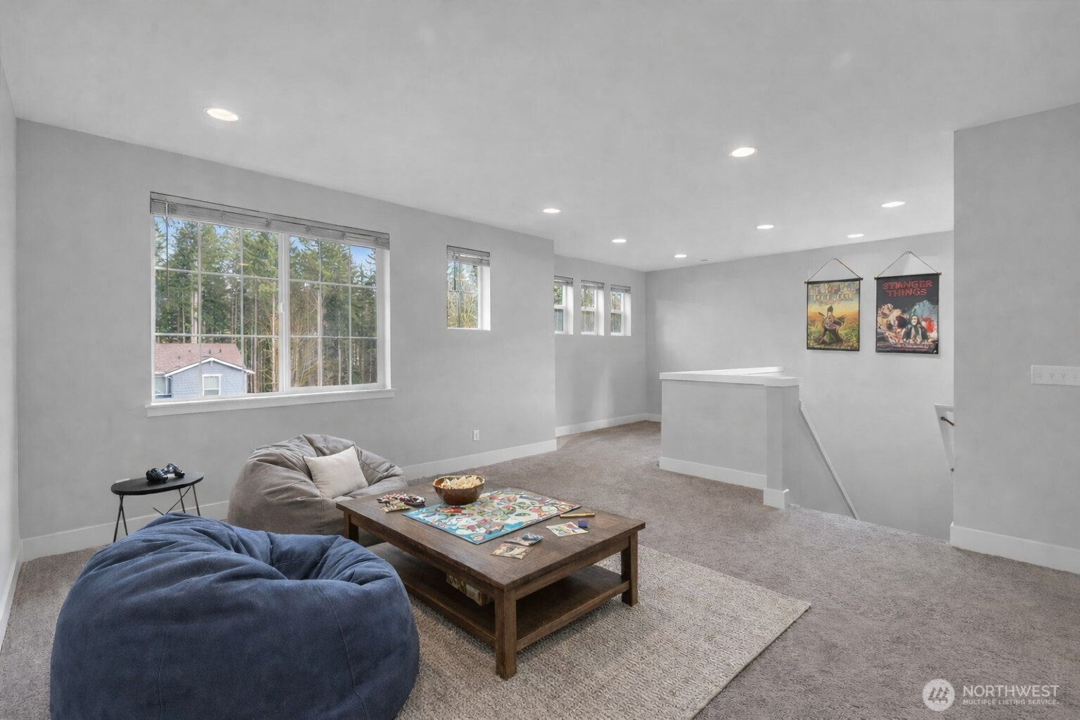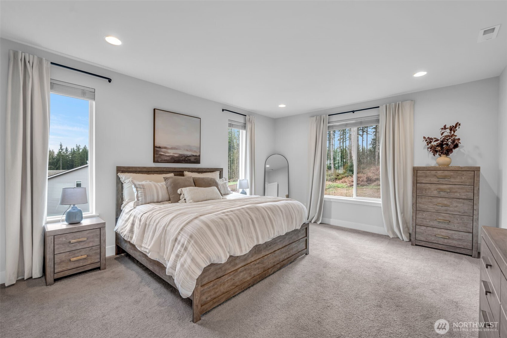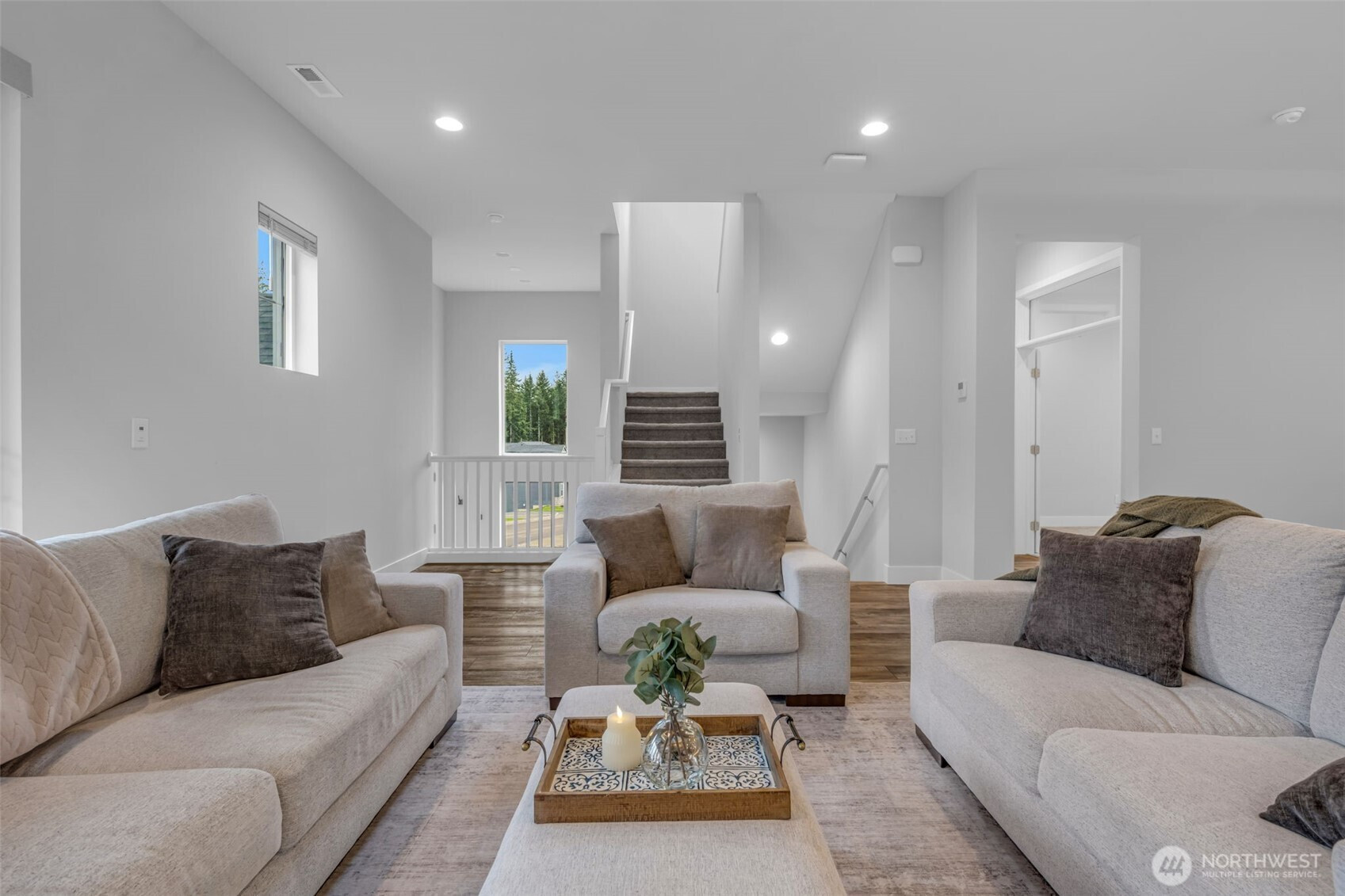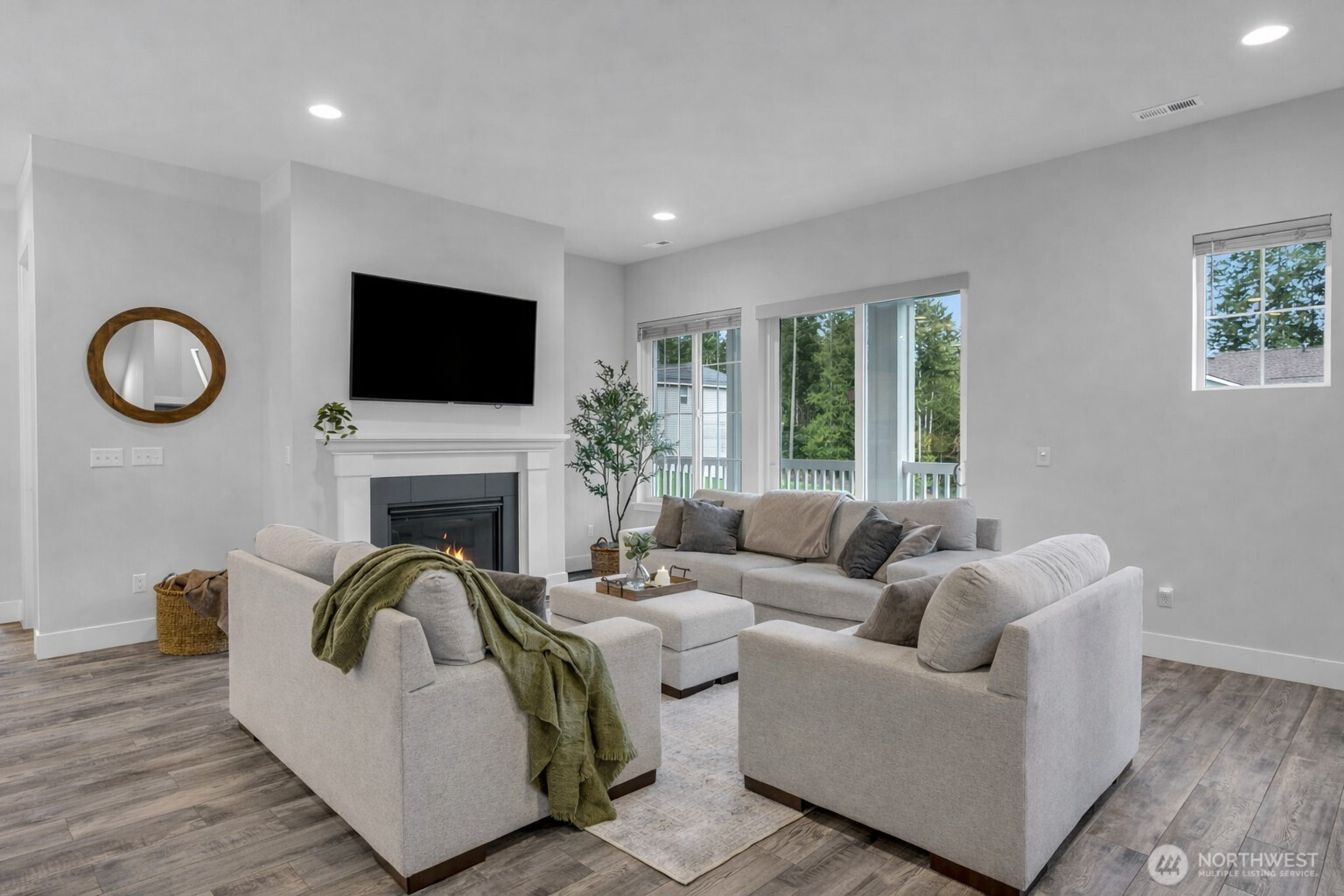 Welcome to this stunning home on a nearly 1-acre lot in Lake Stevens, where thoughtful design meets everyday comfort. Built in 2022, this exceptional home offers 5 bedrooms, 3.5 baths and 3,866 sq ft of living space designed for a modern lifestyle. Flooded with natural light, the open-concept main floor features a chef’s kitchen with quartz countertops, expansive island, white shaker cabinetry, and stainless steel appliances. Seamlessly connecting to the dining and living areas. Perfect for entertaining. Step outside to either your covered front balcony or back patio with outdoor fireplace, creating an inviting indoor-outdoor living experience amidst a wooded backdrop. The primary suite boasts a 5-piece ensuite and generous closet space. Additional bedrooms, flex space, office, and bonus rooms allow for versatile use. The main floor offers a guest suite with an attached full bath that is perfect for guests or multi generational living. This low maintenance yard backs to a peaceful greenbelt, offering tranquility and room for outdoor enjoyment. Additional features include a 3-car attached garage, central air conditioning, high-efficiency heating, partial fencing and quality finishes throughout. Ideally located just minutes from shopping and Lake Stevens amenities, this home combines luxury, comfort and lifestyle in one remarkable package.