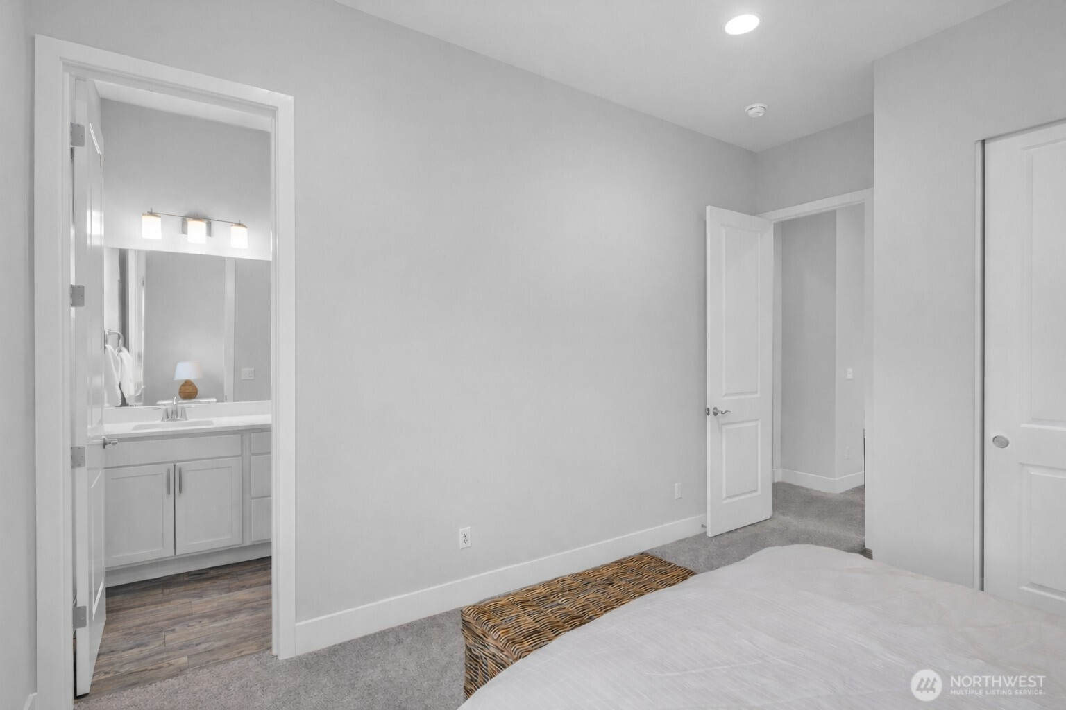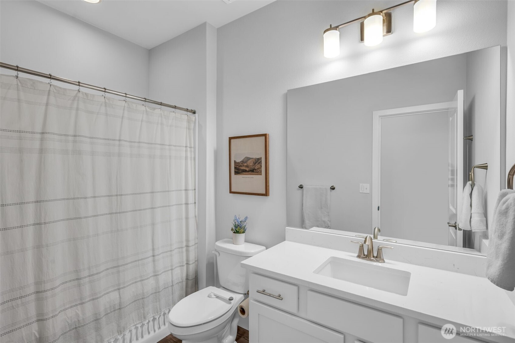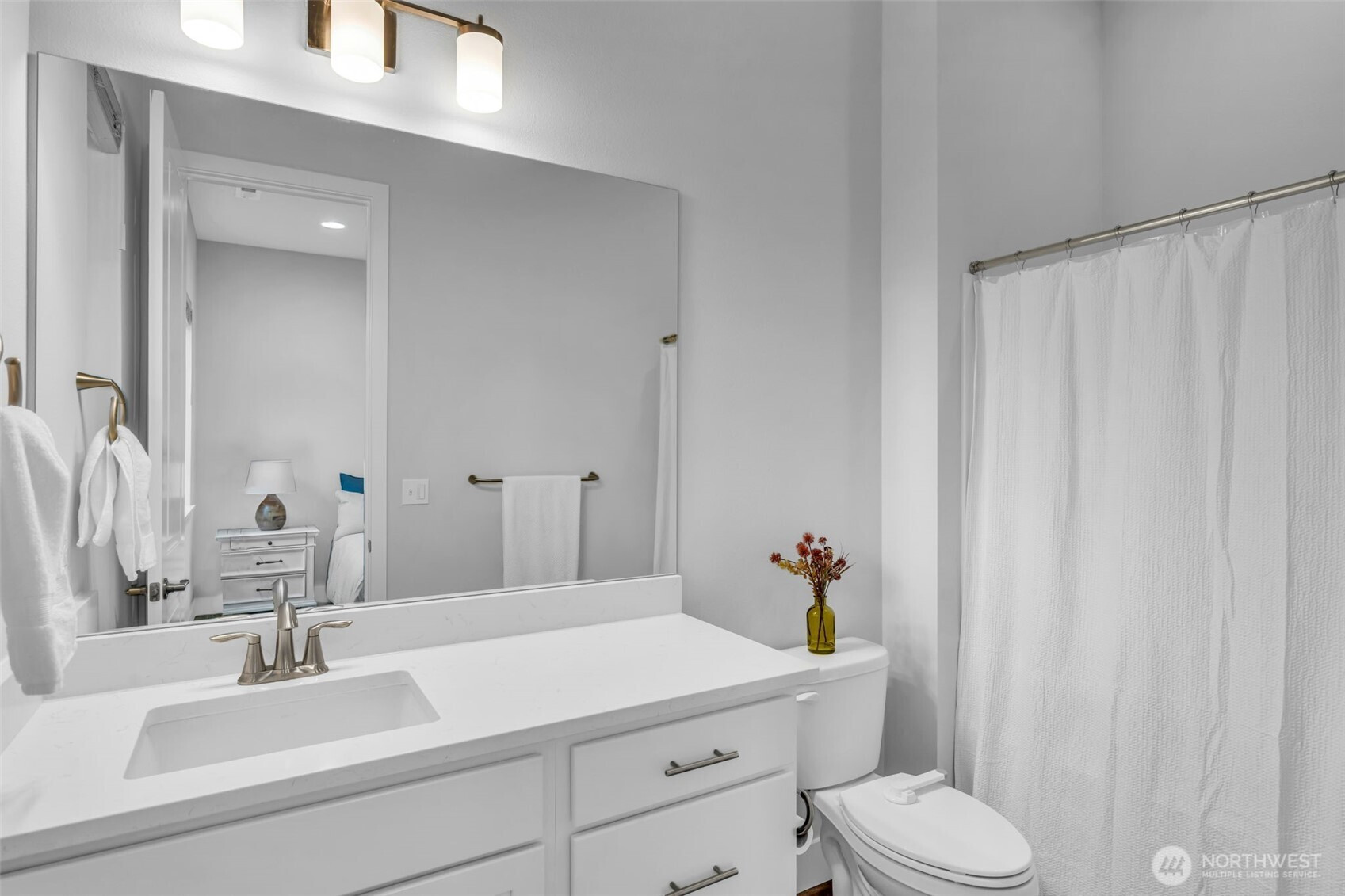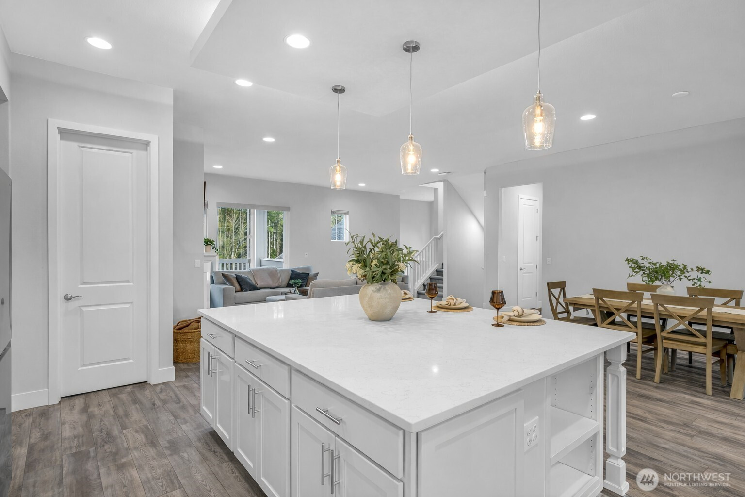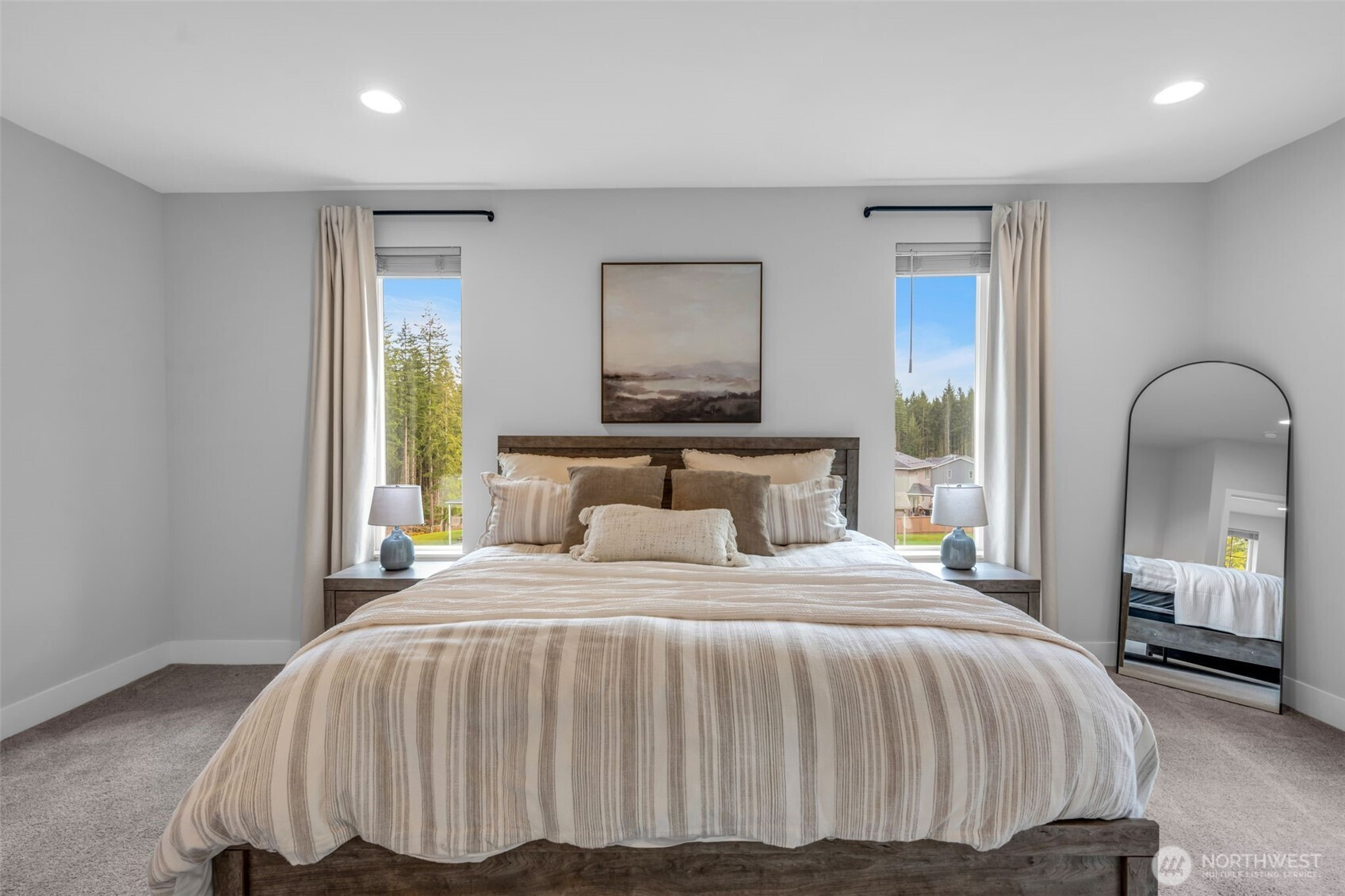 Welcome to this stunning home on a nearly 1-acre lot in Lake Stevens, where thoughtful design meets everyday comfort. Built in 2022, this exceptional home offers 5 bedrooms, 3.5 baths and 3,866 sq ft of living space designed for a modern lifestyle. Flooded with natural light, the open-concept main floor features a chef’s kitchen with quartz countertops, expansive island, white shaker cabinetry, and stainless steel appliances. Seamlessly connecting to the dining and living areas. Perfect for entertaining. Step outside to either your covered front balcony or back patio with outdoor fireplace, creating an inviting indoor-outdoor living experience amidst a wooded backdrop. The primary suite boasts a 5-piece ensuite and generous closet space. Additional bedrooms, flex space, office, and bonus rooms allow for versatile use. The main floor offers a guest suite with an attached full bath that is perfect for guests or multi generational living. This low maintenance yard backs to a peaceful greenbelt, offering tranquility and room for outdoor enjoyment. Additional features include a 3-car attached garage, central air conditioning, high-efficiency heating, partial fencing and quality finishes throughout. Ideally located just minutes from shopping and Lake Stevens amenities, this home combines luxury, comfort and lifestyle in one remarkable package.