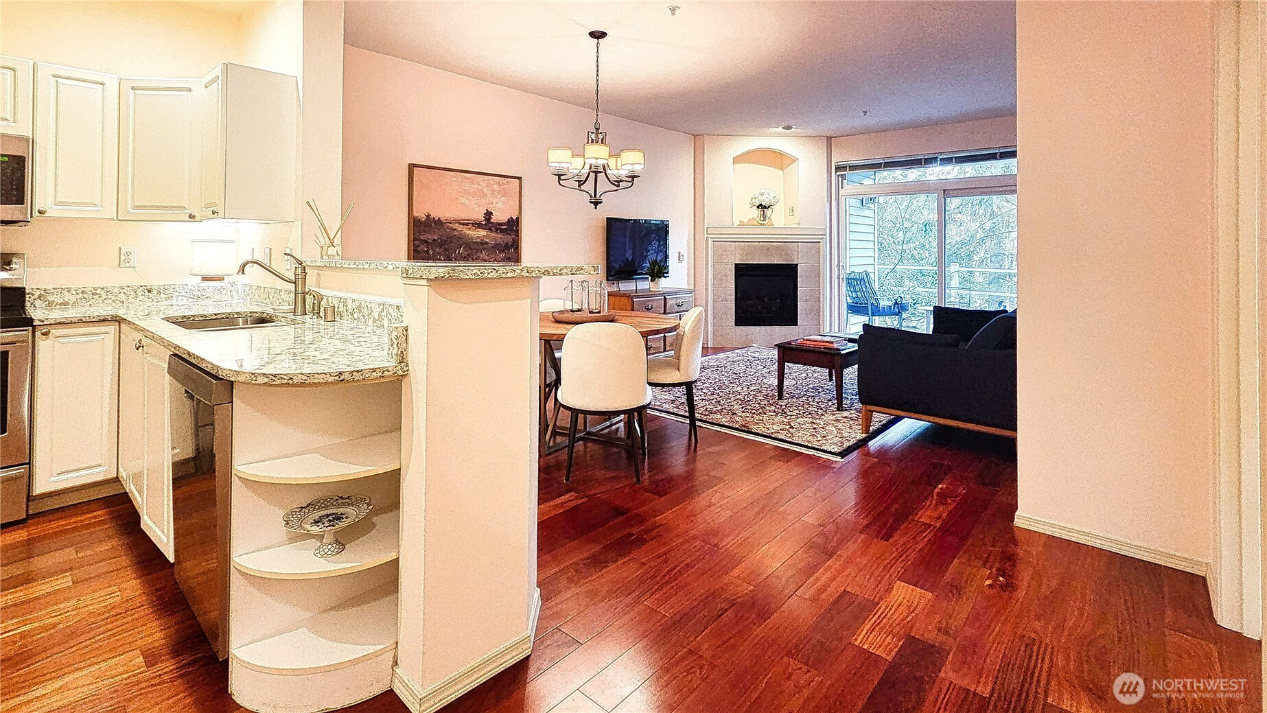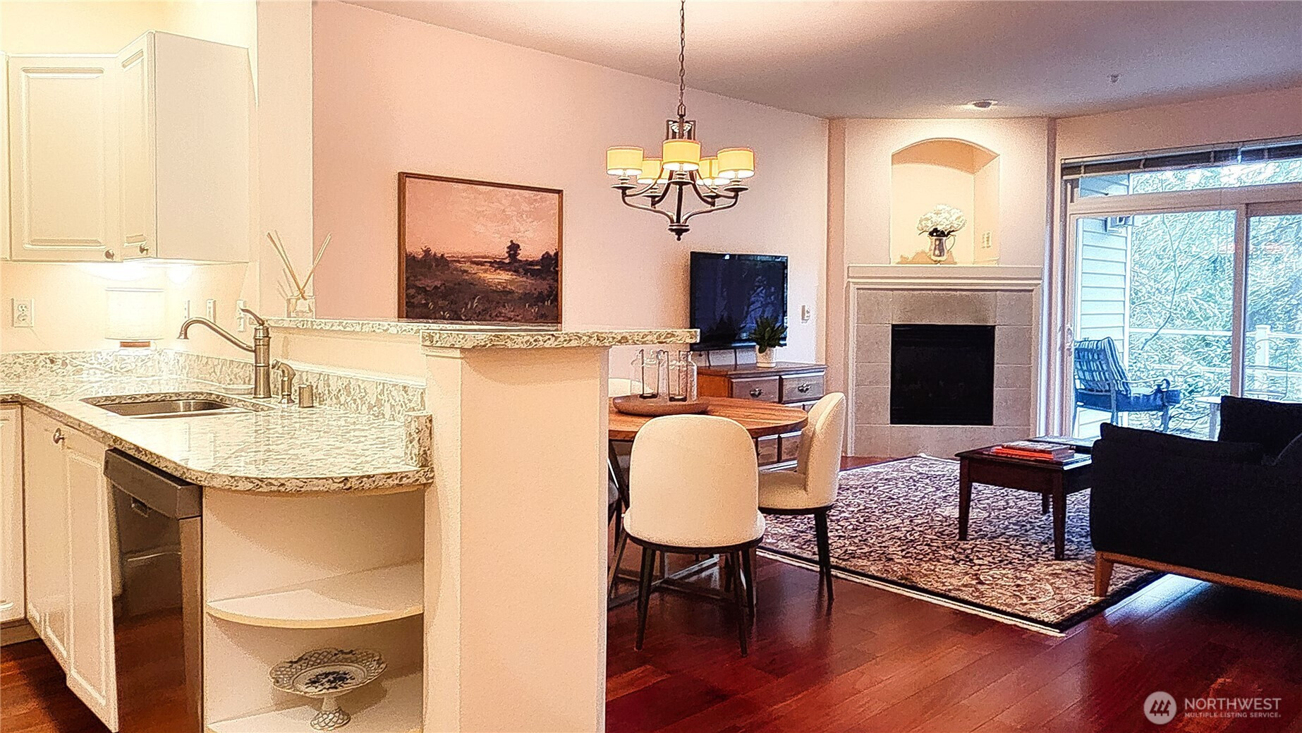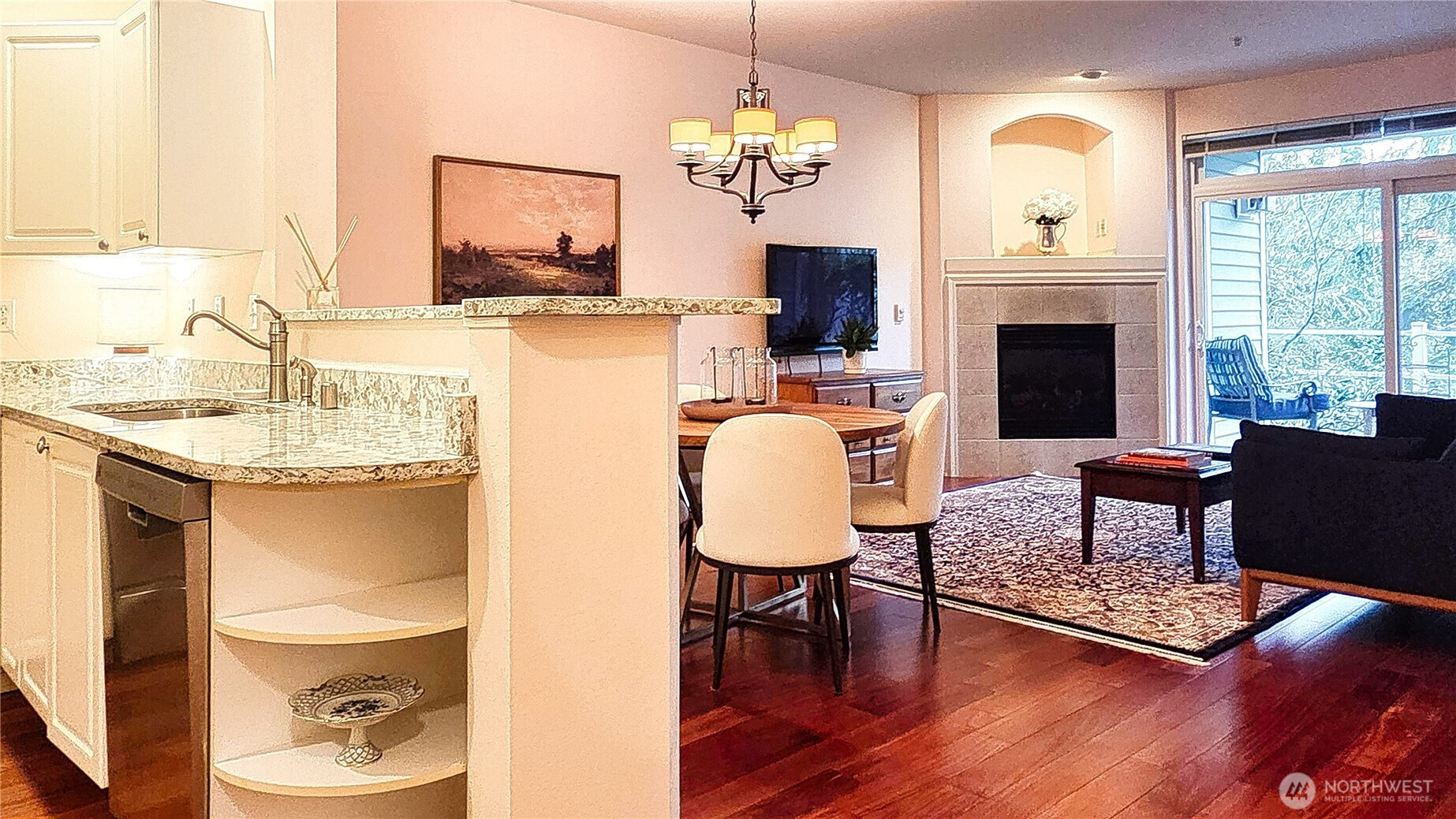 Set against a protected greenbelt, this well-maintained and thoughtfully updated ground-floor condo offers privacy, comfort, and convenience in one of the area’s most accessible locations. With peaceful wetlands directly behind the unit, the home enjoys a quiet, natural backdrop that can be appreciated from both the interior living spaces and the covered patio. Inside, hardwood floors define the main living areas, complemented by carpet in the bedrooms. The living room features a cozy, temperature-controlled gas fireplace—ideal for creating warmth and ambiance while maintaining energy efficiency. Large windows bring in natural light while preserving privacy. The kitchen is both functional and stylish, featuring stainless steel appliances, quartz countertops, and ample cabinetry. It opens easily to the dining and living areas, creating a layout well-suited for everyday living as well as entertaining. The primary suite was updated in 2024 and offers a comfortable, refreshed retreat. The bedroom includes a walk-in closet plus a second closet, providing excellent storage. The attached primary bathroom features an elevated dual-sink quartzite vanity with generous counter space and a walk-in shower with excellent water pressure. Ground-floor access and wheelchair-friendly features add to the home’s practicality and long-term livability. The covered patio includes additional storage and offers a private outdoor space.