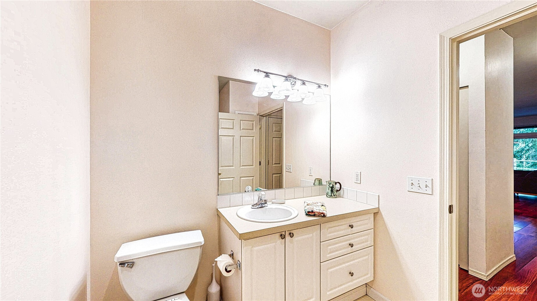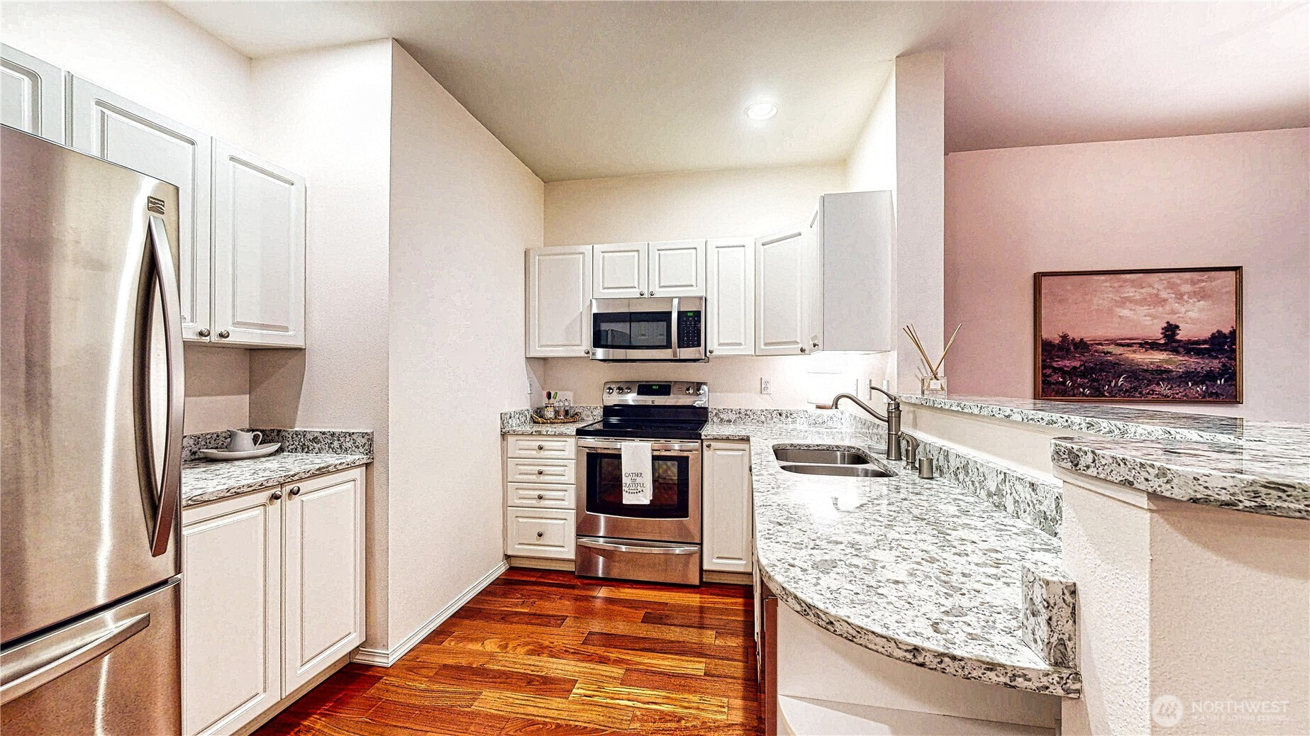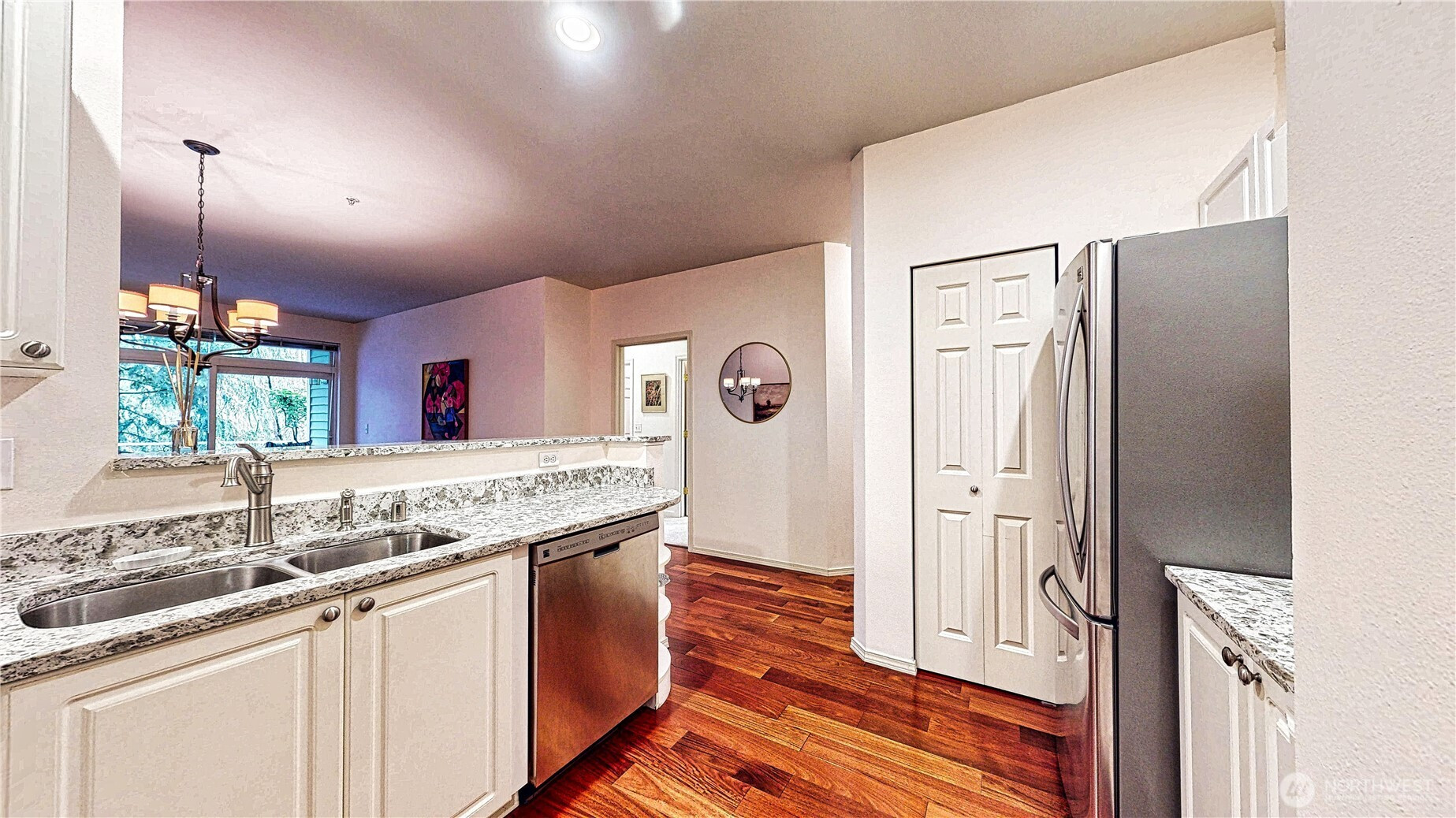Set against a protected greenbelt, this well-maintained and thoughtfully updated ground-floor condo offers privacy, comfort, and convenience in one of the area’s most accessible locations. With peaceful wetlands directly behind the unit, the home enjoys a quiet, natural backdrop that can be appreciated from both the interior living spaces and the covered patio. Inside, hardwood floors define the main living areas, complemented by carpet in the bedrooms. The living room features a cozy, temperature-controlled gas fireplace—ideal for creating warmth and ambiance while maintaining energy efficiency. Large windows bring in natural light while preserving privacy. The kitchen is both functional and stylish, featuring stainless steel appliances, quartz countertops, and ample cabinetry. It opens easily to the dining and living areas, creating a layout well-suited for everyday living as well as entertaining. The primary suite was updated in 2024 and offers a comfortable, refreshed retreat. The bedroom includes a walk-in closet plus a second closet, providing excellent storage. The attached primary bathroom features an elevated dual-sink quartzite vanity with generous counter space and a walk-in shower with excellent water pressure. Ground-floor access and wheelchair-friendly features add to the home’s practicality and long-term livability. The covered patio includes additional storage and offers a private outdoor space.