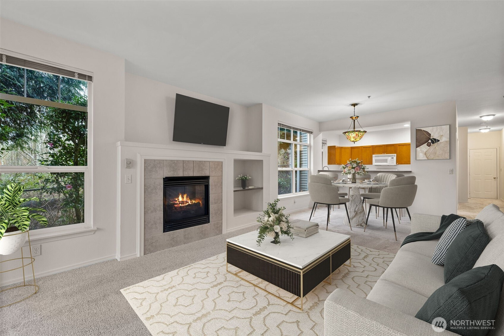Well maintained, desirable end unit opens onto a protected greenbelt of woods, ponds and wildlife. Private patio off living room is covered and has an outside storage closet. Spacious living room features built in bookcases, gas fireplace and dining area. Kitchen offers lots of cabinets and countertop work space. 9'ceilings and transom windows give the unit a spacious feel. 2nd bedroom for guest or office. Two baths, one off primary, one with tub. Large separate laundry room with washer/dryer. All appliances and window coverings included. Fresh paint and new carpet throughout. Single car garage attached allows secure entry into unit and provides additional storage space. The Woodlands is a well established community with a great clubhouse for large gatherings and a playground for little ones. Easy access location and bus service on 128th St. S.W. Don't miss this one!