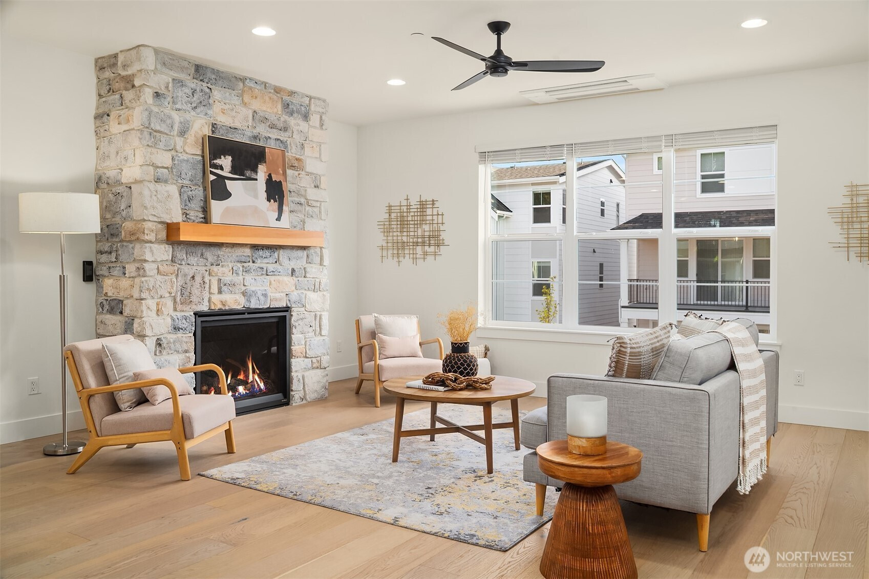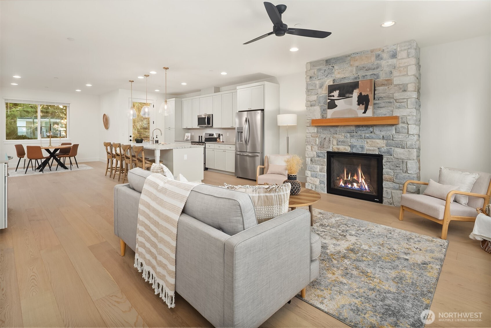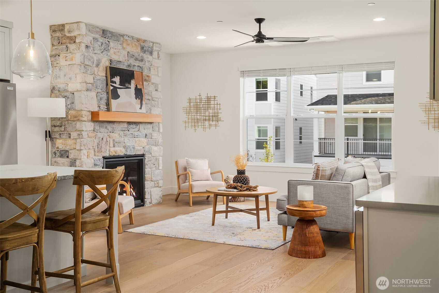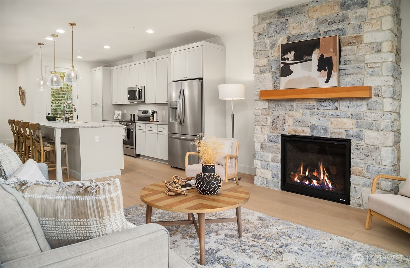 BUILDER INCENTIVES $50K rate buydown to 4.99%. Brand-new construction by Glen Eagle Homes, where modern farmhouse style meets a fresh coastal aesthetic. Thoughtfully designed with an open-concept main level, wide-plank hardwoods, and a gas fireplace wrapped in floor-to-ceiling stone. Expansive windows frame peekaboo views of the Cascades and fill the home with natural light, while the covered deck extends living outdoors year-round. The kitchen is built for gathering, featuring a large island with seating and storage, shaker-style Aristokraft cabinetry, buffet with wine storage and beverage fridge, plus a walk-in pantry. Stainless steel appliances complete the space. A main-level den and powder bath add flexibility. Upstairs, the generous primary suite offers a ¾ en-suite and walk-in closet. A versatile flex space can serve as a fourth bedroom, rec room with wet bar, or MIL setup. Ideal commuter location with easy access to everyday conveniences.
