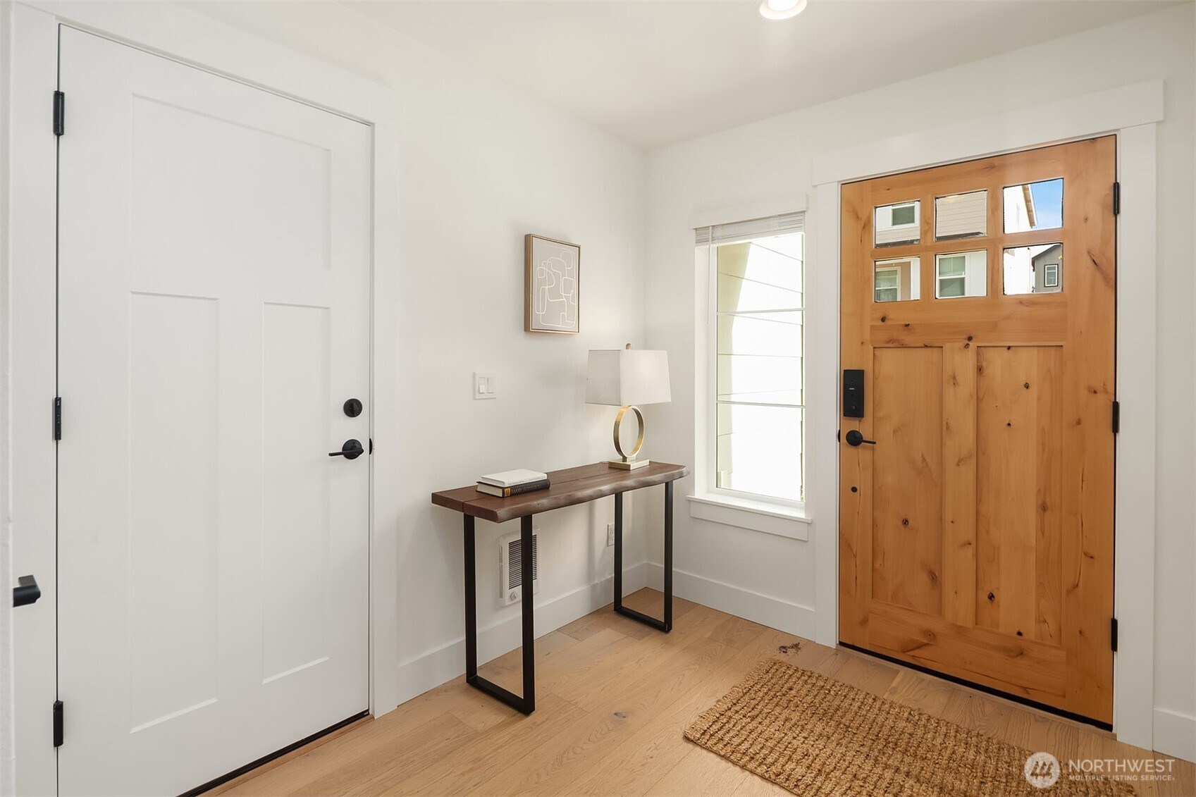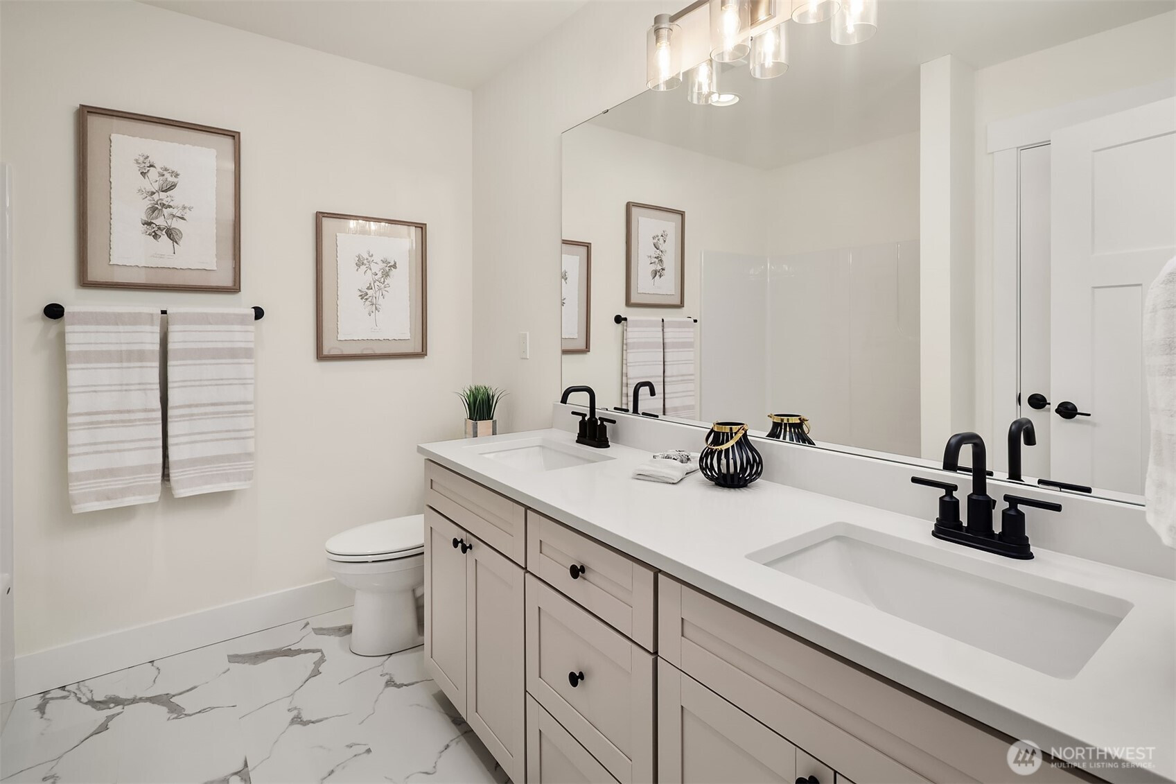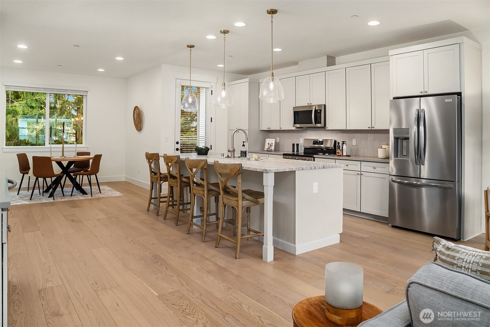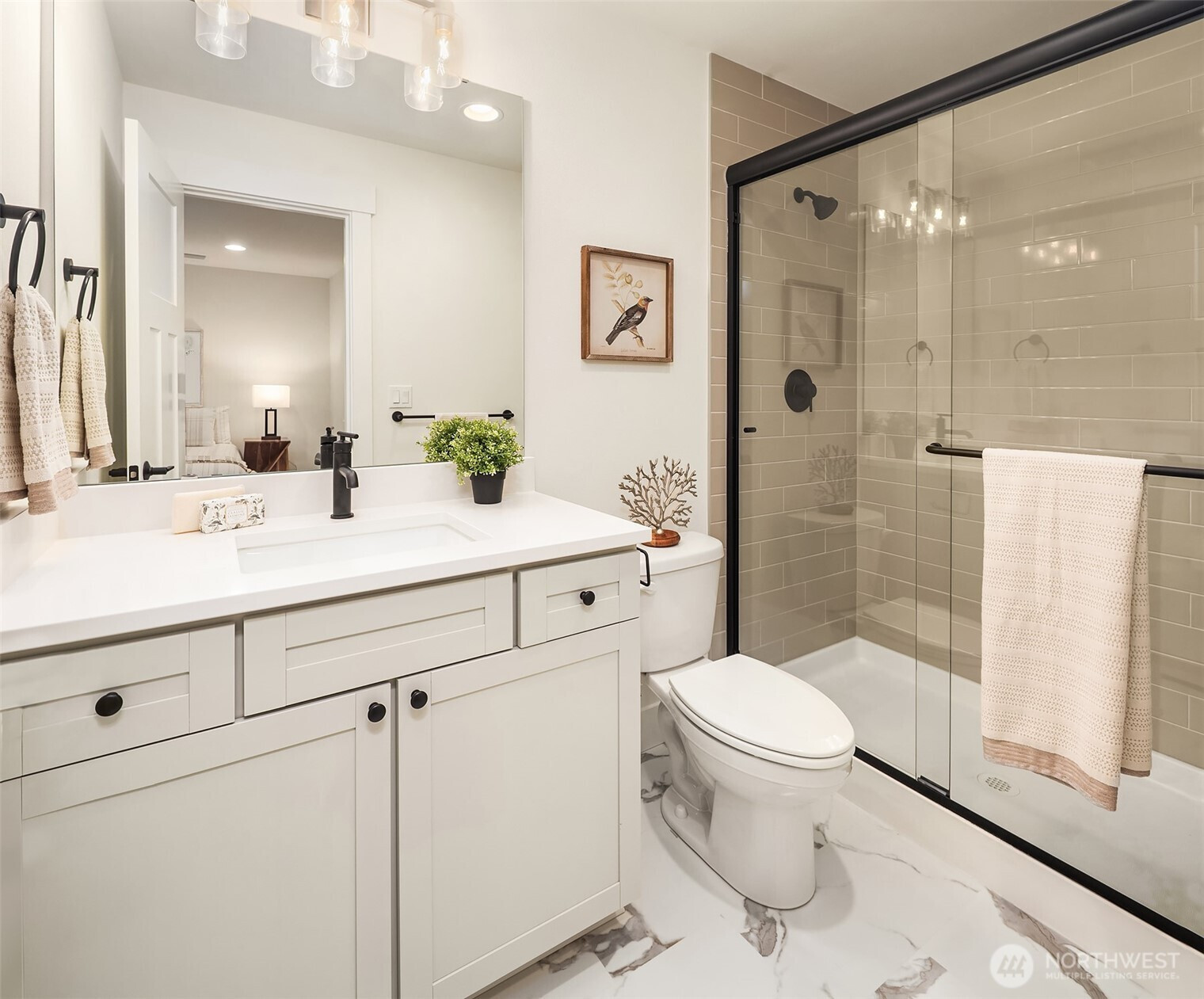 BUILDER INCENTIVES $50K rate buydown to 4.99%. Brand-new construction by Glen Eagle Homes, where modern farmhouse style meets a fresh coastal aesthetic. Thoughtfully designed with an open-concept main level, wide-plank hardwoods, and a gas fireplace wrapped in floor-to-ceiling stone. Expansive windows frame peekaboo views of the Cascades and fill the home with natural light, while the covered deck extends living outdoors year-round. The kitchen is built for gathering, featuring a large island with seating and storage, shaker-style Aristokraft cabinetry, buffet with wine storage and beverage fridge, plus a walk-in pantry. Stainless steel appliances complete the space. A main-level den and powder bath add flexibility. Upstairs, the generous primary suite offers a ¾ en-suite and walk-in closet. A versatile flex space can serve as a fourth bedroom, rec room with wet bar, or MIL setup. Ideal commuter location with easy access to everyday conveniences.