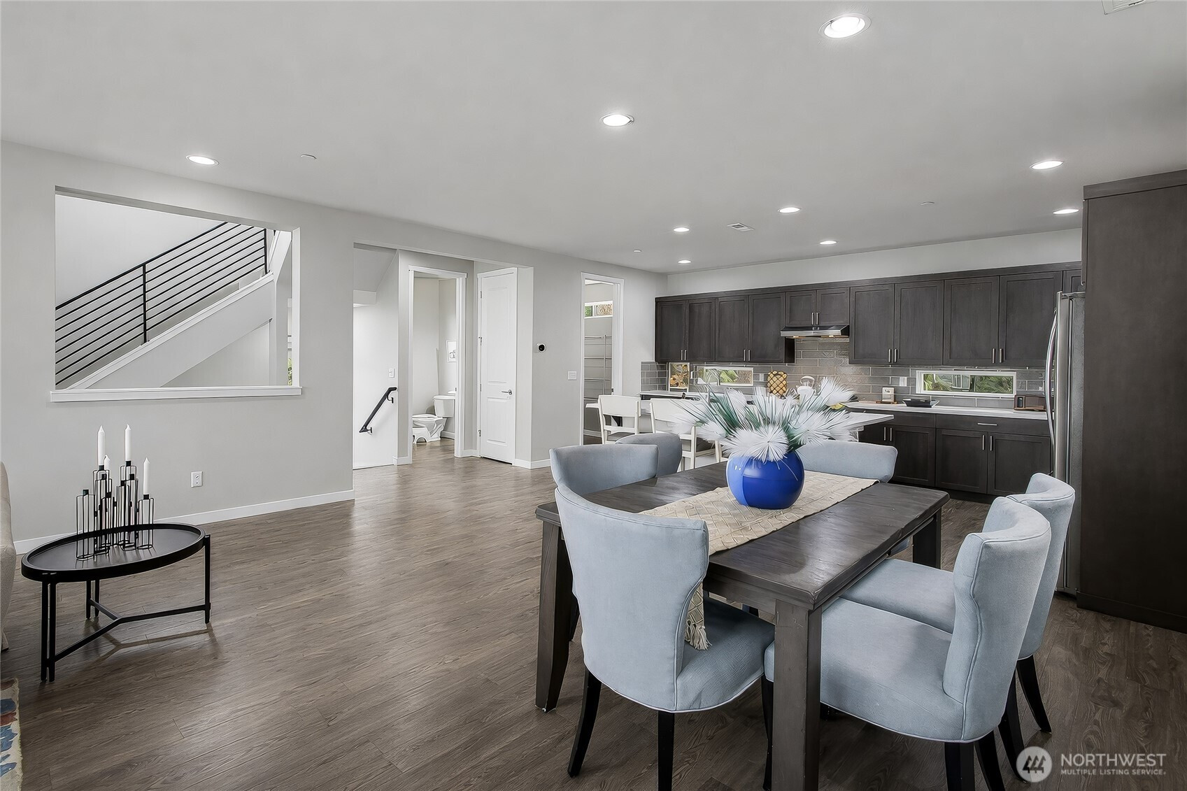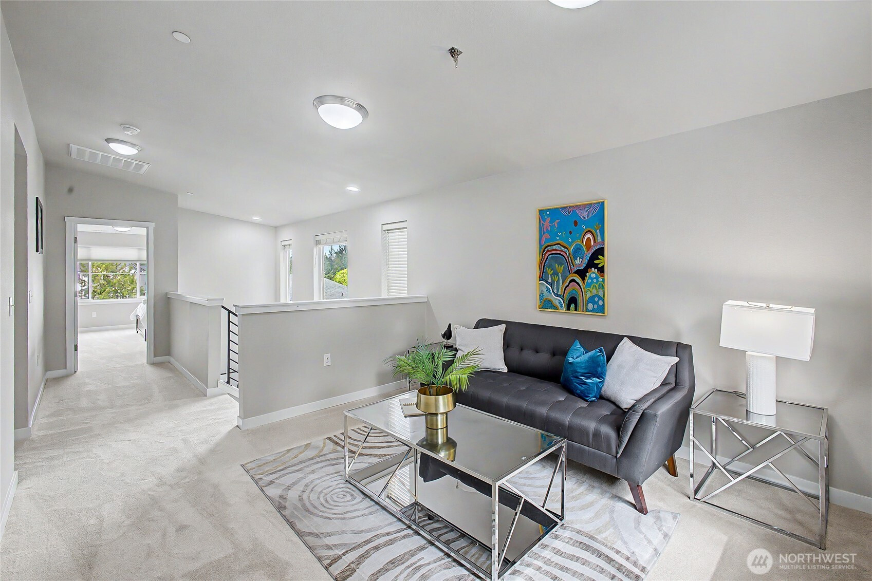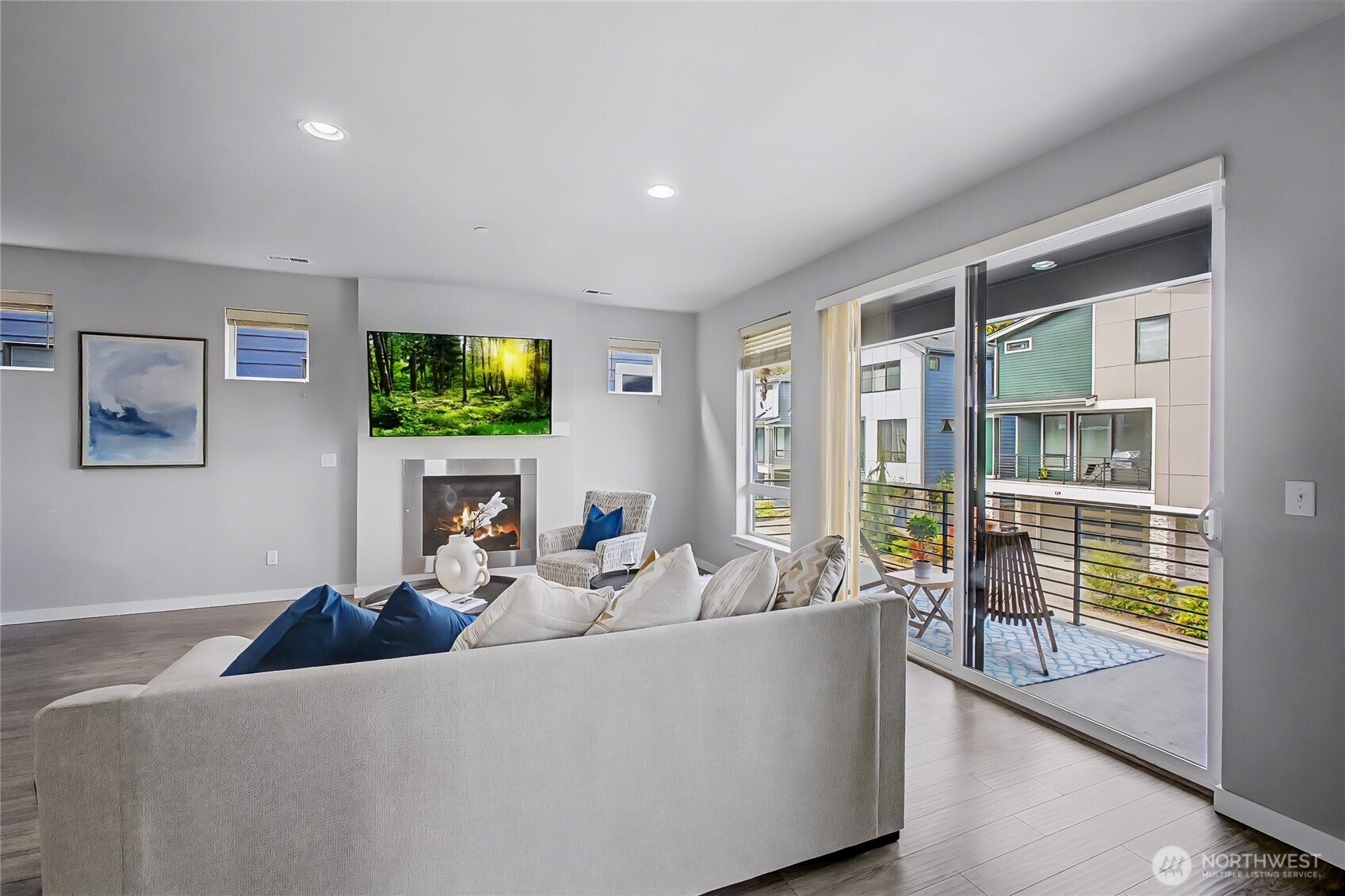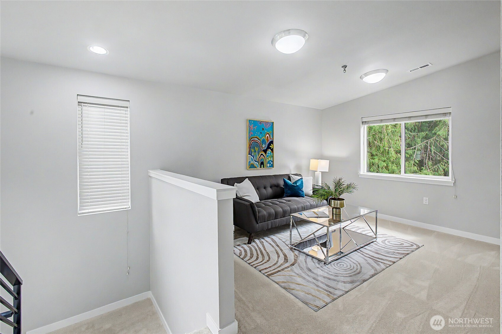 Welcome to this beautifully refreshed, move-in ready North-facing End home offering a versatile 3-story layout with 4 bedrooms, den/office, and loft. Filled with ample natural light, this thoughtfully designed home has room for everyone, including a private entry-level ensuite ideal for guests or multi-gen living. Fresh interior paint, new carpet, and LVP flooring create a crisp, modern feel, while A/C, fiber internet, Tesla EV charger, and tankless water heater add everyday comfort and convenience. The open-concept main level features a spacious kitchen with large island, pantry, stainless appliances, Gas Stove and seamless flow to the dining and living areas, with access to a covered outdoor space perfect for entertaining. Enjoy a fully fenced, low-maintenance yard plus neighboring community open space and park just beyond the fence for added room to gather and unwind. Oversized 2-car garage. Seller-provided 1-year home warranty adds peace of mind. Stylish, spacious, and ideally located in the sought-after Northshore School District—this is the one, Bring your OFFERS!