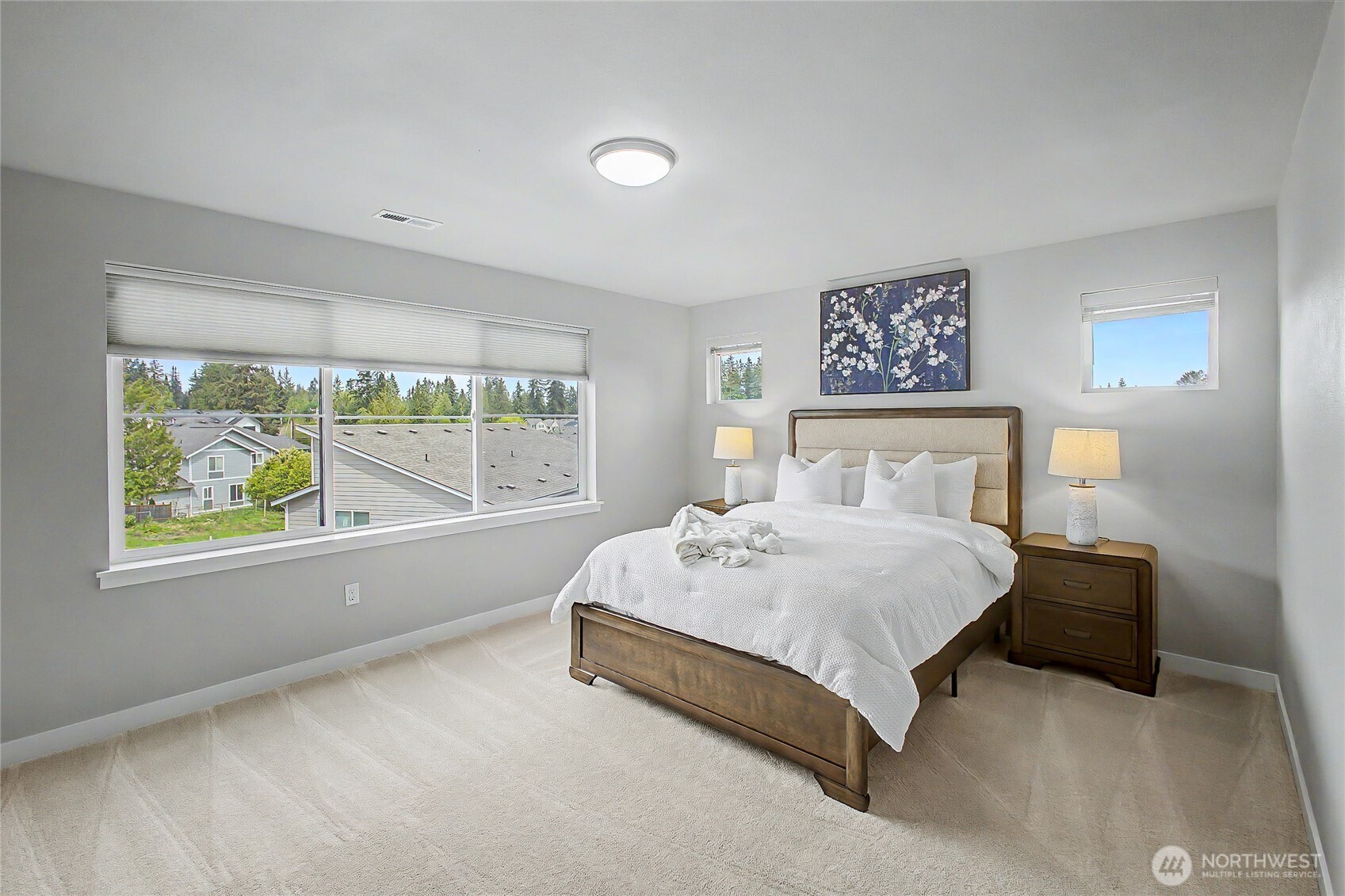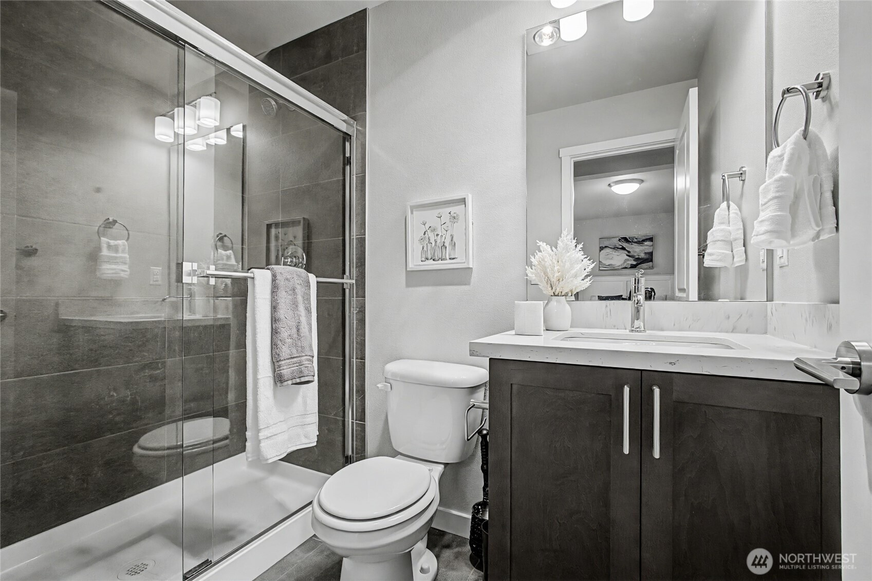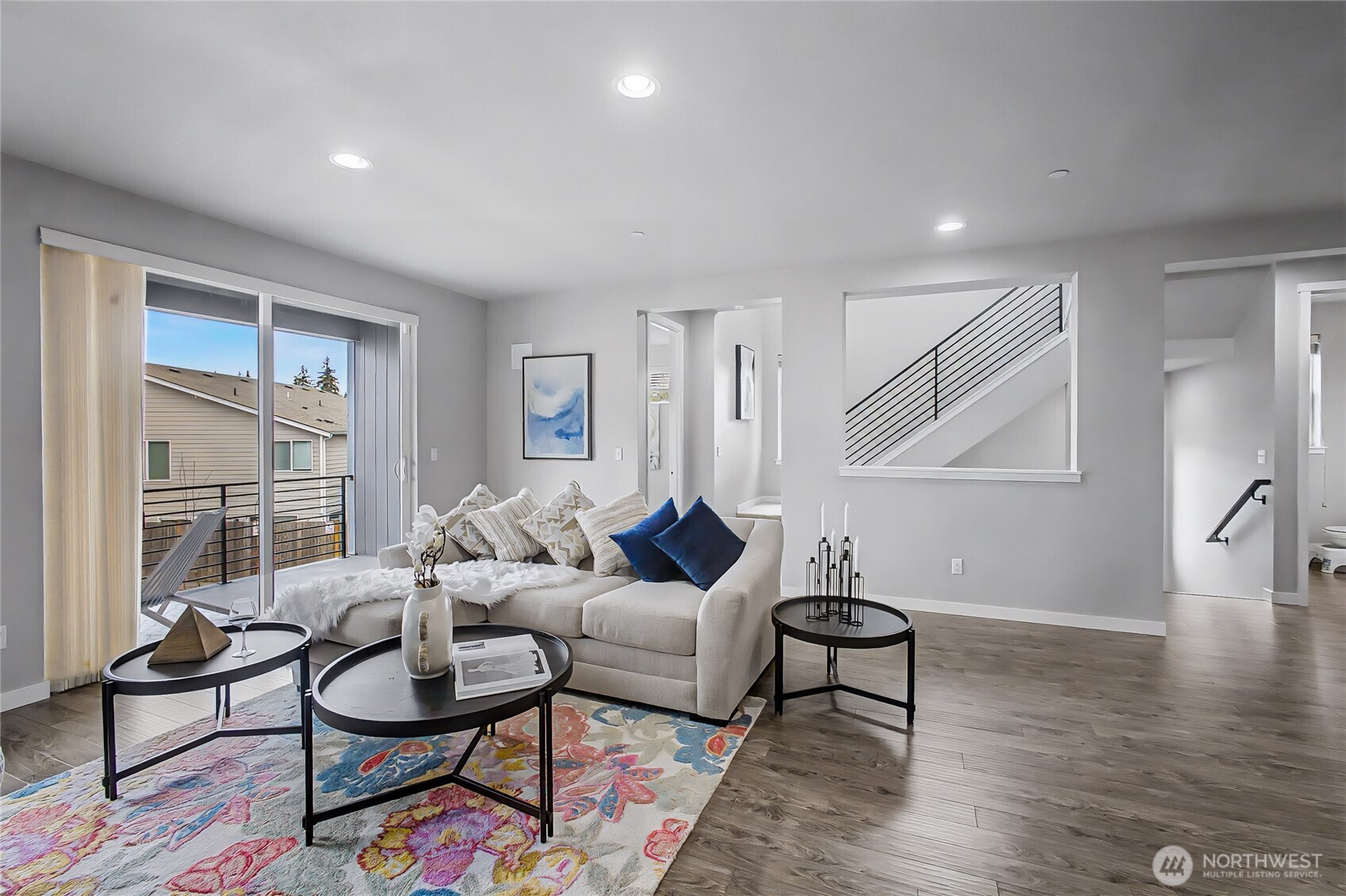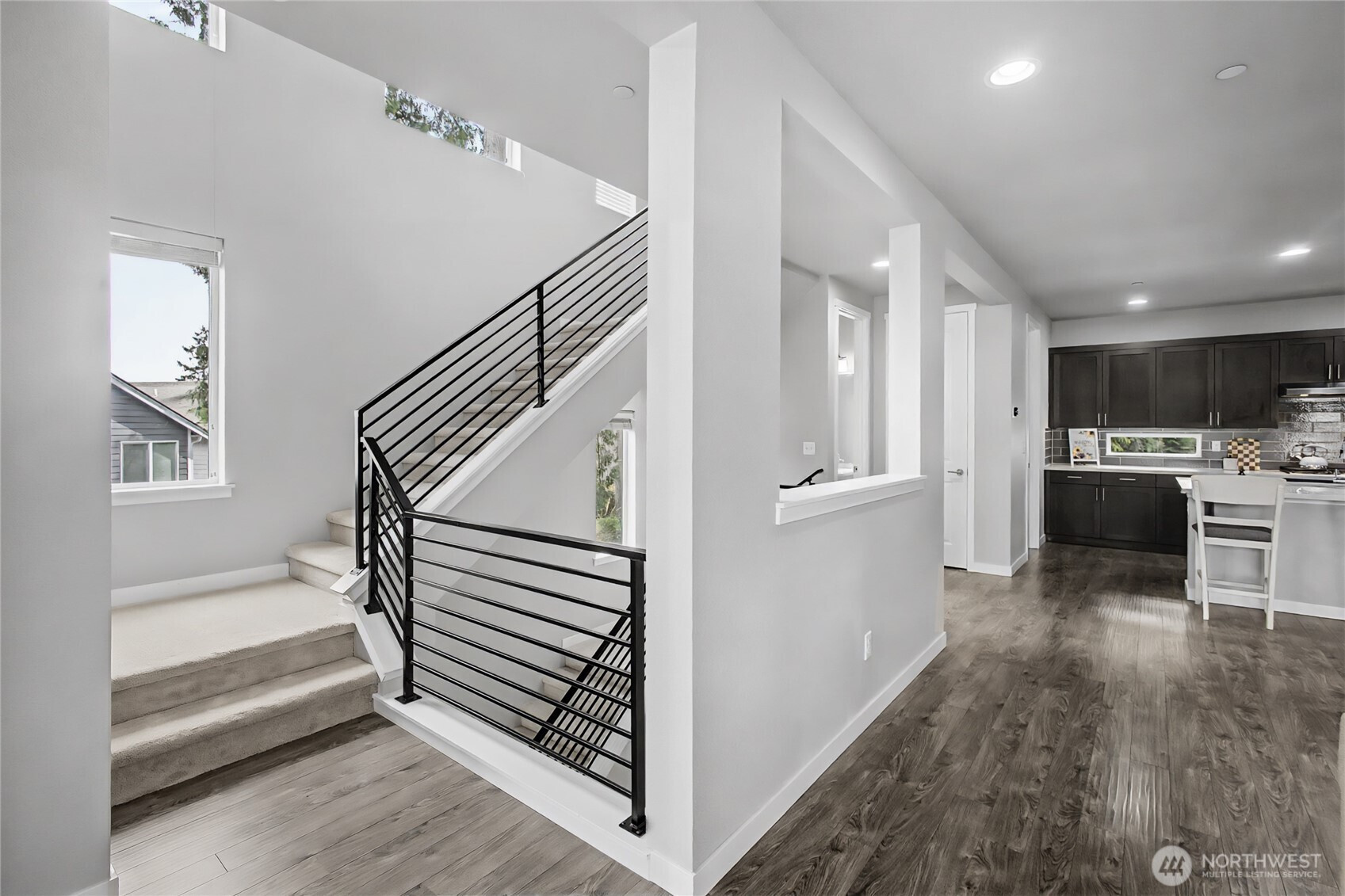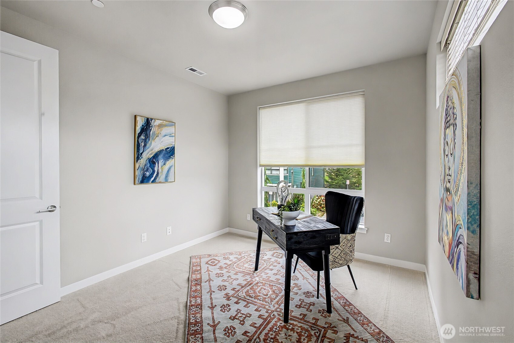 Welcome to this beautifully refreshed, move-in ready North-facing End home offering a versatile 3-story layout with 4 bedrooms, den/office, and loft. Filled with ample natural light, this thoughtfully designed home has room for everyone, including a private entry-level ensuite ideal for guests or multi-gen living. Fresh interior paint, new carpet, and LVP flooring create a crisp, modern feel, while A/C, fiber internet, Tesla EV charger, and tankless water heater add everyday comfort and convenience. The open-concept main level features a spacious kitchen with large island, pantry, stainless appliances, Gas Stove and seamless flow to the dining and living areas, with access to a covered outdoor space perfect for entertaining. Enjoy a fully fenced, low-maintenance yard plus neighboring community open space and park just beyond the fence for added room to gather and unwind. Oversized 2-car garage. Seller-provided 1-year home warranty adds peace of mind. Stylish, spacious, and ideally located in the sought-after Northshore School District—this is the one, Bring your OFFERS!