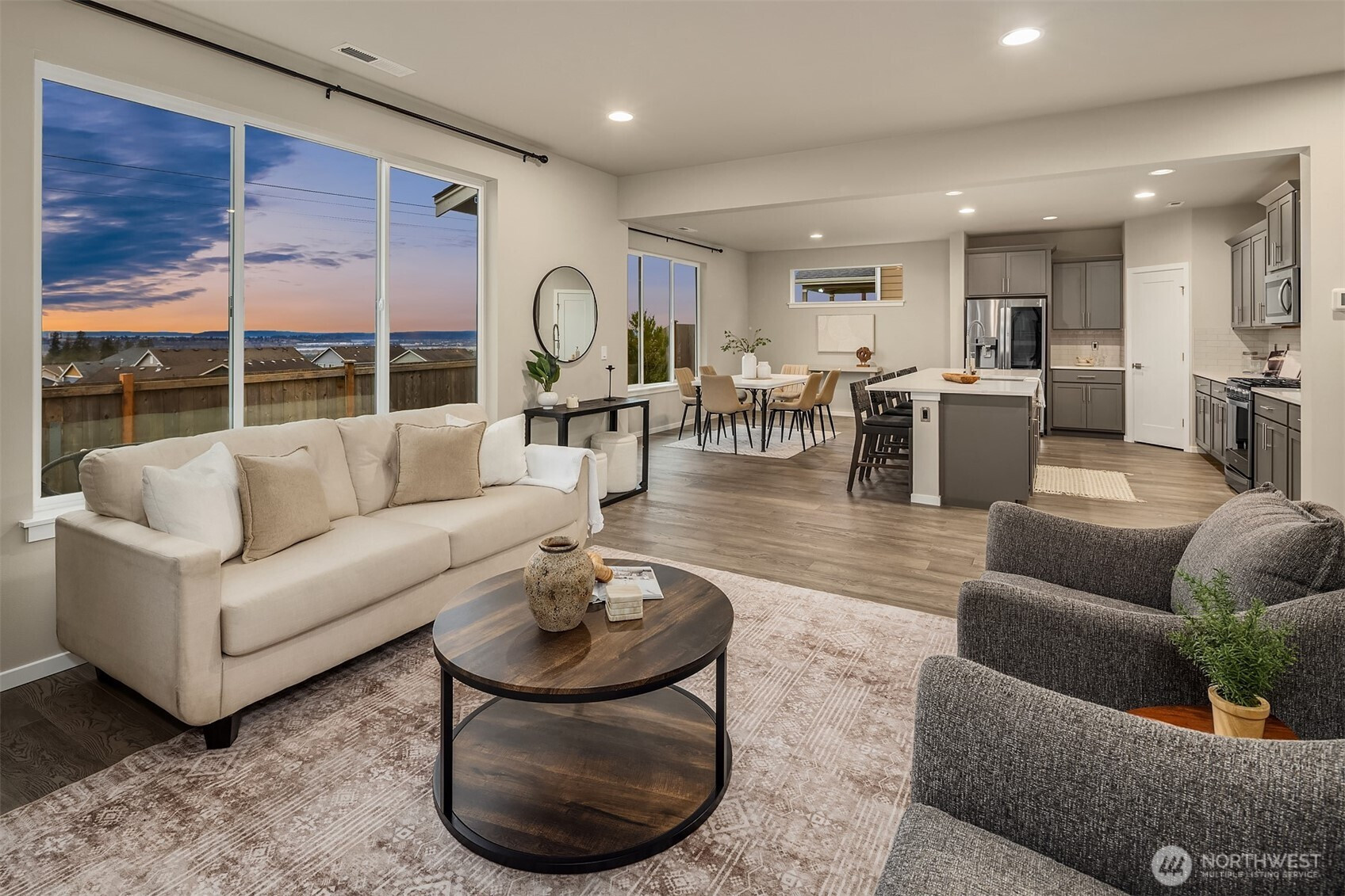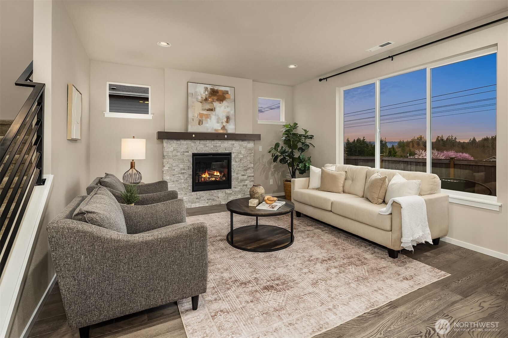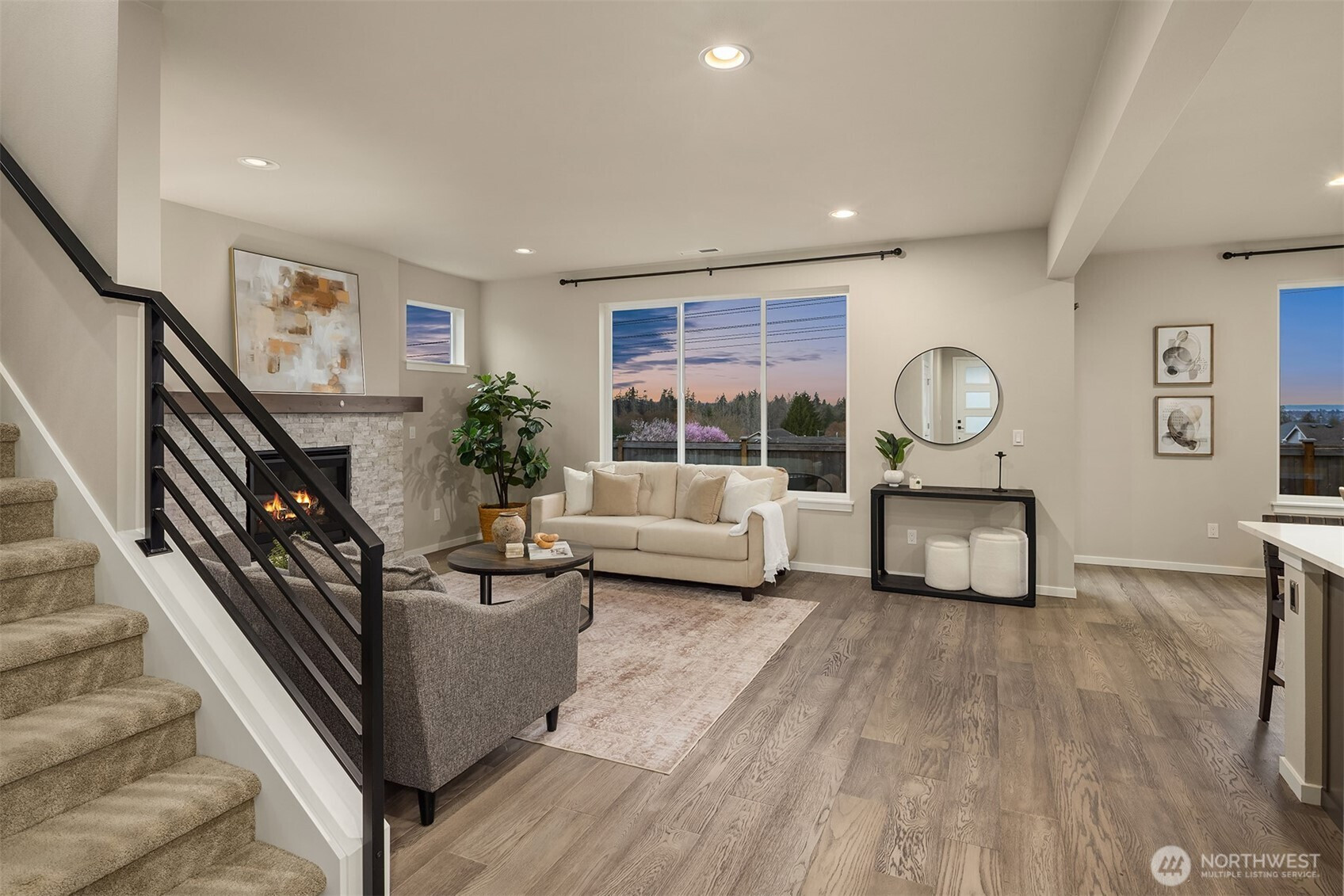 Welcome to Sunset Ridge, a sought-after Harbour Homes community built in 2021, offering sweeping views of the Puget Sound and Olympic Mountains. This meticulously maintained home blends comfort and style with LVP flooring, a gas fireplace, oversized windows framing breathtaking sunset views, quartz countertops, and stainless steel appliances. The sun-drenched dining area opens directly to the back deck, perfect for entertaining or quiet evenings at home. A main-floor bedroom with an adjoining three-quarter bath offers flexibility and convenience. Upstairs, enjoy a spacious bonus room, an expansive western-facing primary suite, and a spa-inspired 5-piece primary bath. Additional features include air conditioning, direct access to a nearby walking trail, and a prime location close to Highway 9, the trestle, and shopping at Costco, Target, and Haggen. Located within the Lake Stevens School District, this is a home that truly stands out.