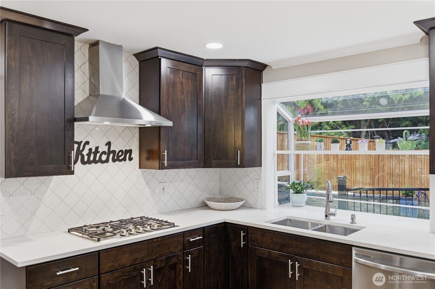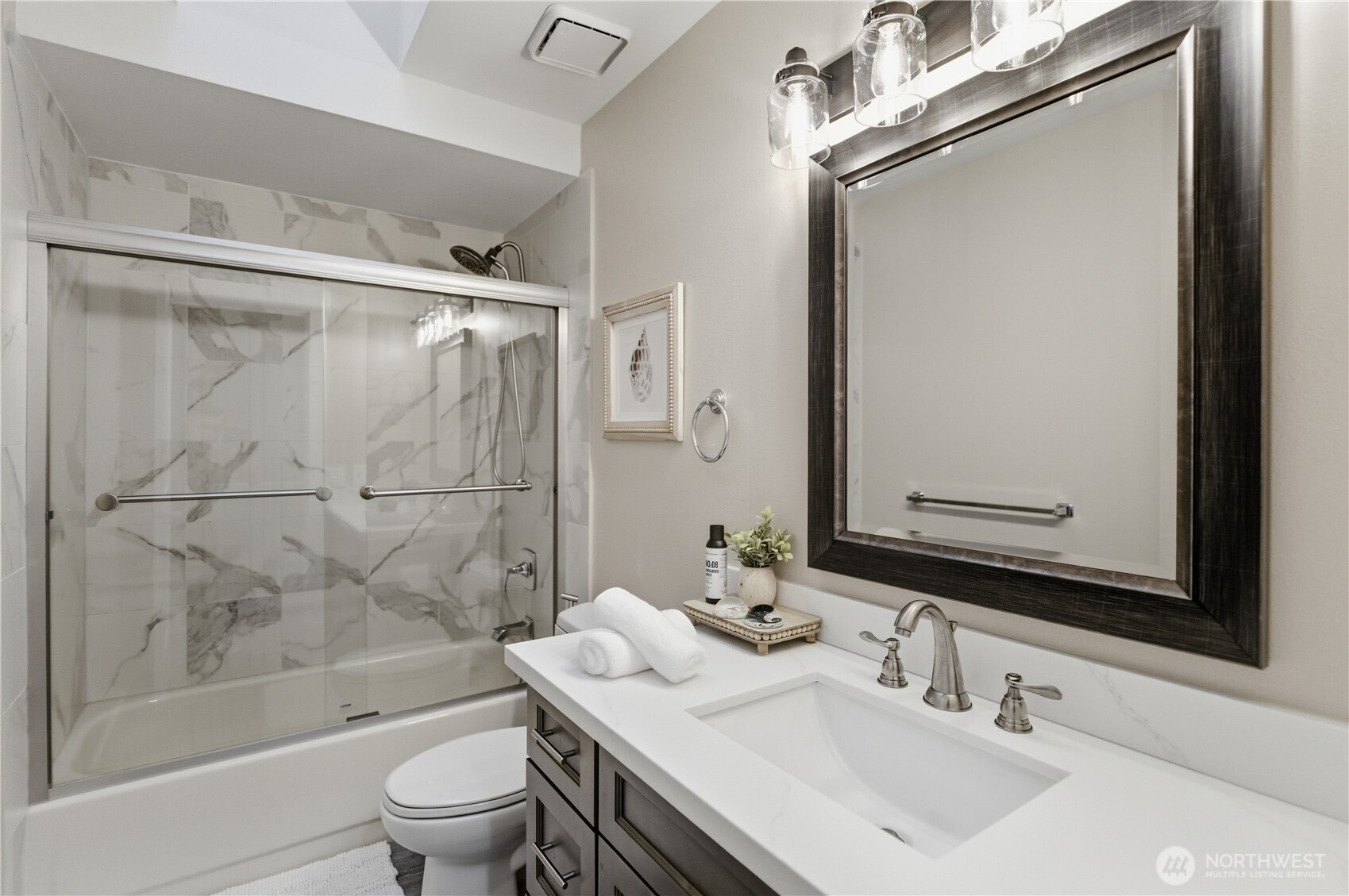 Better than new, completely updated home featuring modern finishes and an abundance of natural light throughout. High ceilings and multiple skylights create a bright and open atmosphere, while two beautiful fireplaces add warmth and charm to the living spaces. The stunning updated kitchen offers stylish cabinetry, quality countertops, and plenty of space for cooking and entertaining. The flexible floor plan includes a convenient main-floor bedroom that can serve perfectly as a guest suite or mother-in-law space. Step outside to enjoy the gorgeous landscaping and a private backyard retreat. The large deck is ideal for gatherings, while the fully finished backyard with elegant pavers provides a low-maintenance outdoor living area. A backyard shed offers additional storage for tools and equipment. The spacious primary suite is a true highlight, featuring a luxurious bathroom with double vanity, freestanding soaking tub, tiled walk-in shower, and a large walk-in closet. This move-in-ready home combines comfort, style, and functionality in a beautiful setting.