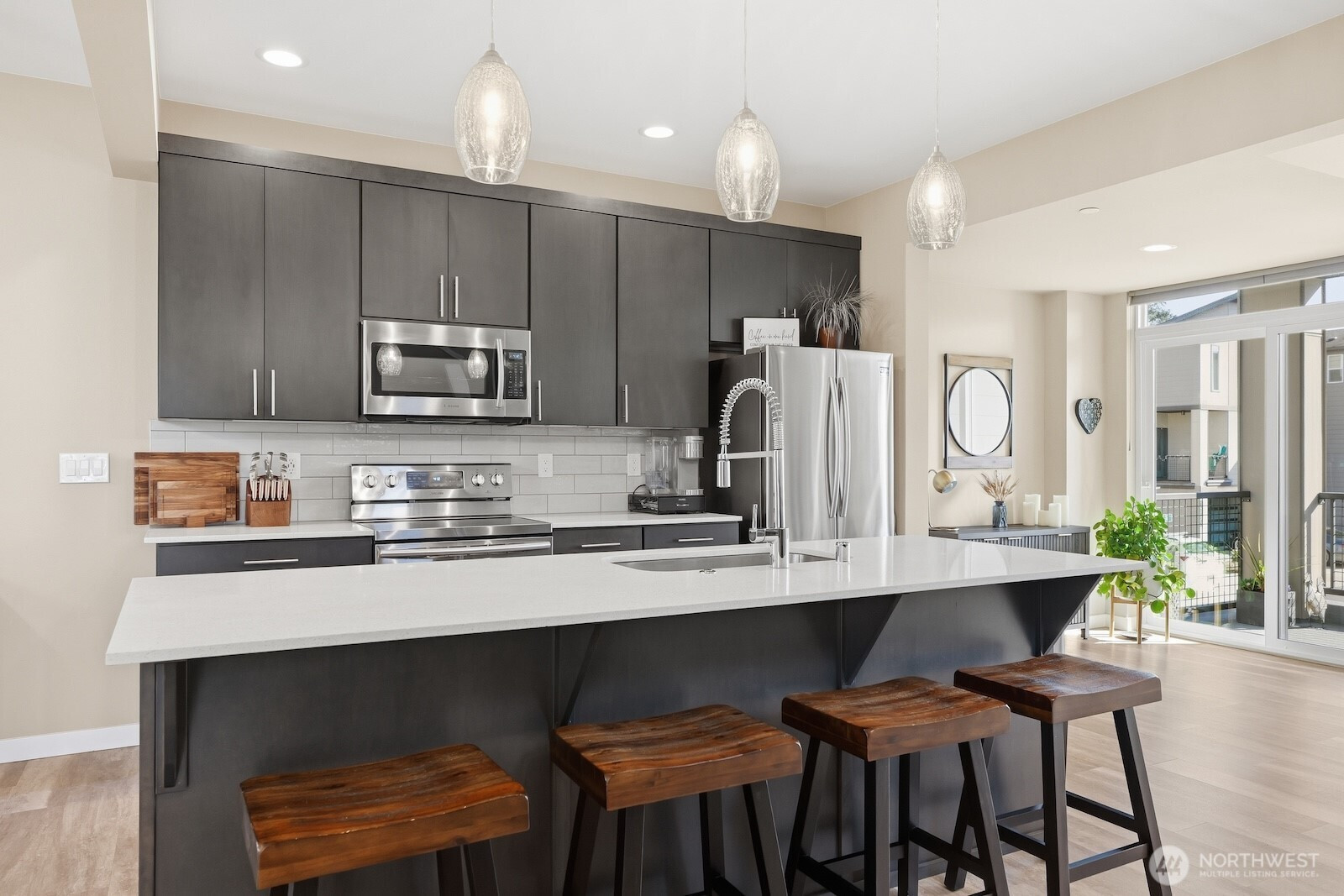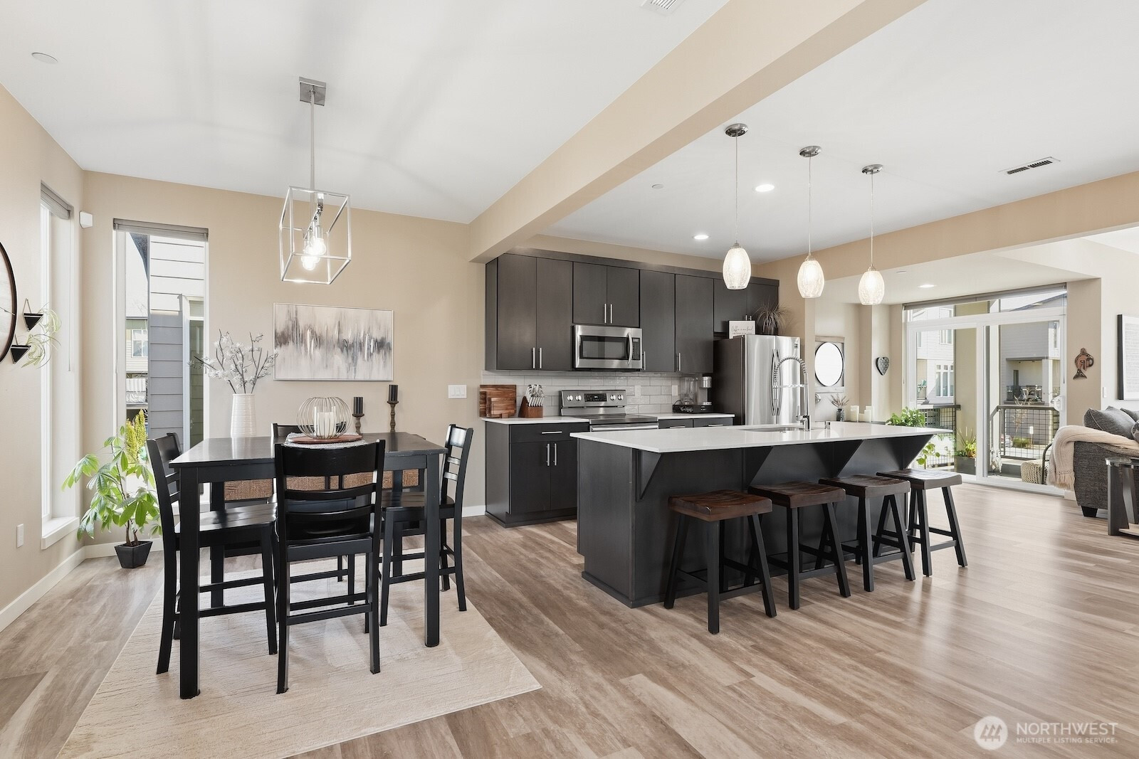 Like-new in Lynnwood! Welcome to Andoria, the park-like location you've been searching for, only moments away from all the amenities of both Lynnwood & Mill Creek! An open concept main level is light, bright & inviting, with abundant space for effortless day-to-day flow or hosting friend groups of any size. Luxe vinyl plank flooring sparkles in warm sunlight pouring in through floor-to-ceiling windows & a centerpiece fireplace creates cozy ambiance. Pull up a seat at the roomy island to watch the chef at work in the beautifully appointed kitchen, equipped w/ stainless steel appliances, quartz counters, full tile backsplash & abundant storage in sleek custom cabinetry. All 3 bedrooms are upstairs, including an impressively spacious primary suite complete w/ vaulted ceilings, a walk-in closet & an ensuite bath. Mini-splits provide efficient heat & A/C for year-round comfort. Extra-deep 2-car garage + 2 addl covered driveway spaces. Low-maintenance HOA w/ friendly neighbors, a playground, 20+ guest parking spaces, & well-kept grounds. Easy access to bus lines, freeways, light rail & park-n-ride for a low-stress commute in any direction. Shopping, dining, groceries, beloved Martha Lake Park & all the amenities of Alderwood & Mill Creek are at your doorstep. Lynnwood is blossoming into Snohomish County's destination for culture & connection; turn the key, move in & become a part of it!