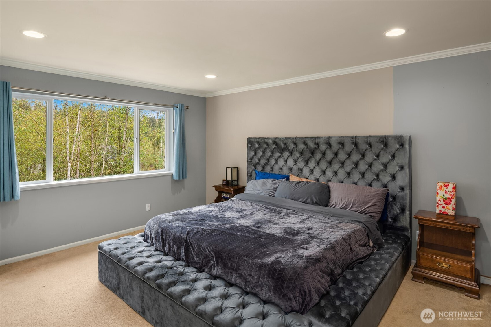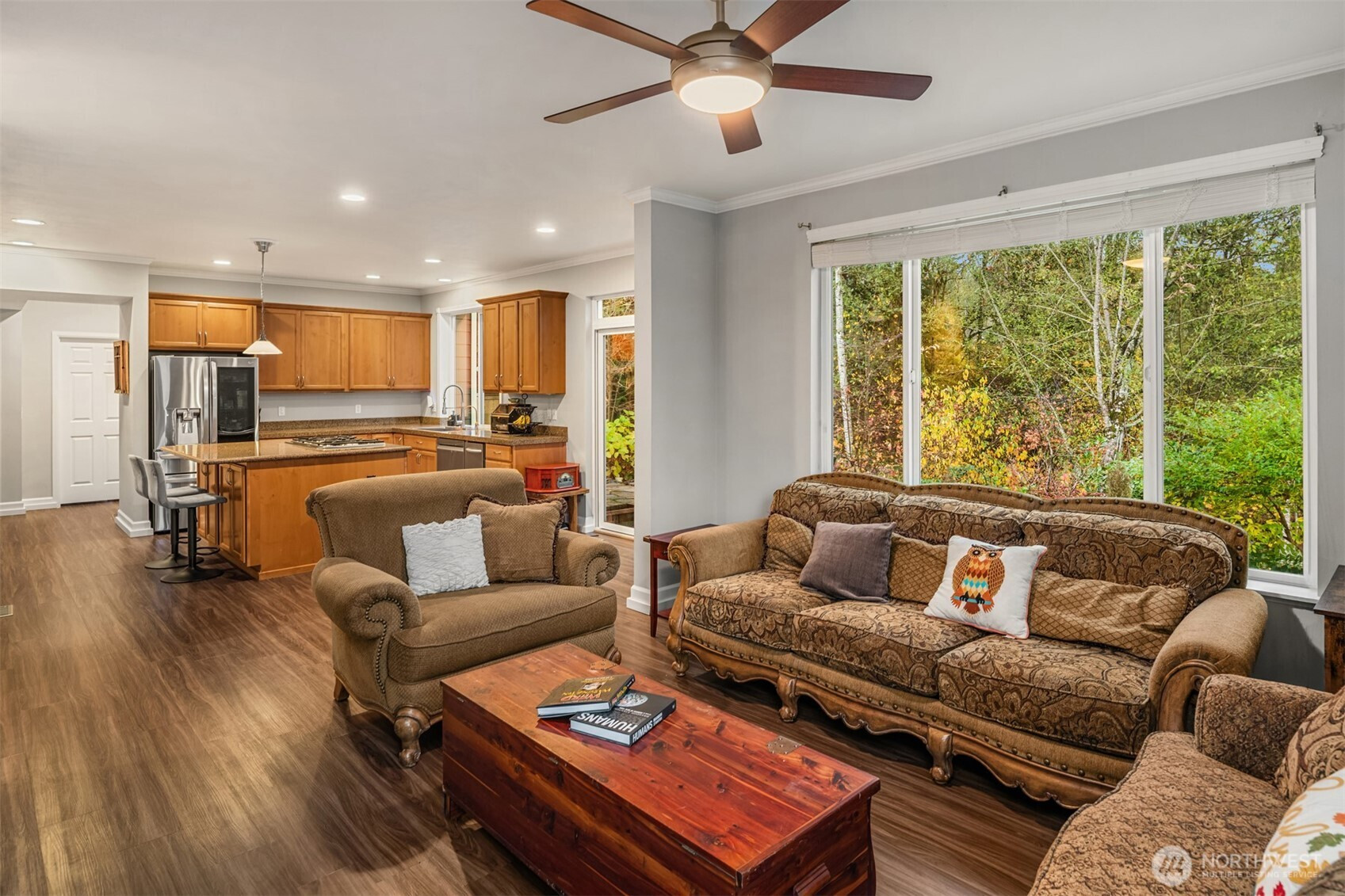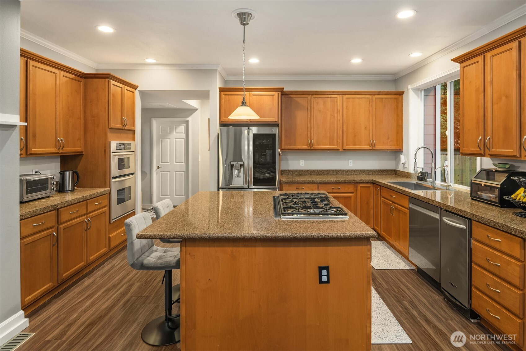 Discover what Greenleaf at Snohomish Cascade has to offer. Over 1/3 acre, corner lot, backing to a greenbelt, with 2 separate fully fenced yards, sprinkler system, and shed. This 4 bed/3 full bath home features a formal living space, dining, living and bonus room that could be converted to a massive bedroom for multigenerational living. This home caters for all lifestyles. The main floor has LVP and crown molding throughout with wainscoting in the dining and formal living room. The kitchen has granite counters, stainless appliances, double oven, gas stove and island with bar seating. The upper level has 3 bedrooms, an office and primary suite with 5-piece bath and large walk-in closet. Snohomish schools, close to hwy 9 & downtown Snohomish.