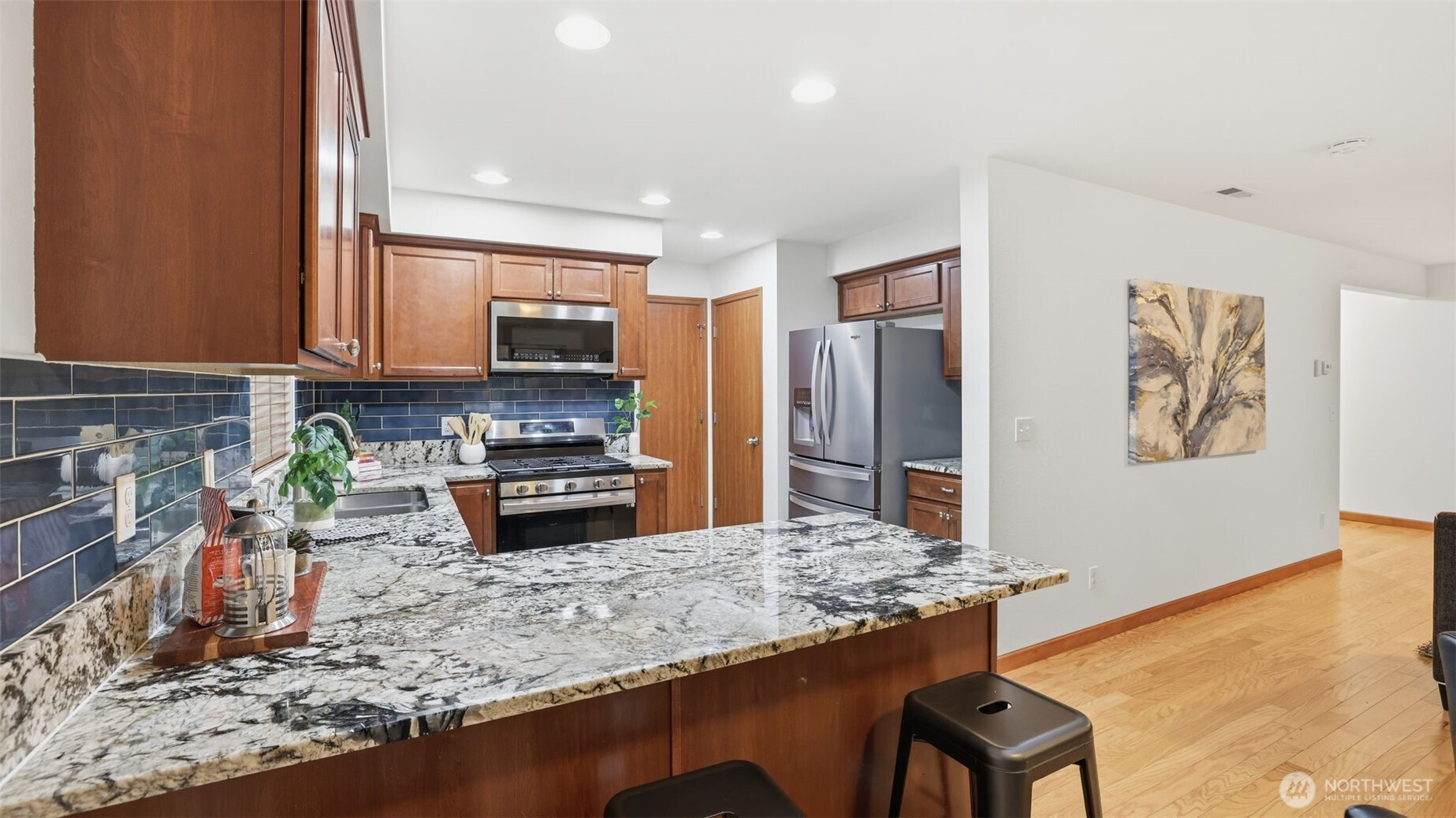 Turnkey & Beautifully Updated Home! Gorgeous 4-bdrm, 2.5-bath home w/ spacious loft/rec room, perfectly situated at the end of a quiet cul-de-sac. Open-concept main floor features a spacious great room & kitchen w/ granite slab countertops, eat up bar, gas range, & walk-in pantry. Enjoy hardwoods in entry & great room, new kitchen flooring, carpet, & fresh paint throughout. Vaulted primary suite offers a stunning remodeled bath & large walk-in closet. Step outside to your fully fenced backyard oasis, complete w/ deck, patio, low-maintenance landscaping & turf. Newer water heater (11/2023), roomy 3 car garage, & convenient guest parking. Excellent location near Boeing, I-5, I-405, & local park & ride options-minutes from shopping & dining!