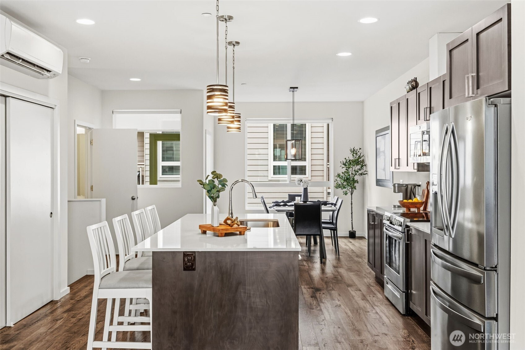 Better than new 4-bedroom townhome in Lynnwood’s highly desirable Westbrook community! Tucked away on a quiet dead-end street near Lake Stickney, this light-filled modern home offers stylish, low-maintenance living with a functional open-concept design, tall ceilings, and a spacious feel throughout. The kitchen is ideal for entertaining, featuring quartz countertops, stainless steel appliances, and an oversized island. Enjoy refined finishes, plank flooring, and a covered deck just off the dining area. The primary suite includes an en-suite bath, while the lower level offers a versatile fourth bedroom or office with access to the fully fenced backyard. A/C in the living room and primary bedroom provides added comfort. Complete with a large tandem 2-car garage, low HOA dues, and a convenient location near Alderwood Mall, Costco, Mill Creek Town Center, I-5, 405, park & ride, and light rail.