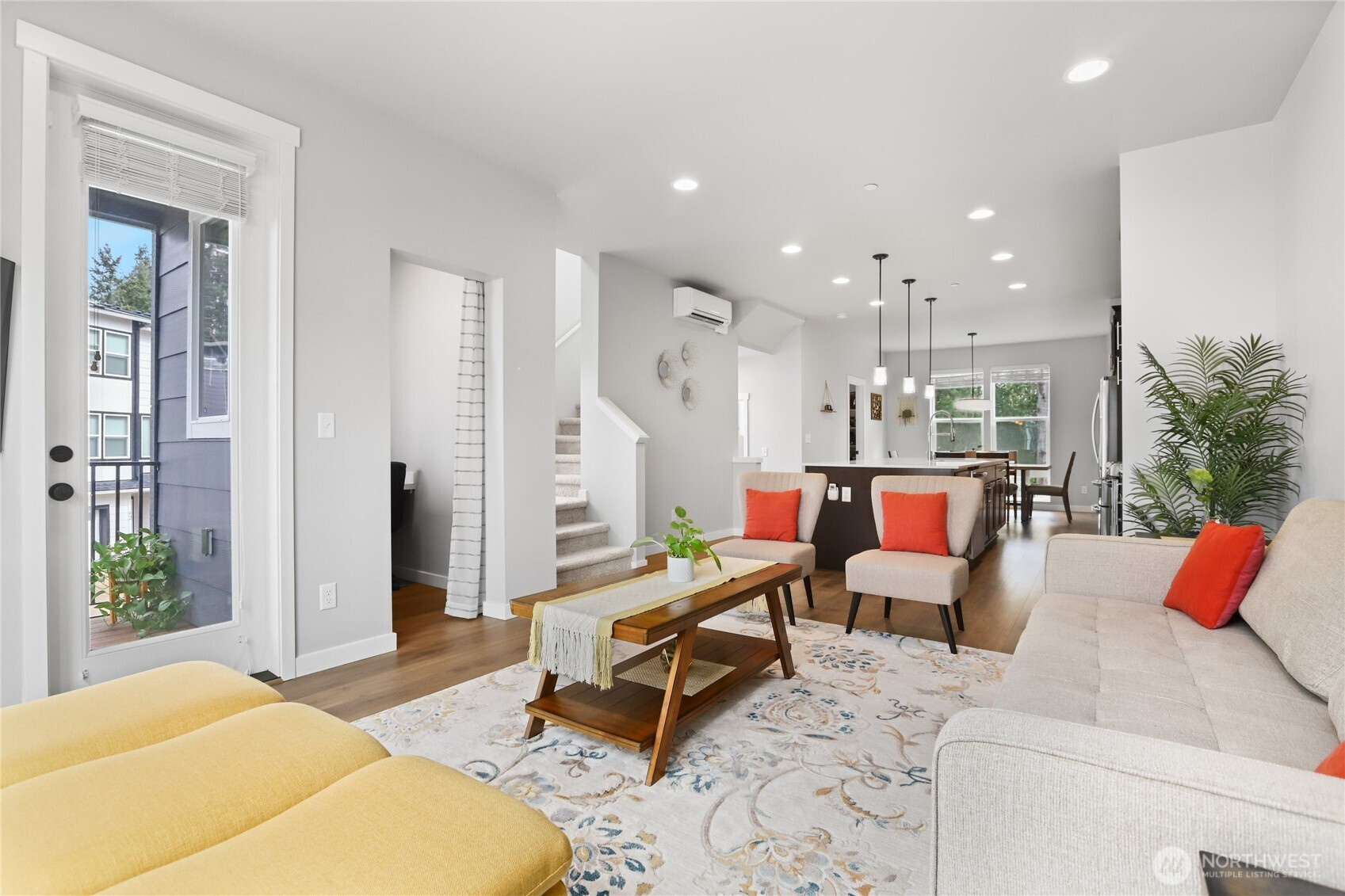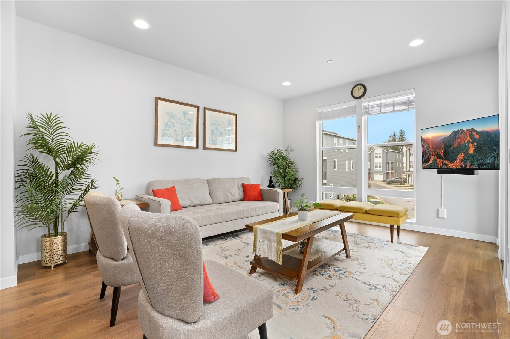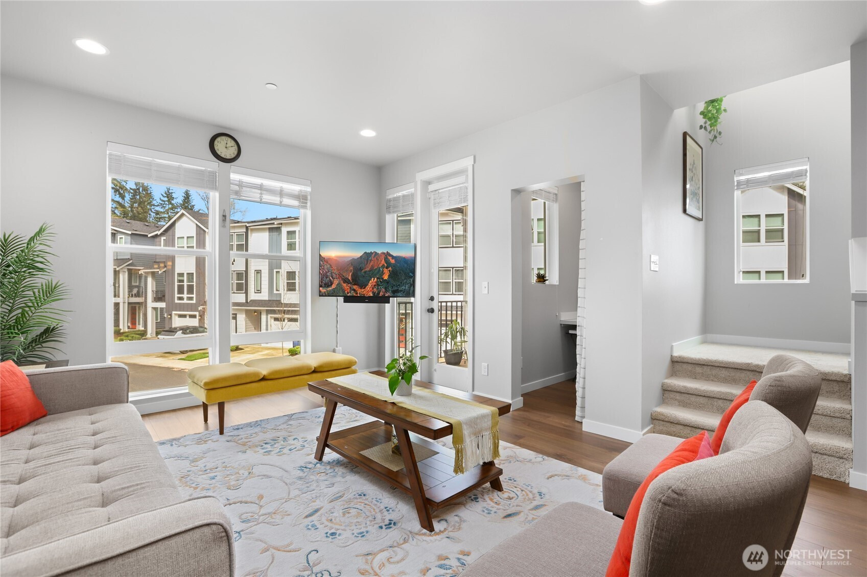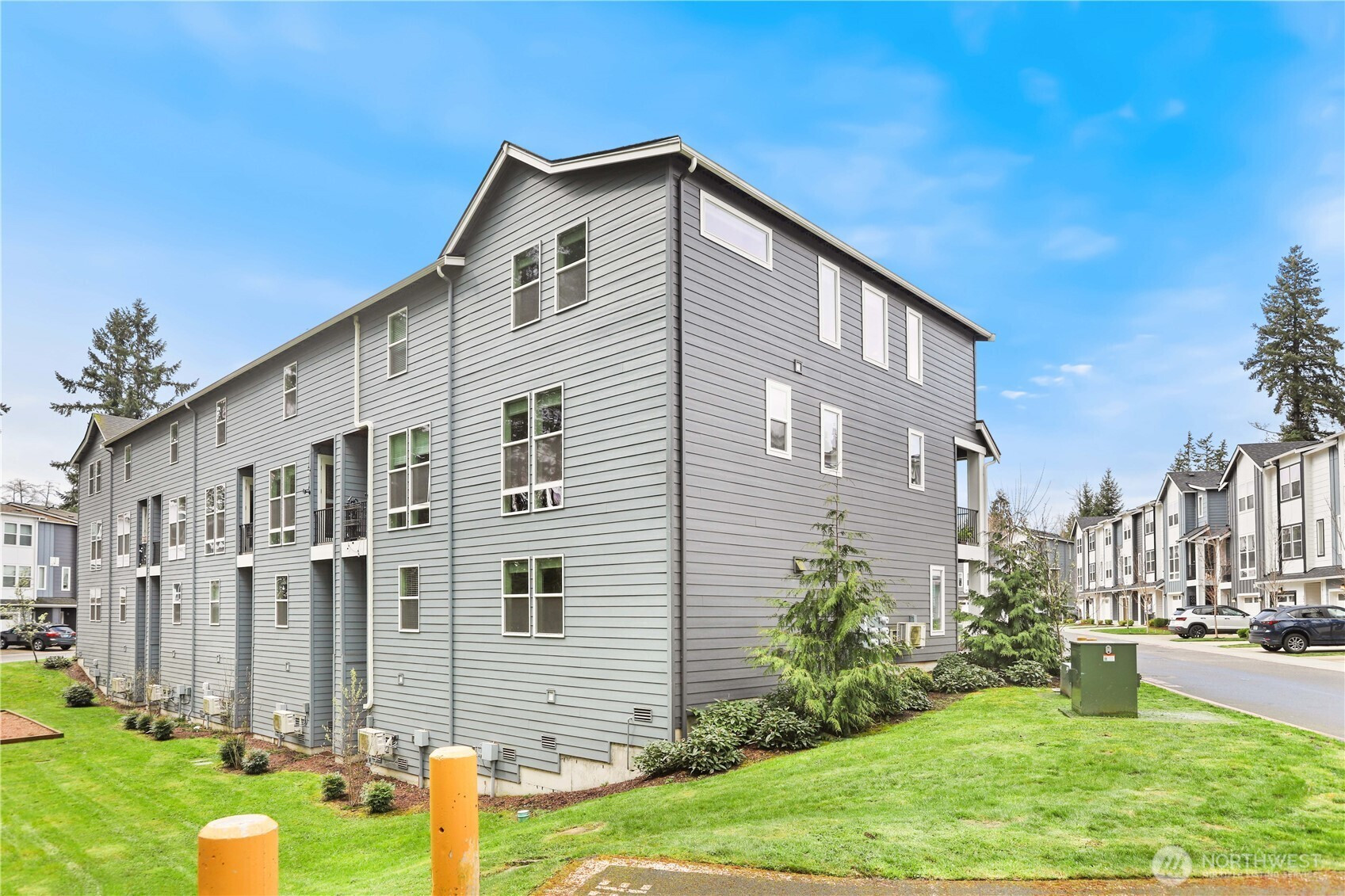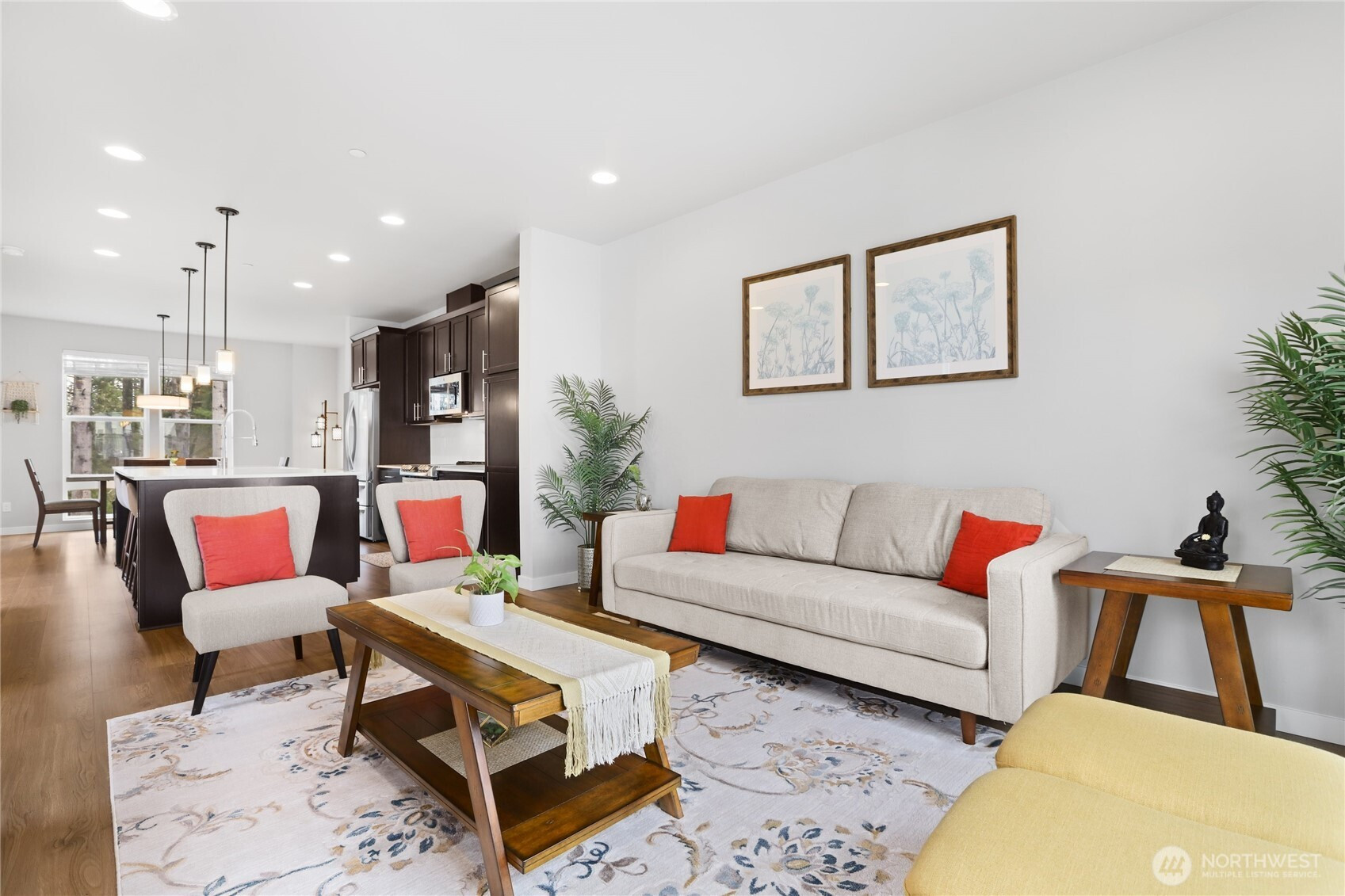 Welcome to Ladera, where refined design meets peaceful surroundings. Built in 2021, this premier end-unit residence offers exceptional privacy, backing to a protected greenbelt that creates a serene, nature-filled backdrop. The expansive 2,061 sq ft Allyn plan showcases 4 bedrooms and 3 baths, thoughtfully curated with elevated finishes and timeless style. Step inside to discover rich laminate hardwood flooring, modern finishes, beautifully appointed chef’s kitchen featuring striking quartz countertops paired with elegant dark wood cabinetry—offering both warmth and sophistication. The lower level presents a private bedroom with an en-suite bath, ideal for guests, a refined home office, or multigenerational living. The main level is designed for effortless entertaining, with a seamless open-concept layout connecting the kitchen, dining area, and great room, all flowing onto a private deck overlooking the tranquil greenbelt. Upstairs, the luxurious primary suite serves as a true retreat, complete with a spacious walk-in closet and a spa-inspired bath featuring and fully tiled shower. Two additional bedrooms, a full bath, and conveniently located laundry complete the upper level. Perfectly positioned in the heart of Lynnwood, this home offers quick access to major highways, upscale shopping, dining, and everyday conveniences. This home delivers a sophisticated and turnkey lifestyle tailored for modern living.