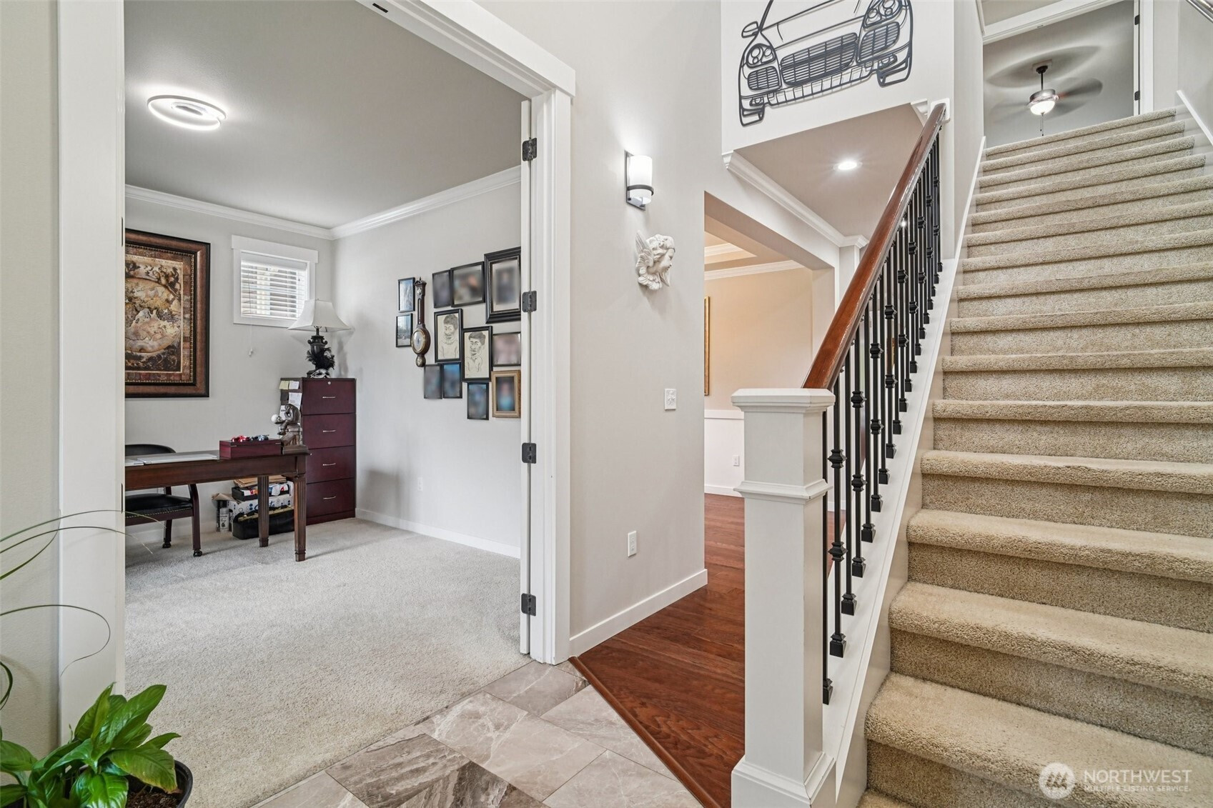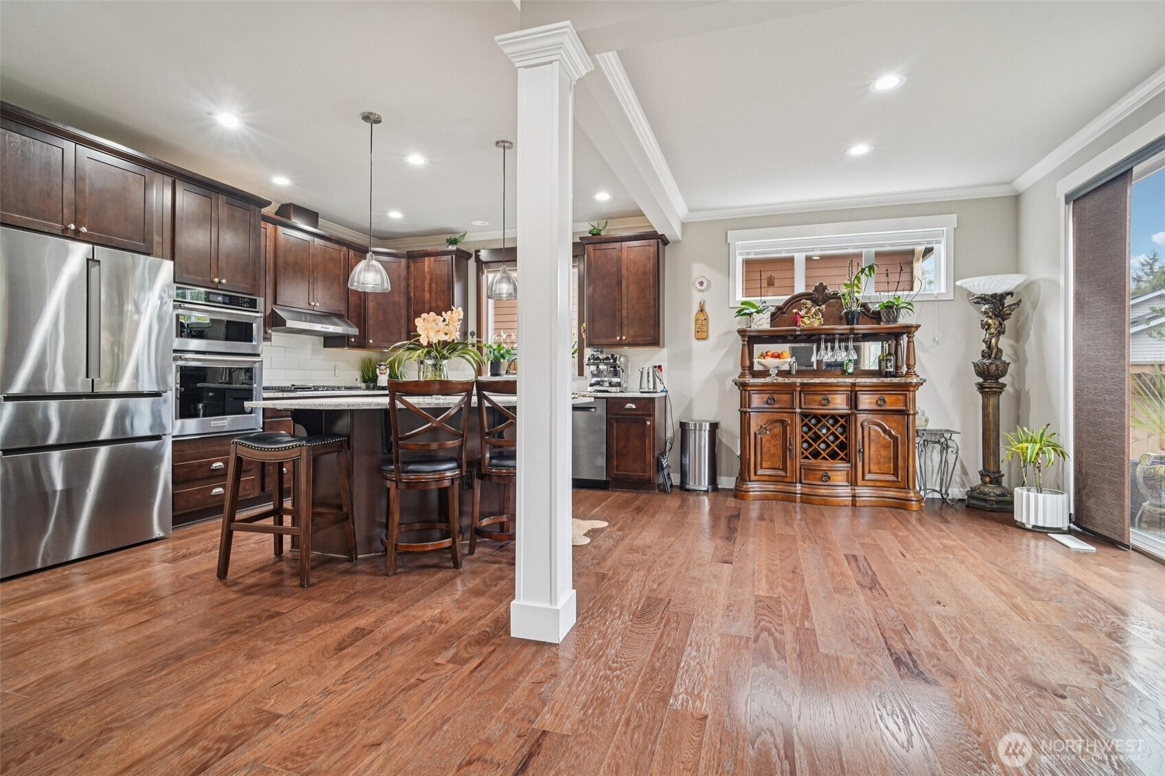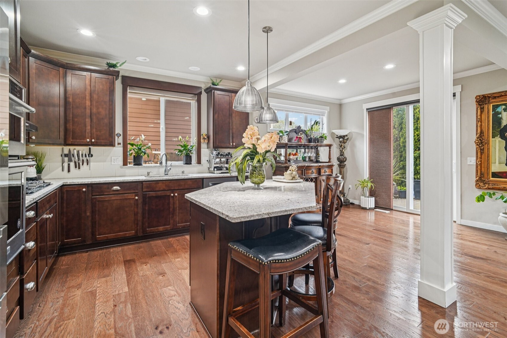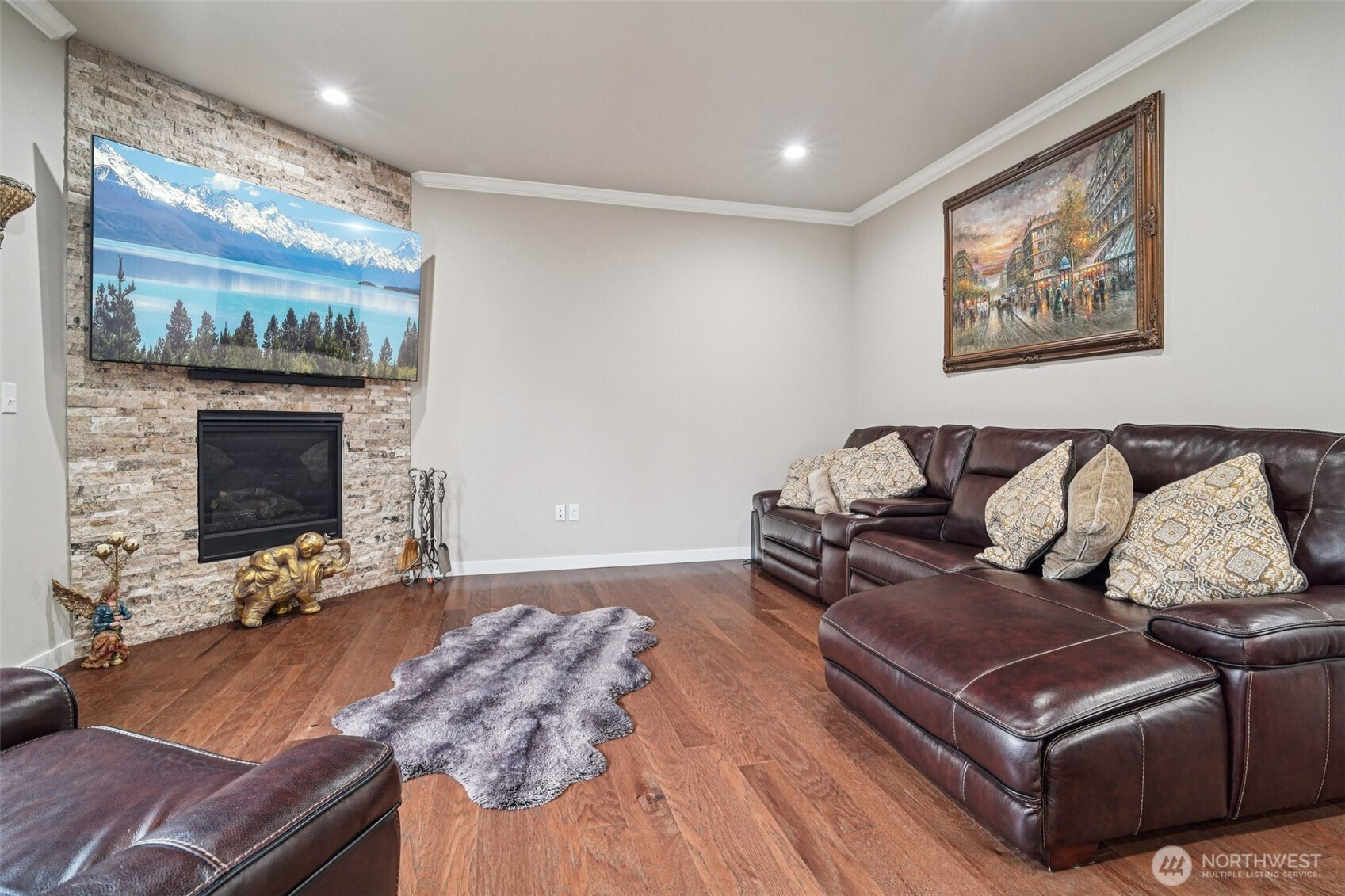Welcome to this beautifully appointed home in the sought-after Azi Lee Estates subdivision, where thoughtful design meets everyday comfort. The gourmet kitchen is a standout feature, offering slab granite counters, a spacious center island, custom cabinetry, stainless steel appliances, and a generous walk-in pantry, perfect for both daily living and entertaining. The inviting family room showcases a striking stone surround fireplace, creating a warm and stylish gathering space. This home offers 4 bedrooms and 2 3/4 baths, including a luxurious primary suite with a five-piece bath and a walk-in closet designed for convenience. A main floor den with crown molding, double door entry, and an adjacent 3/4 bath provides flexibility for work or relaxation. Timeless wainscotting and an elegant formal dining room add charm and sophistication for gatherings. Upstairs, a large bonus room features a built-in desk and hutch, ceiling fan, and hardwood flooring. Additional highlights include a tankless water heater and a fully landscaped yard ready to enjoy. Located within the Mukilteo School District, this home blends style, comfort, and functionality in a desirable setting.