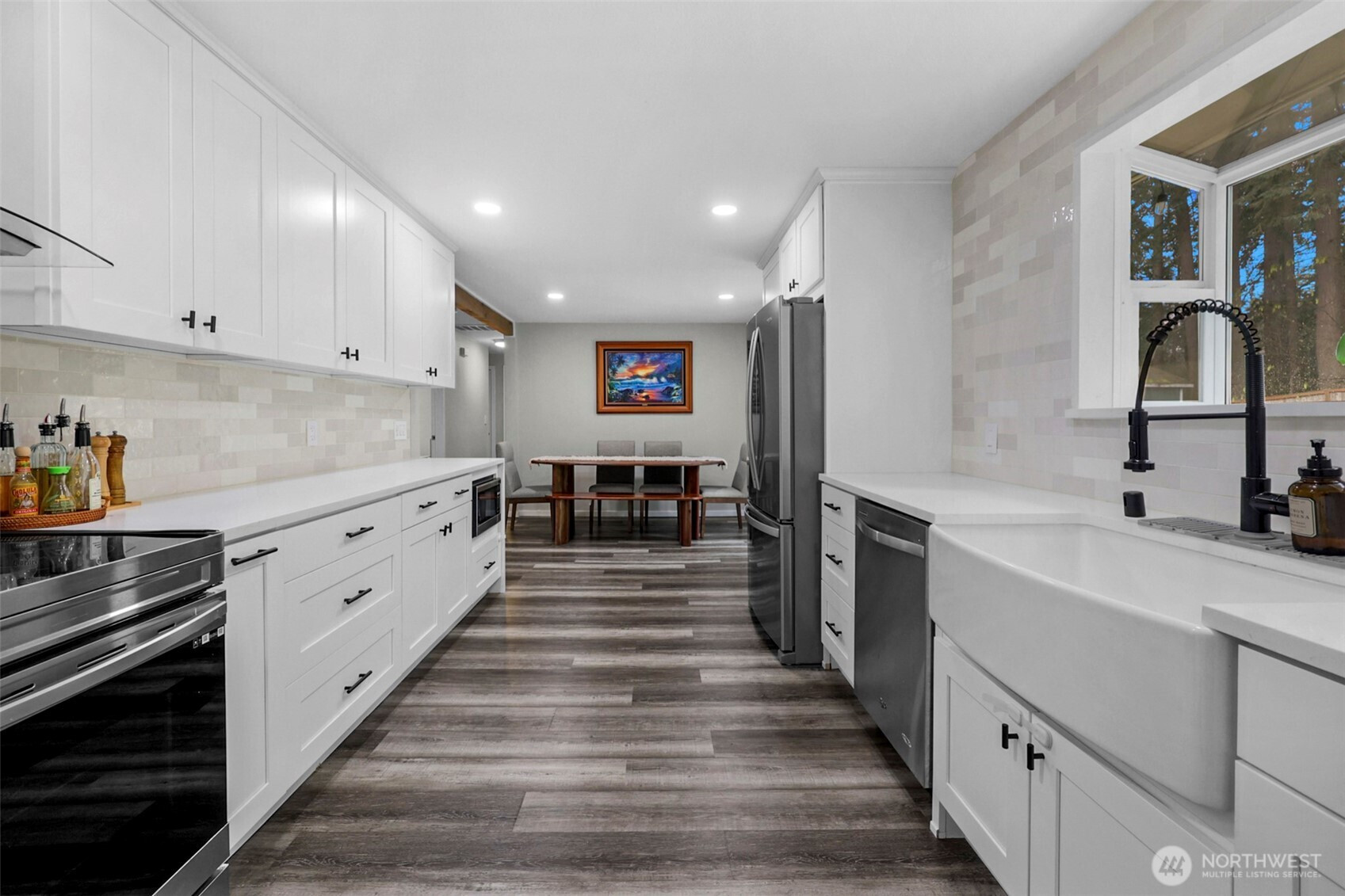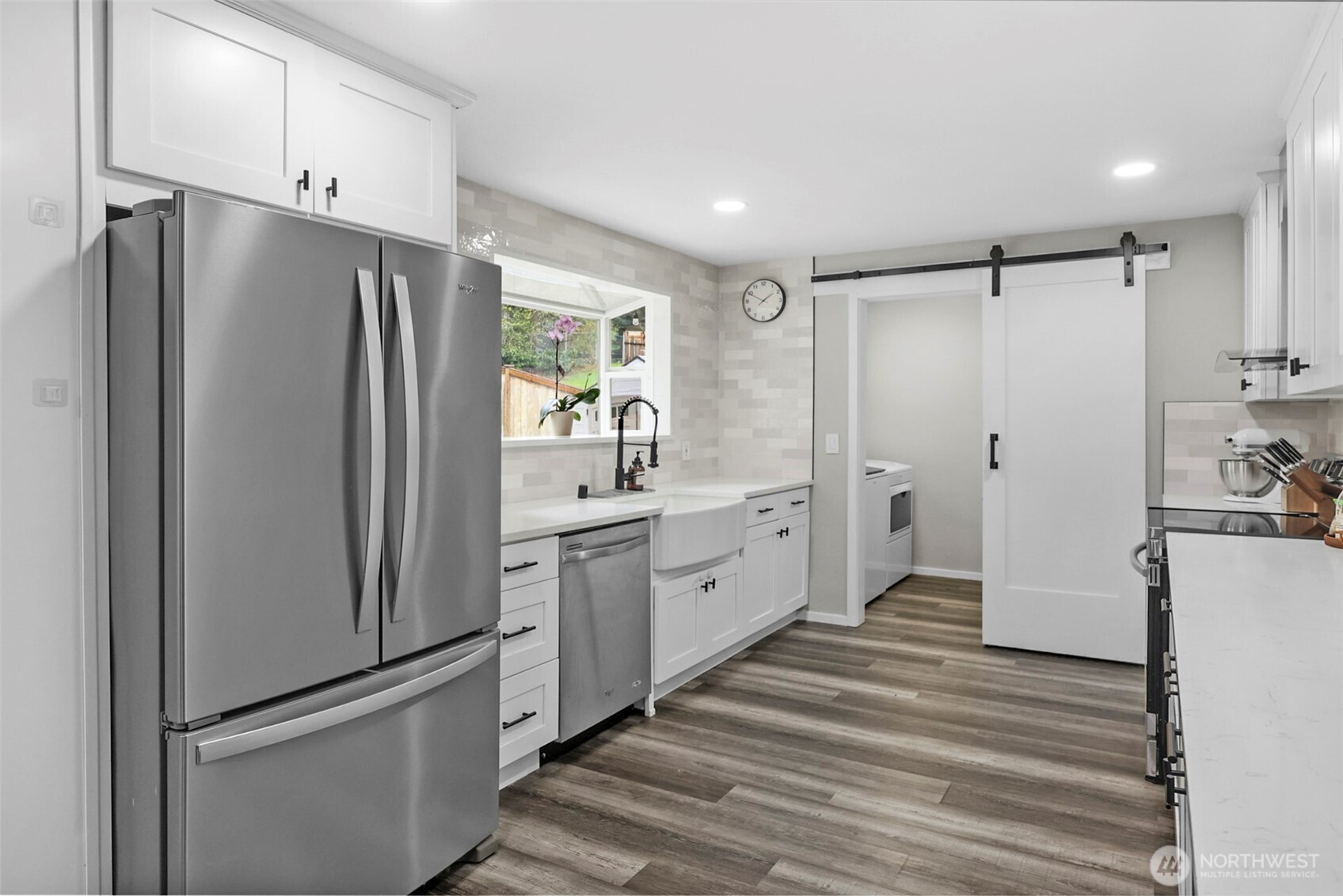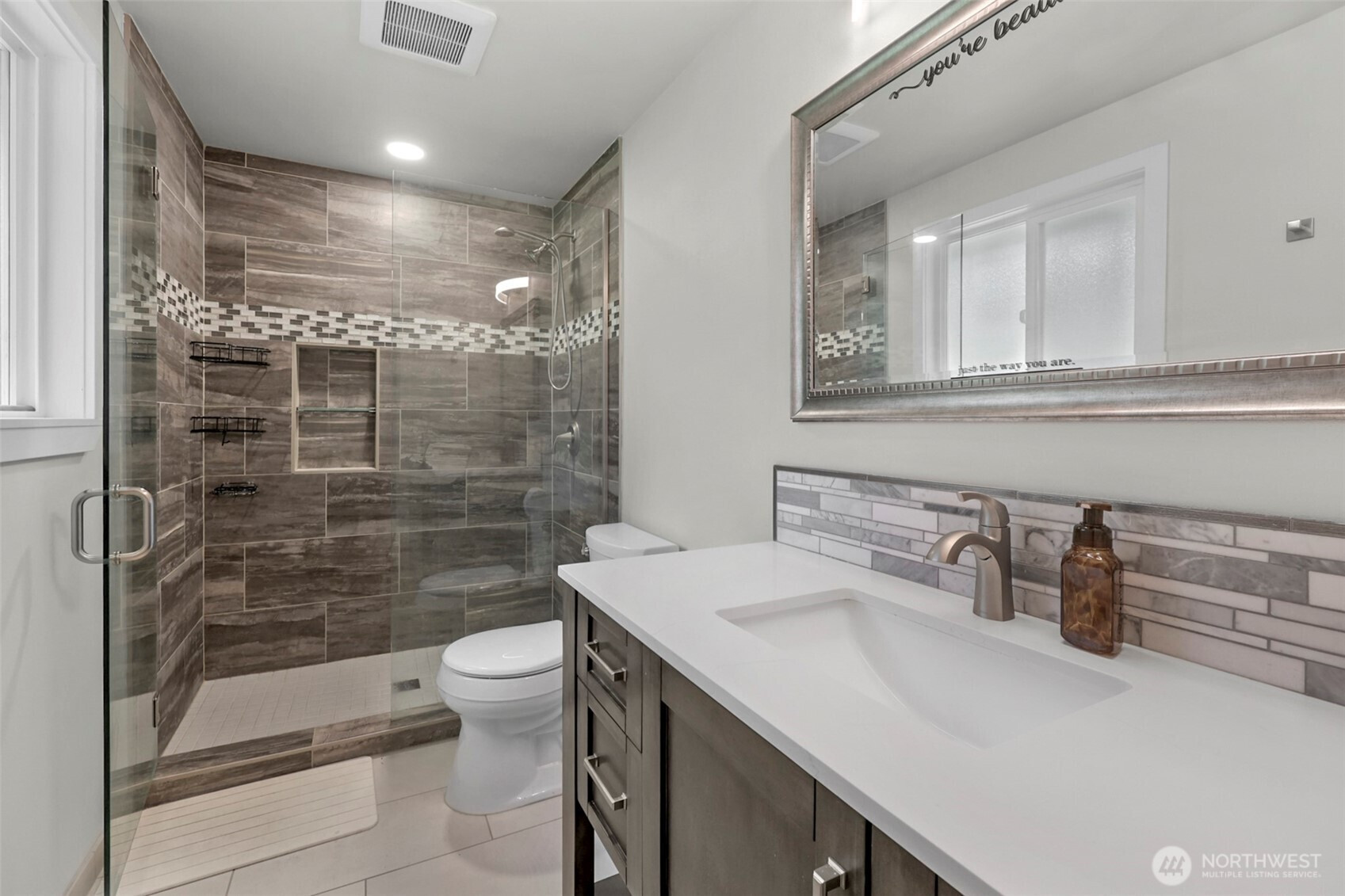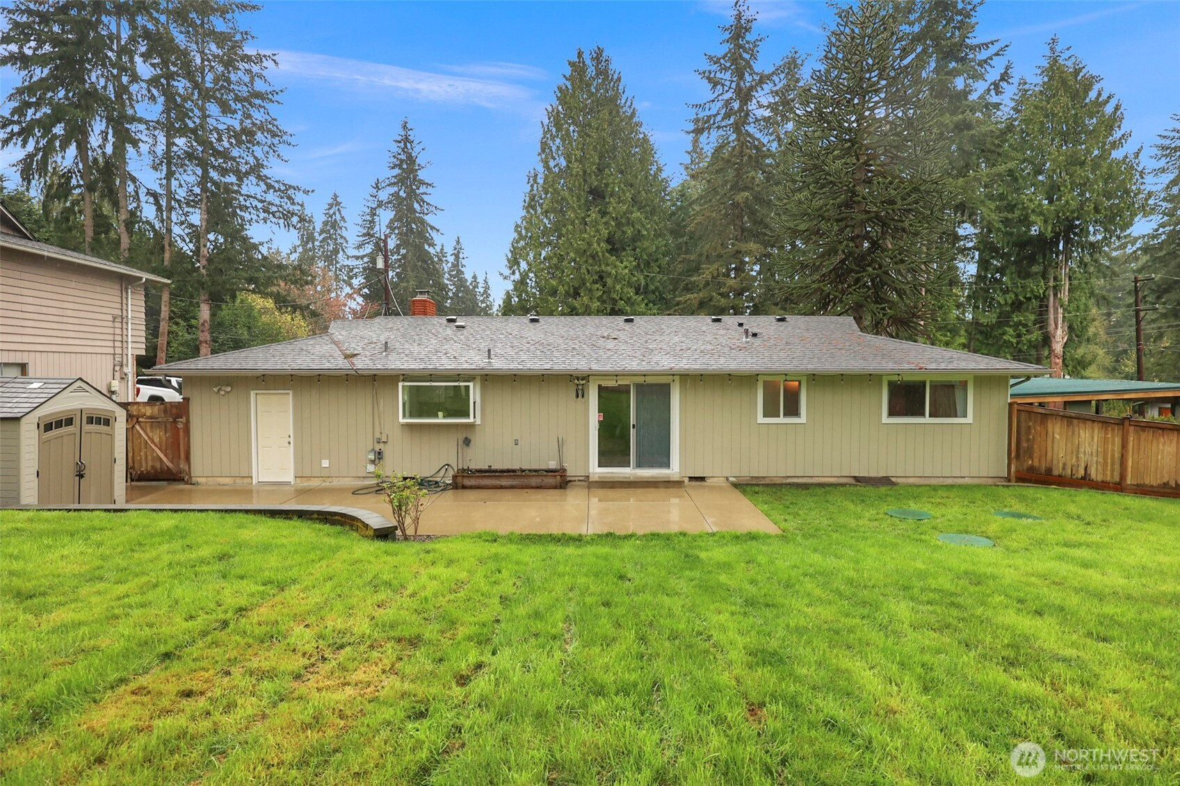 Welcome to your updated 3 bed, 2 bath rambler tucked away in a quiet pocket of Mill Creek near Martha Lake. Enjoy the privacy of a fully fenced, tree lined backyard with a spacious patio built for entertaining or unwinding at the end of the day. The remodeled kitchen serves as the heart of the home, featuring new cabinetry, quartz countertops, stainless appliances, and a farmhouse sink overlooking the backyard. Updated flooring and recessed lighting carry through the main living areas, creating a bright, open feel. The primary bedroom offers a private bath with a walk-in shower and glass enclosure. Equipped with a heat pump including air conditioning to keep things comfortable year-round. A wood burning fireplace adds warmth and character through the colder months. Secure RV parking sits alongside the single car garage, providing flexibility for storage or additional vehicles. Meticulously maintained and pre inspected, this home is move in ready with thoughtful updates throughout.