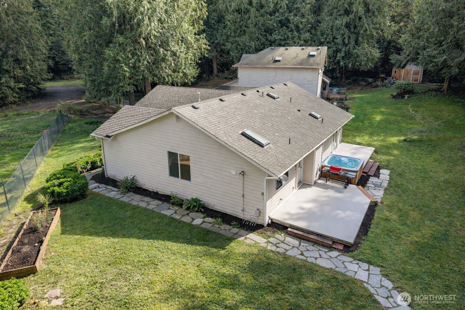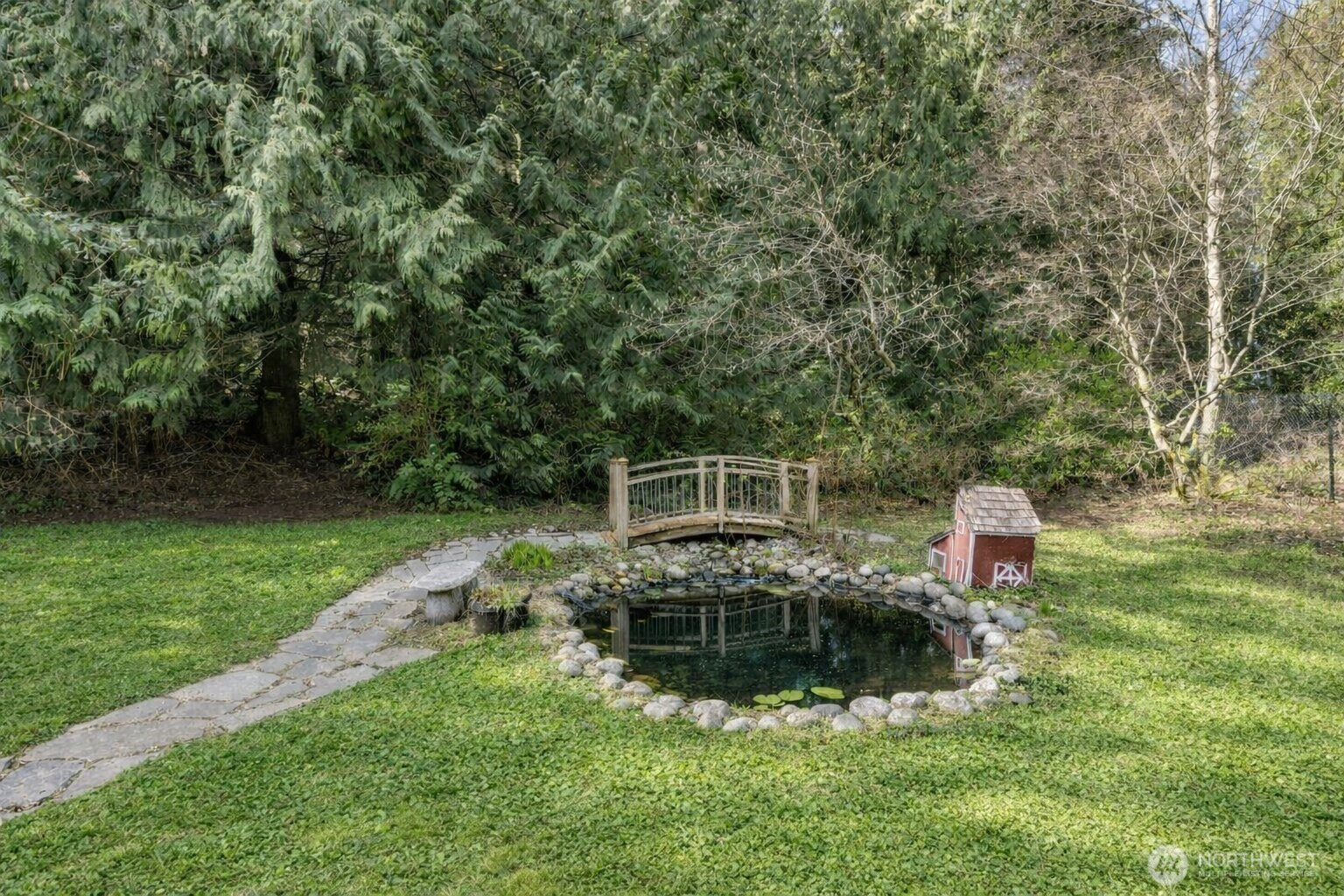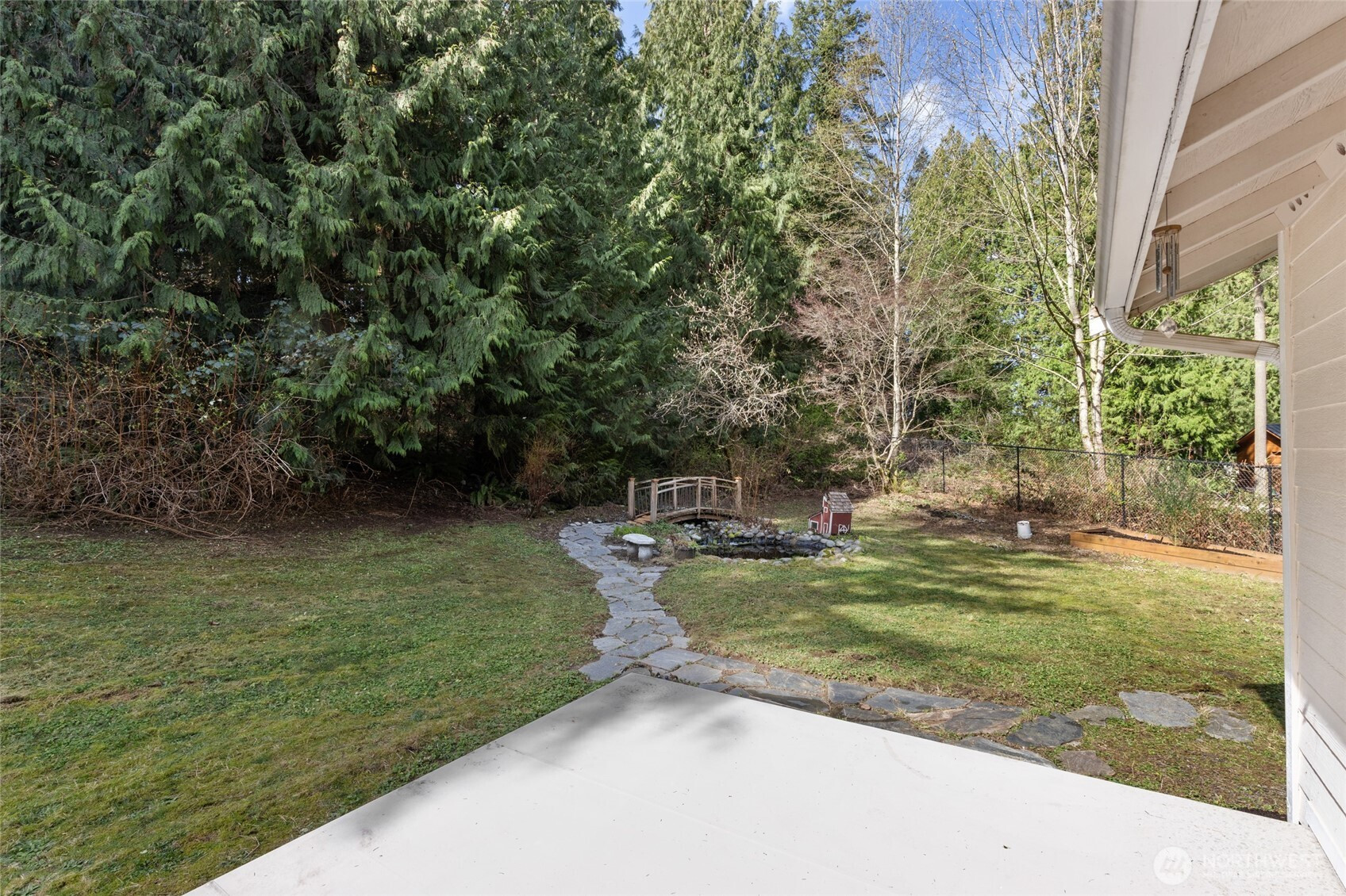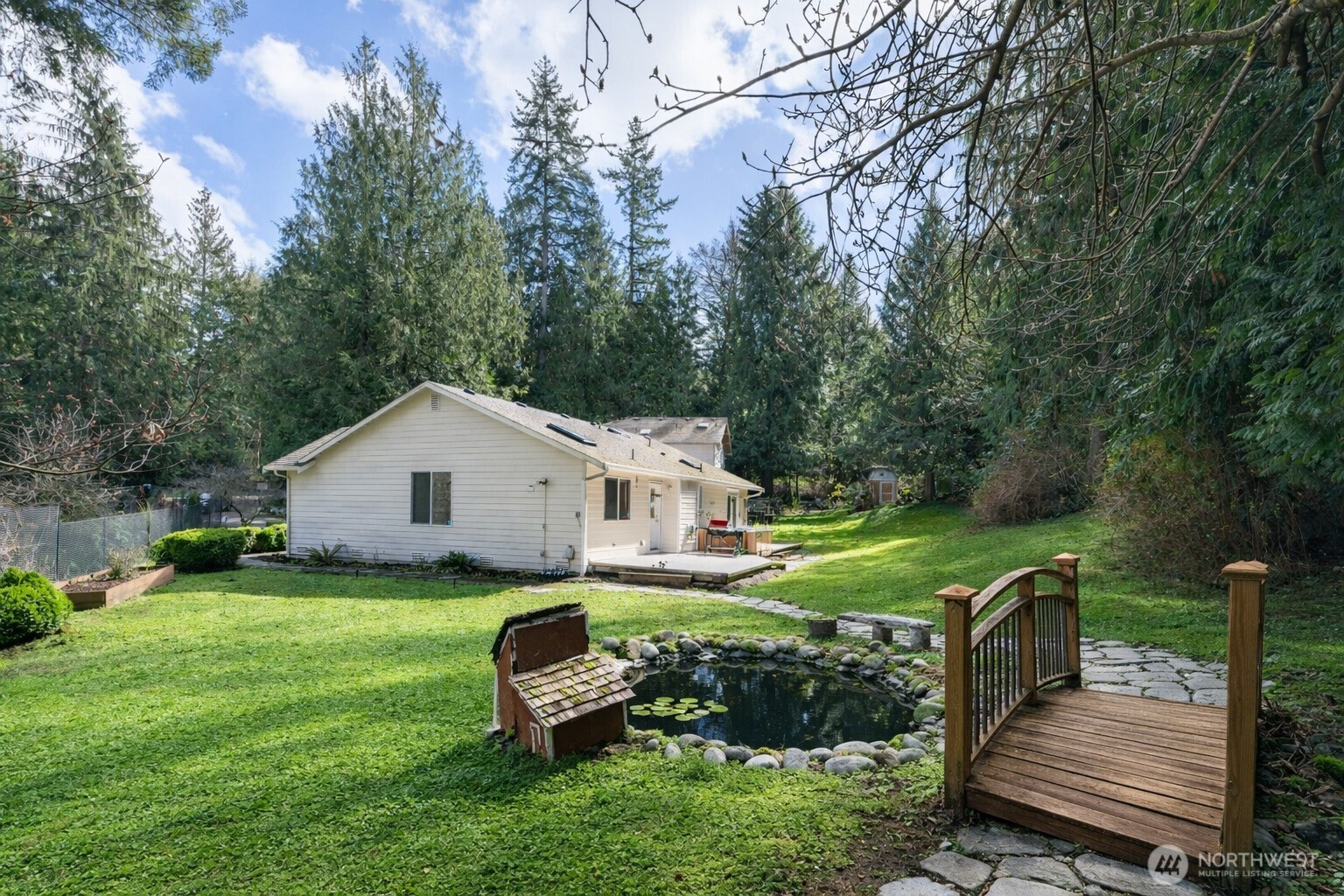 Well-maintained single-level home ideally situated between Lake Shoecraft and Lake Goodwin, offering a peaceful, nature-filled setting on a shy half-acre lot. This 3-bedroom, 2-bath home features two spacious living areas, an open kitchen flowing into the main living space with a cozy gas fireplace, and a separate dining room. Multiple skylights fill the home with abundant natural light throughout. Step outside to a beautifully landscaped yard surrounded by mature trees, complete with a tranquil manmade pond, creek, and waterfall feature. Unwind in the hot tub and enjoy year-round relaxation in this serene setting. Garden enthusiasts will love the ample space, along with existing wiring and water access for a future greenhouse. Spacious shed for additional storage wired for power. Additional highlights include a newer tankless gas water heater and a 10KW automatic Generac generator for seamless backup power. Located just 1 mile from Wenberg County Park and boat launch, and only 10 minutes to I-5 and Tulalip amenities including shopping and more affordable fuel. A rare opportunity to enjoy comfort, privacy, and convenience in a scenic Pacific Northwest setting. The home has been pre-inspected and repairs made to make this home move-in ready.