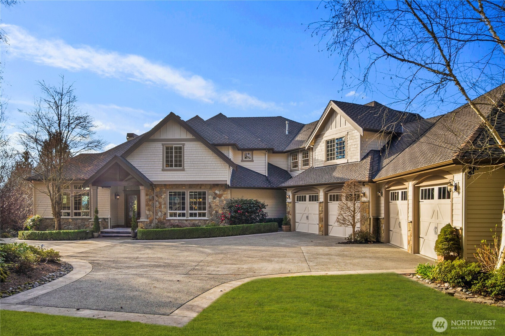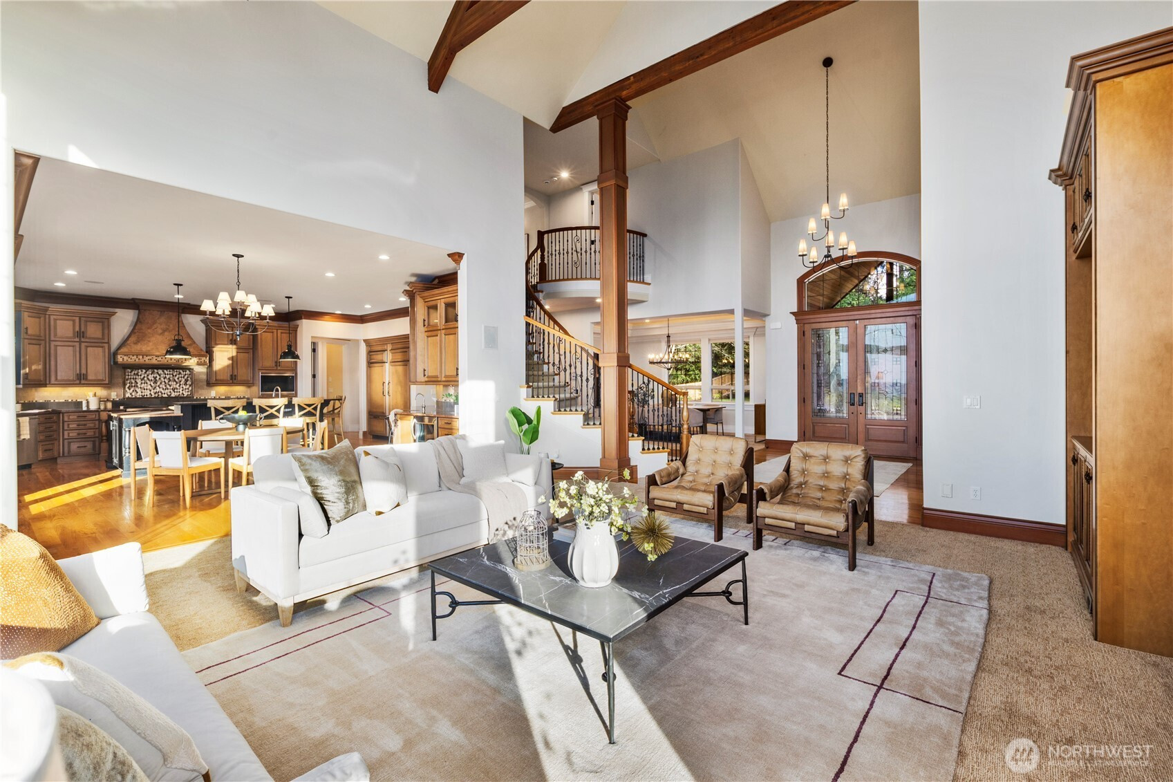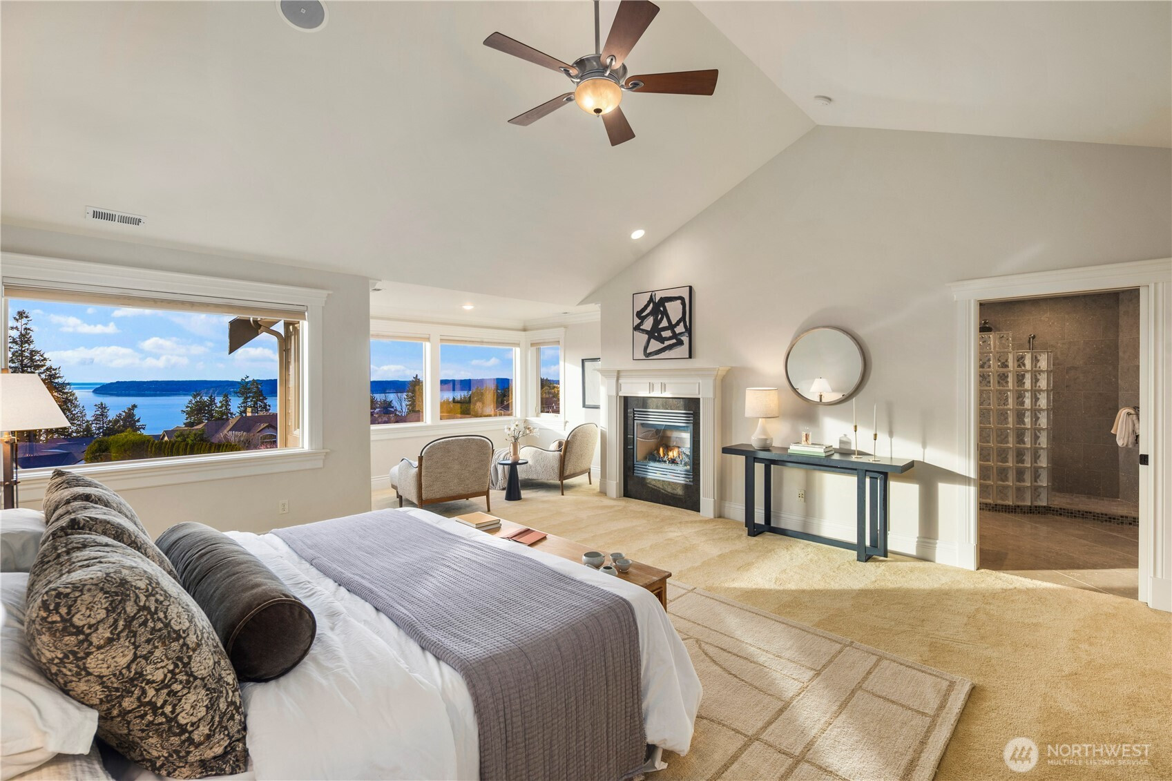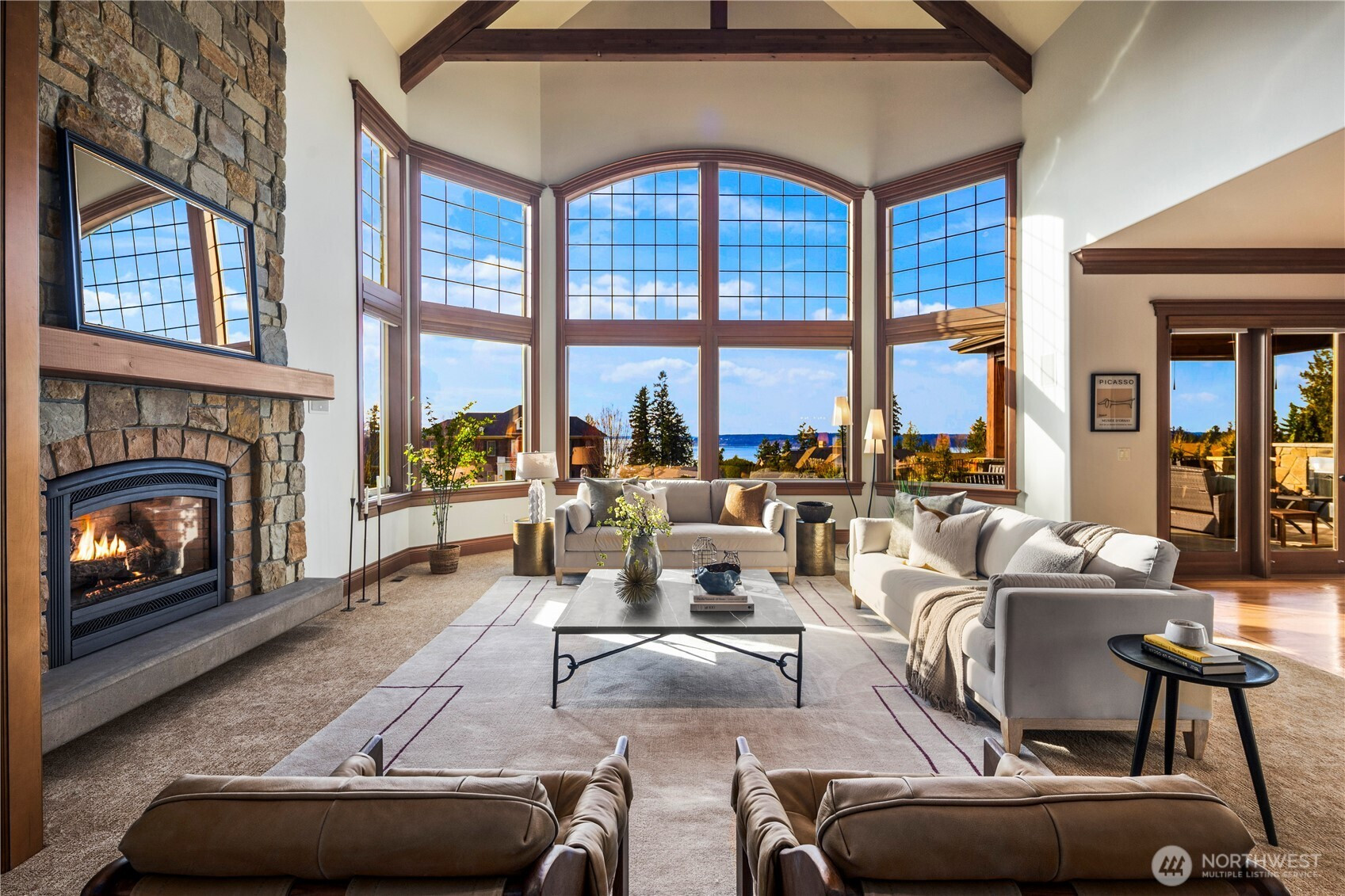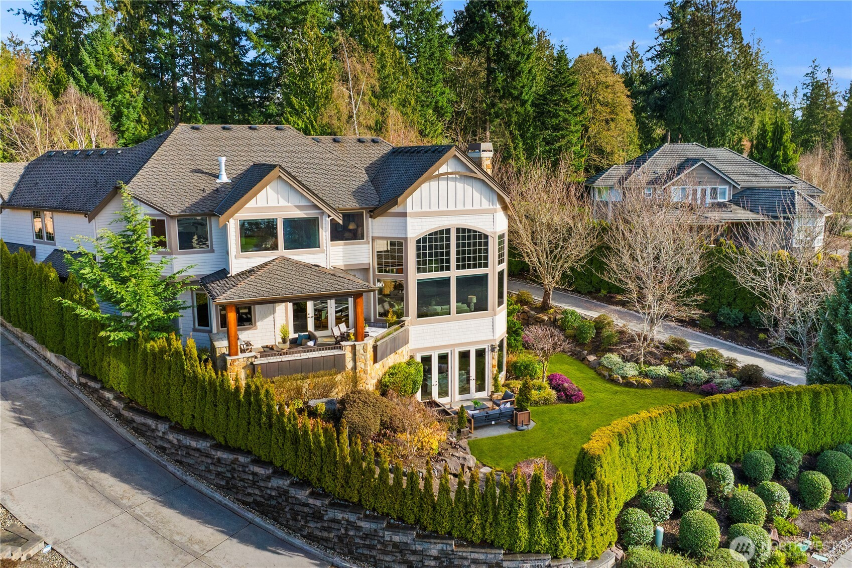 Perched on a quiet cul-de-sac, this nearly 6,000 sq ft west-facing estate captures breathtaking views of Puget Sound, Olympic Mountains, & Whidbey Island. Enjoy incredible sunsets from nearly every room in the house. A grand staircase entry makes a striking first impression, leading into an expansive great room with soaring 30-foot ceilings, exposed wood beams, & walls of windows that flood the home with natural light. Designed for effortless living & entertaining, the open-concept main floor features a chef’s kitchen seamlessly connected to inviting gathering spaces, including a covered deck with fireplace and panoramic views. A gorgeous office, walk-in pantry, large laundry room, and two powder baths complete this floor. Upstairs, three bedrooms are thoughtfully positioned on one level, each with their own ensuite bathroom. The primary suite offers a private retreat with stunning views, a fireplace, spa-like 5 piece bath, & an expansive walk-in closet. The lower level is an entertainer’s dream, complete with a 104” HD theater with 7.1 Dolby sound, wine cellar, game room, and guest suite. Multiple outdoor living areas, include a patio for dining and lounging, garden beds, and flat grassy lawns in both the front and back—an ideal blend of beauty and functionality Additional features include an elevator, whole-home sound system, and a 4-car garage with ample additional parking—offering a rare combination of scale, function, and Northwest luxury living.