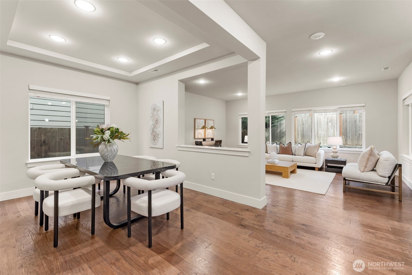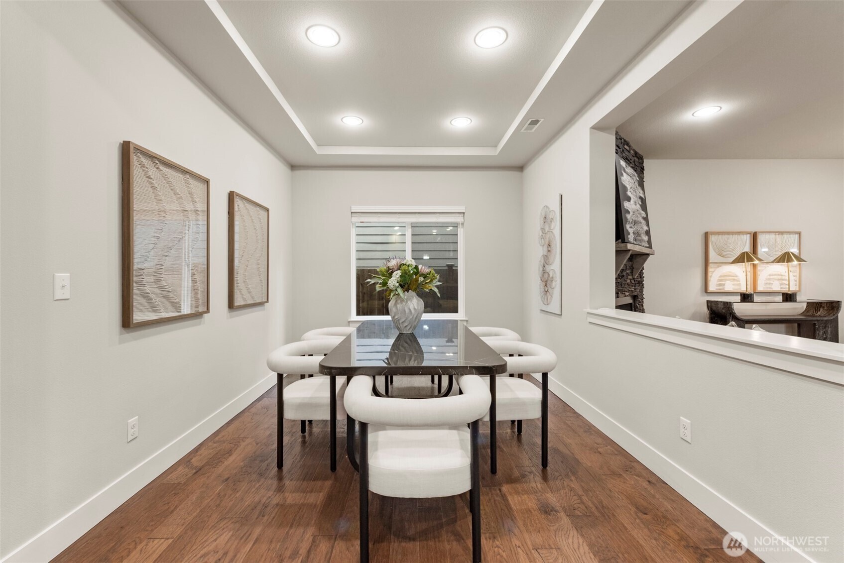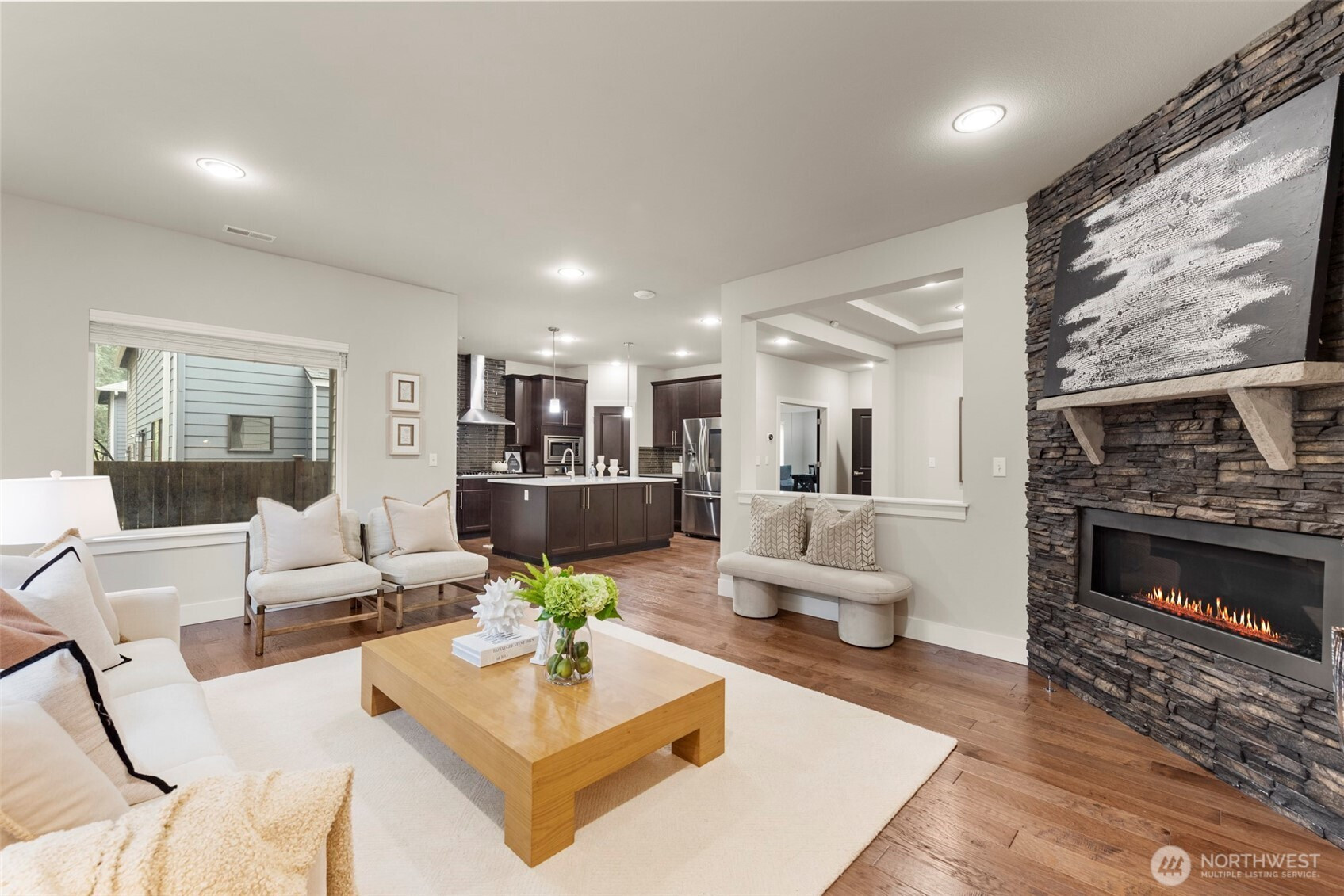 Tucked into the highly sought-after Silver Peak Estates, this beautifully maintained home—built in 2017—offers the comfort of newer construction with modern finishes and a thoughtfully designed layout.A covered front porch leads into a bright foyer with engineered hardwood floors that extend through the main level. The open-concept layout connects the living, dining, and kitchen areas, creating a space that feels both functional and inviting. The living room is anchored by an oversized gas fireplace with a full-height tile surround, while added windows bring in great natural light. The kitchen features quartz countertops, a stylish backsplash, and a layout that works well for both daily living and entertaining.Upstairs, a generous loft provides a flexible second living area—ideal for a media room, home office, or additional living space. The layout offers versatility and can easily adapt to a variety of needs over time. The primary suite includes a walk-in closet and a spacious 5-piece bath.Additional highlights include central A/C, smart home features, and more. Conveniently located just minutes from Alderwood Mall, Costco, Whole Foods, with easy access to I-5 and nearby transit options, including the Lynnwood Light Rail station for commuting to Seattle and beyond.