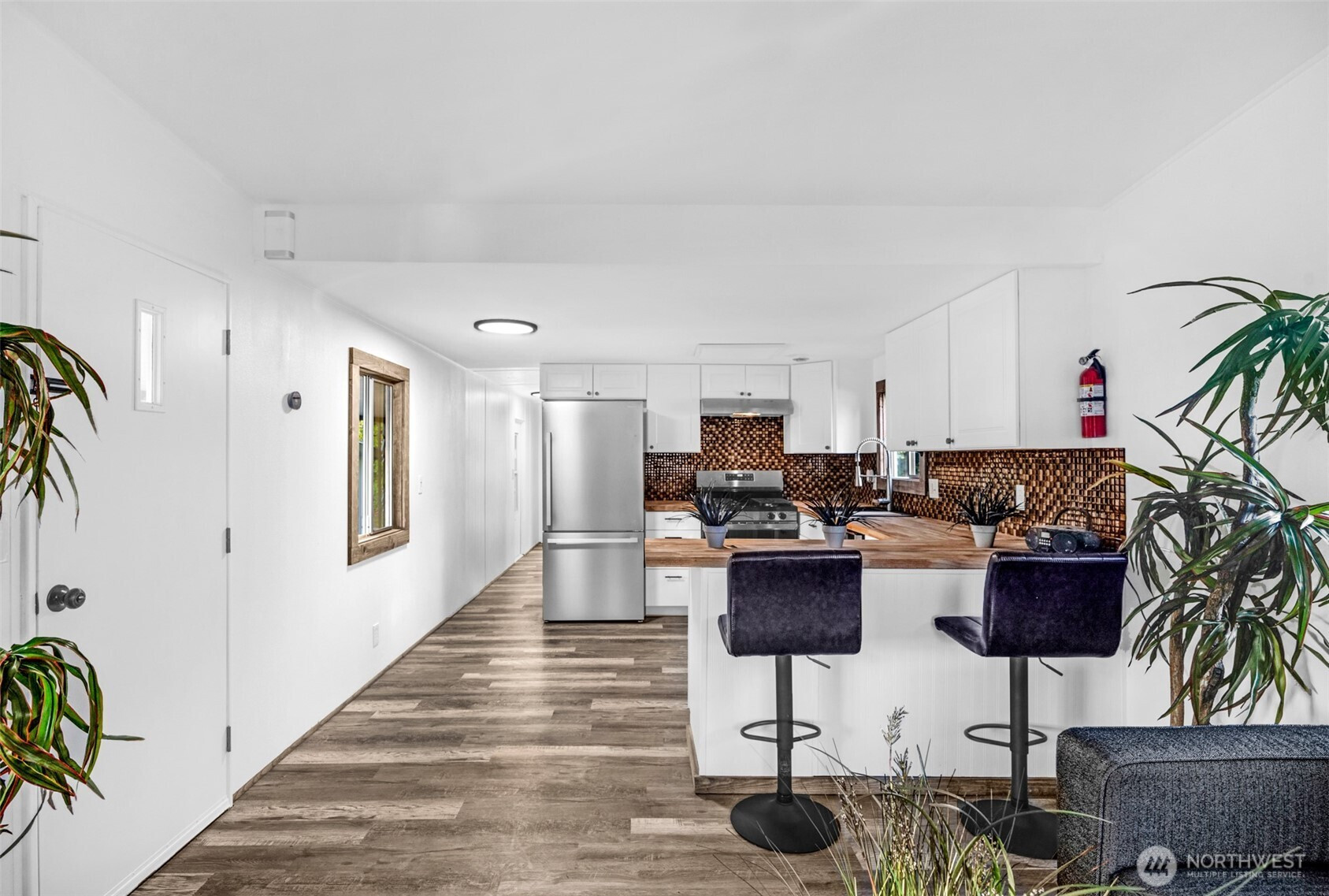 Beautifully remodeled 2-bedroom, 1-bath home offering fresh, modern living throughout. Enjoy an open and bright layout with new flooring, updated lighting, and large windows that fill the space with natural light. The stunning kitchen features white cabinets, butcher block counters, stainless steel appliances, and a warm mosaic tile backsplash. Updated bath with stylish finishes plus a new stackable washer/dryer for added convenience. Both bedrooms offer clean lines and built-in storage. Exterior highlights include covered parking, a spacious covered porch, and low-maintenance landscaping. Truly move-in ready!
