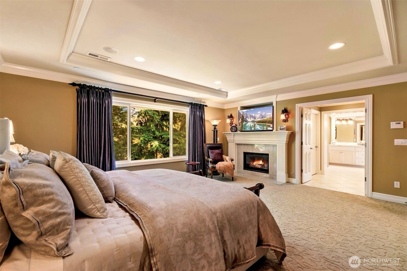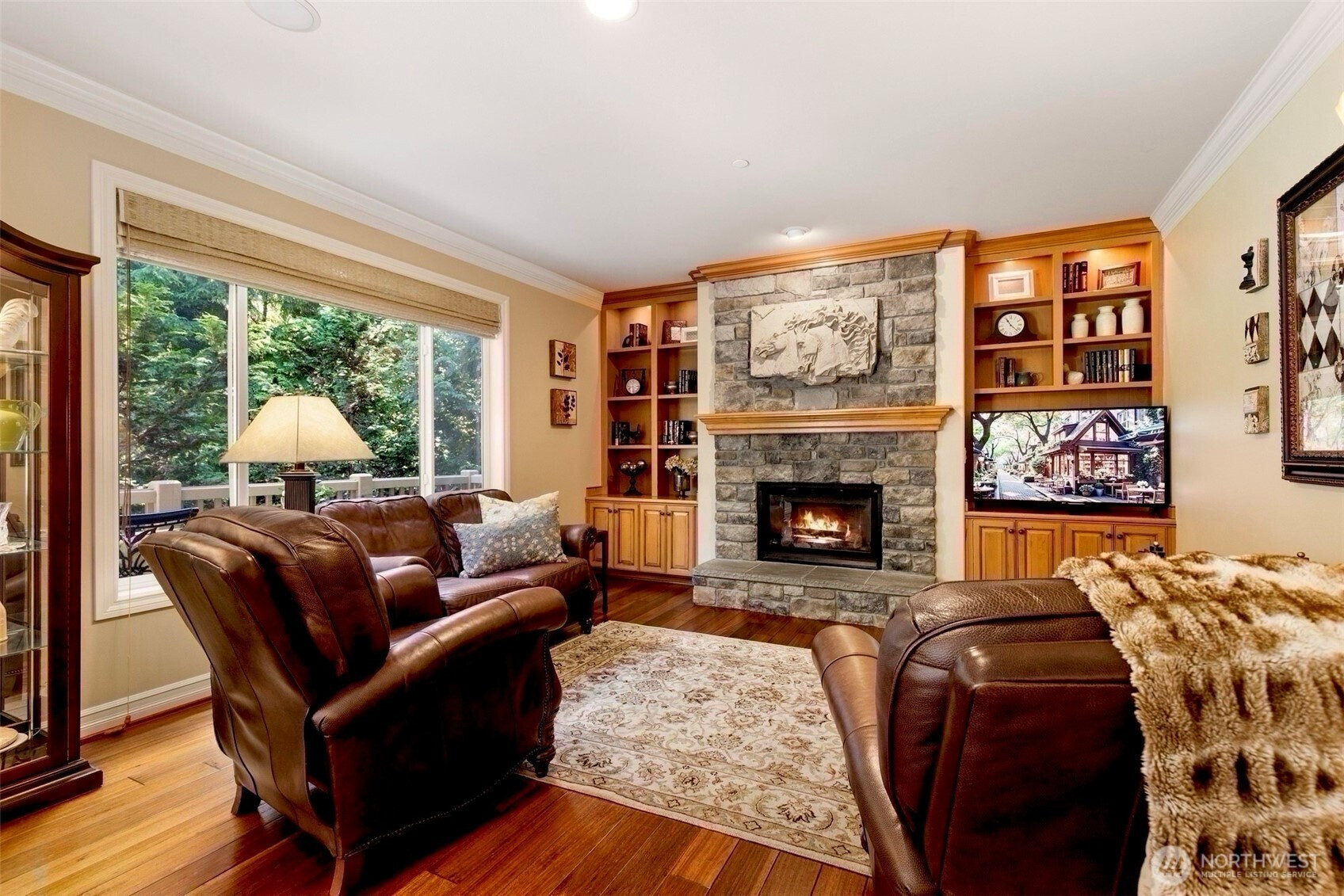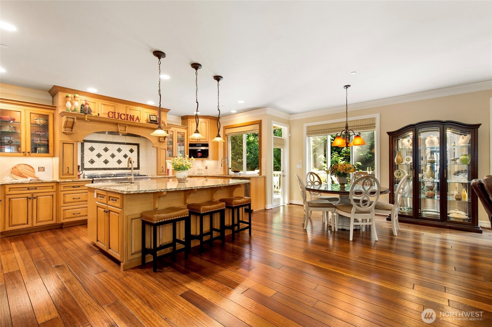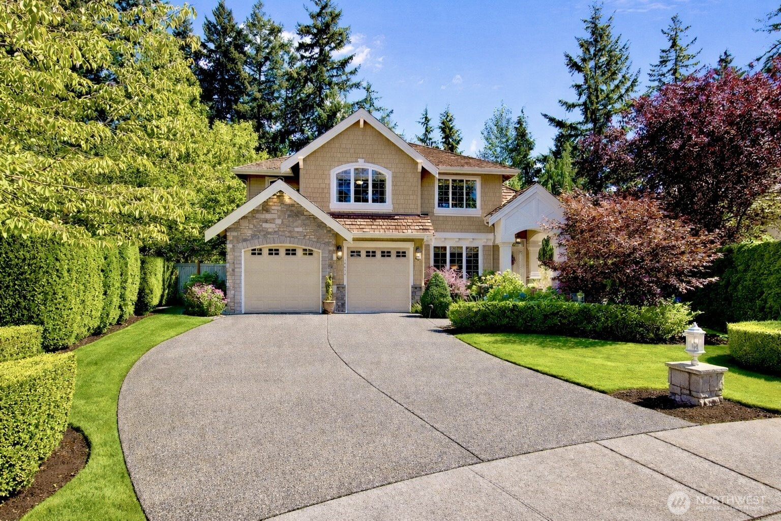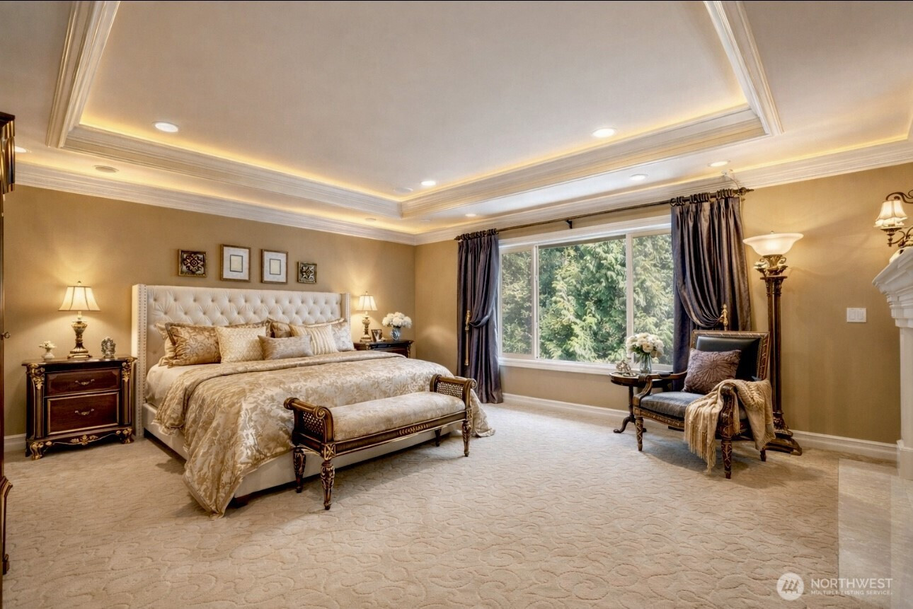 Timeless Buchan luxury in Mill Creek’s premier River Crossing. Private greenbelt cul-de-sac setting with 4,770?sq?ft features soaring ceilings, mahogany floors, exquisite millwork, & leaded glass accents. Gourmet kitchen offers a 48” Thermador, Sub-Zero Pro, Meile espresso, slab granite island with Brizo touch faucets, custom cabinetry. Versatile plan includes 5 BD, 4.5 BR, executive office, theater, & bonus room. Grand primary suite with a fireplace, spa bath, rain shower, and dual walk-in closets. Landscaped yard, tranquil triple fountain, expansive Trex deck, lighted sport court, & irrigation. Dual A/C, tankless water, integrated whole-home audio, and a finished 3-car garage. Lower-level MIL potential. Walk to Town Center, golf, & parks.