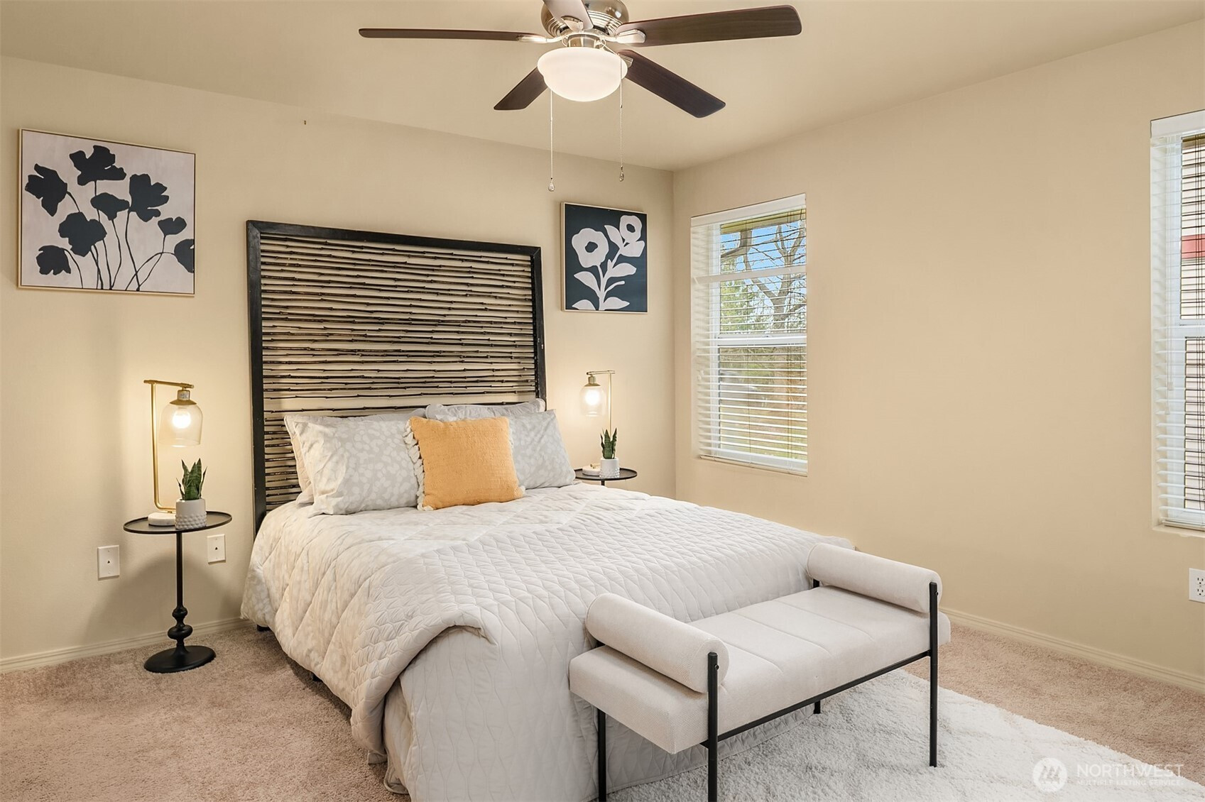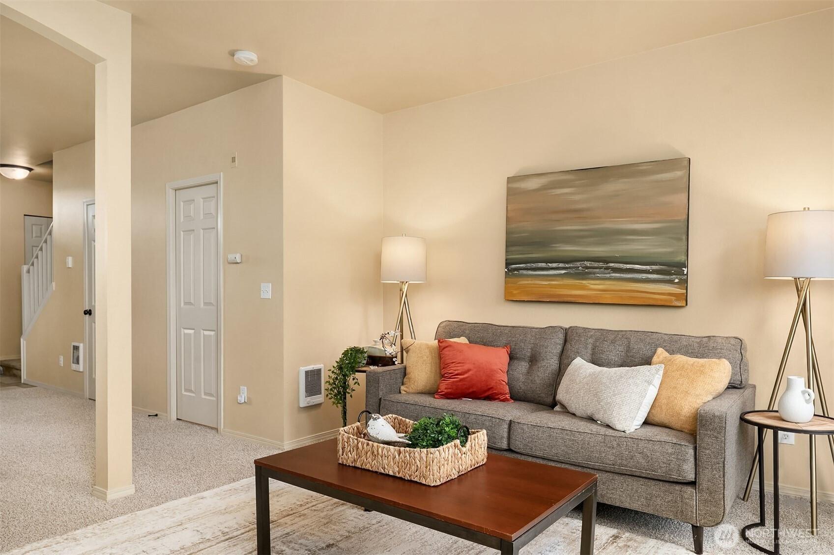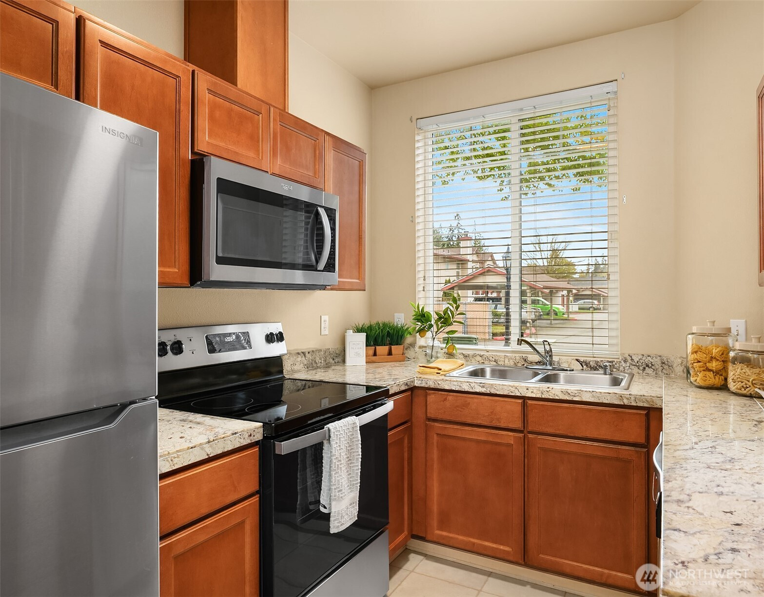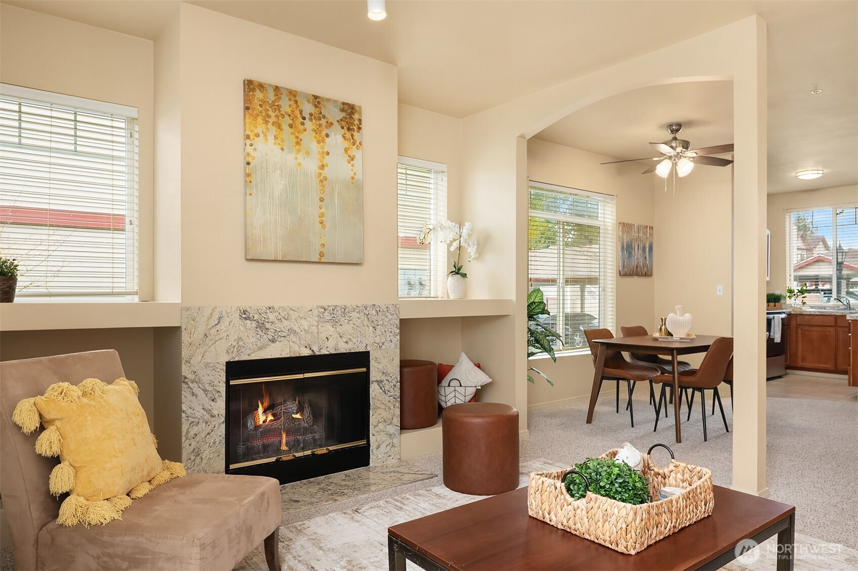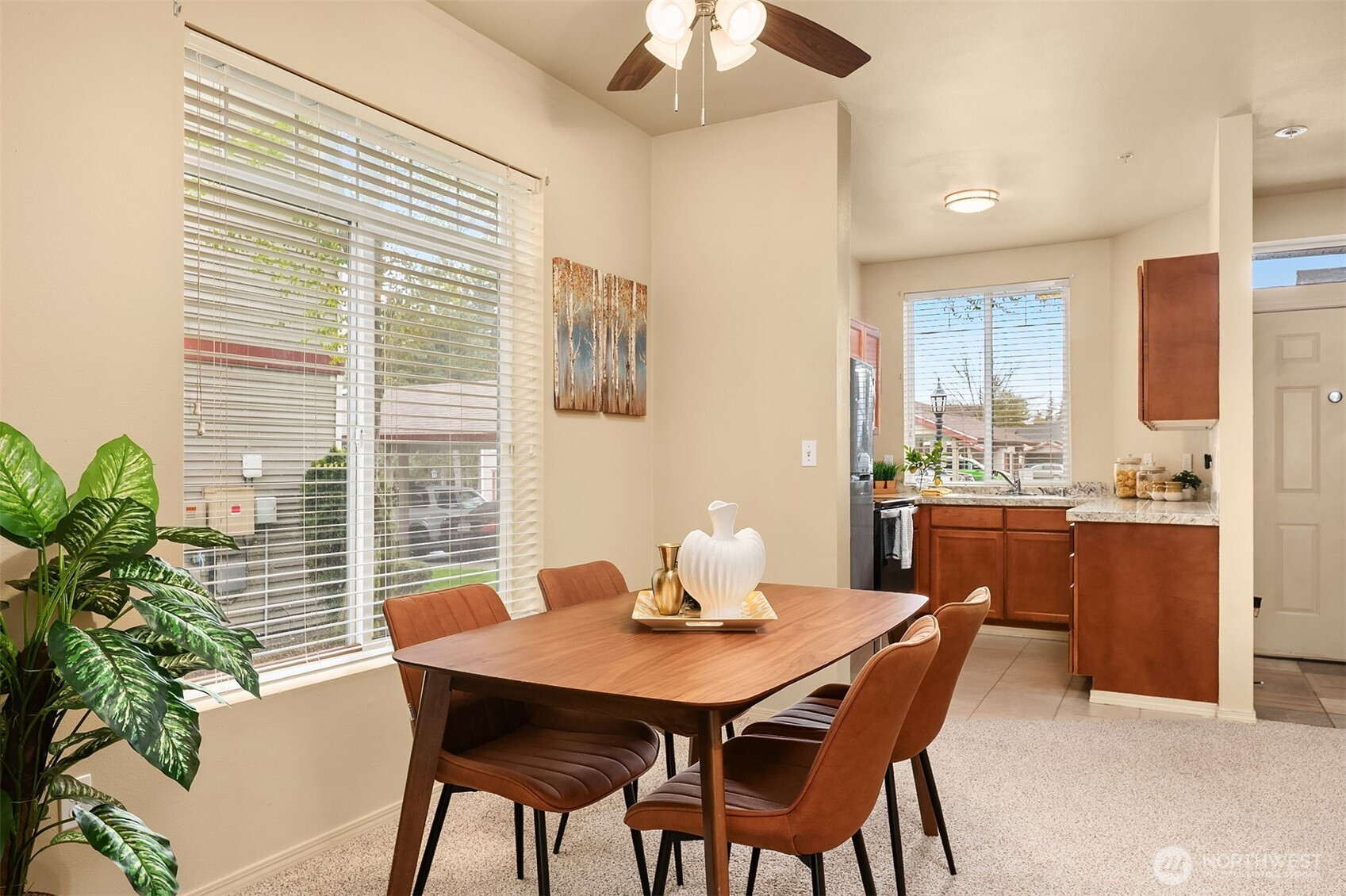 Spacious light-filled, 2 bd, 1.5 bath condo offering the privacy of townhome living with no neighbors above or below! Bright open living and dining areas that flow seamlessly to a sunny patio, perfect for entertainment overflow! Newer SS appliances, a granite countertop, and plenty of cabinets complete the natural light filled kitchen! Downstairs, enjoy the additional comforts of a cozy fireplace, new carpet and a powder room. The upstairs features skylights, W/D, and two bedrooms, with the primary having direct access to the full bath with a granite vanity and linen closet. This stunning end unit home comes with 2 parking spaces, one covered, and extra guest and street parking nearby! Located in the Gold Leaf community with a clubhouse, workout room, athletic court, and playground. Award winning Edmonds school district! Close to Boeing, Paine Field, shopping, dining, and easy access to I-5, I-405, Mukilteo Speedway and light rail. Welcome home!