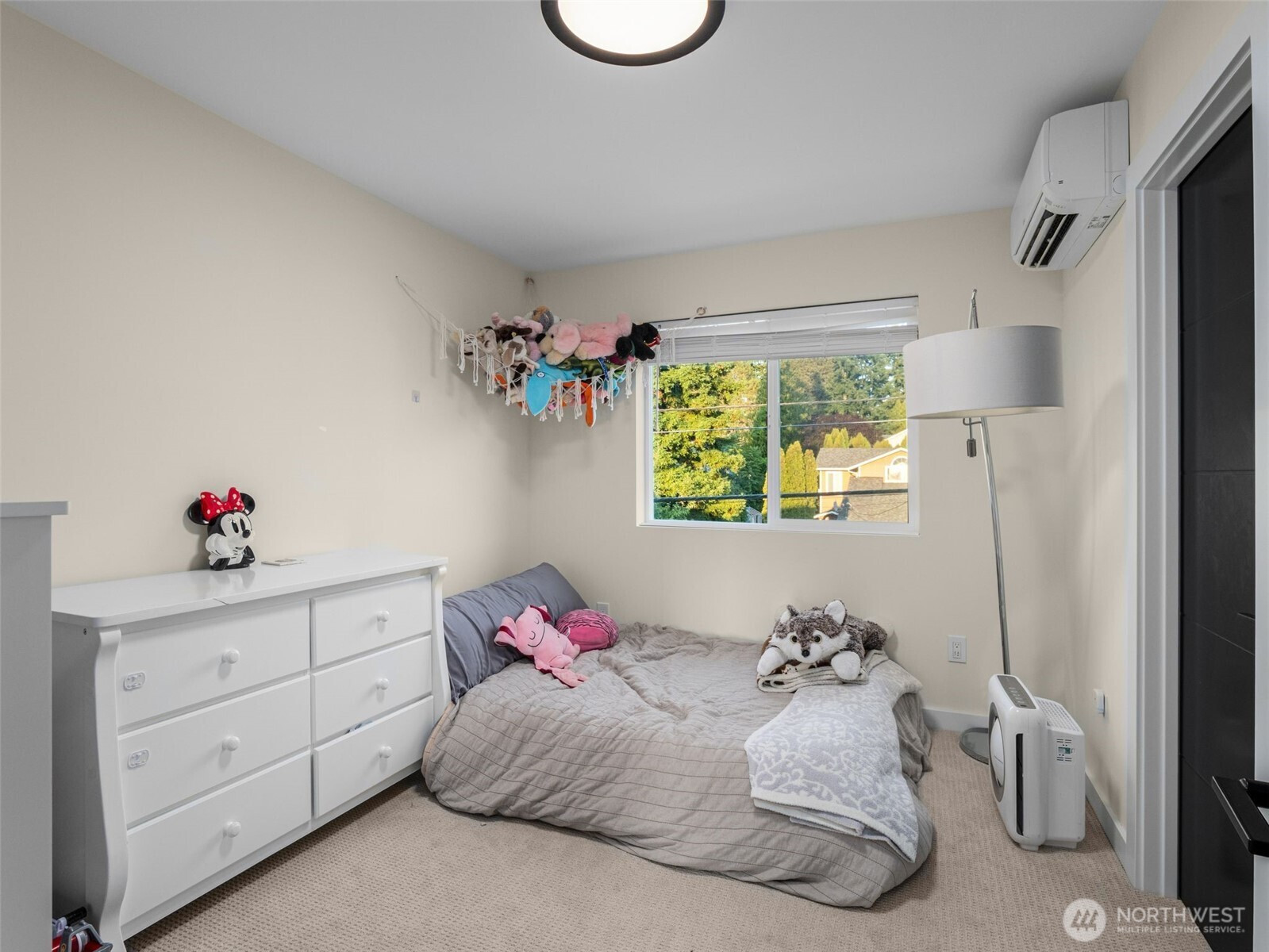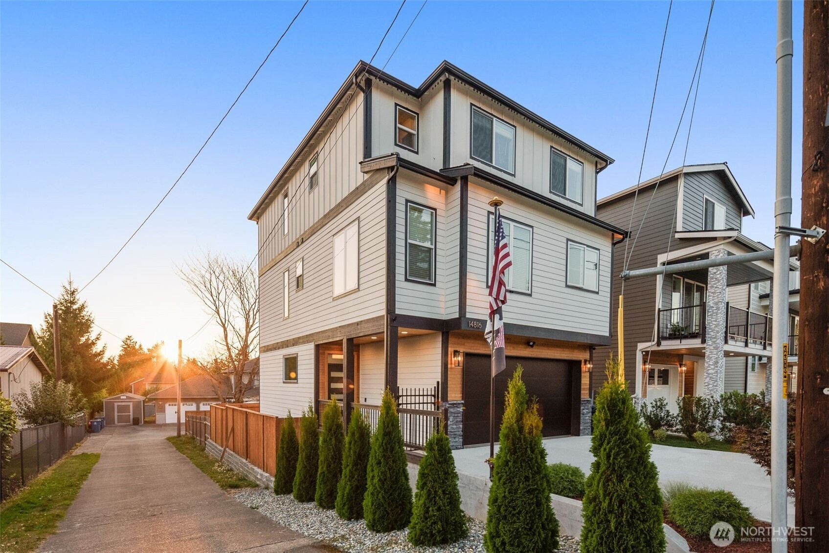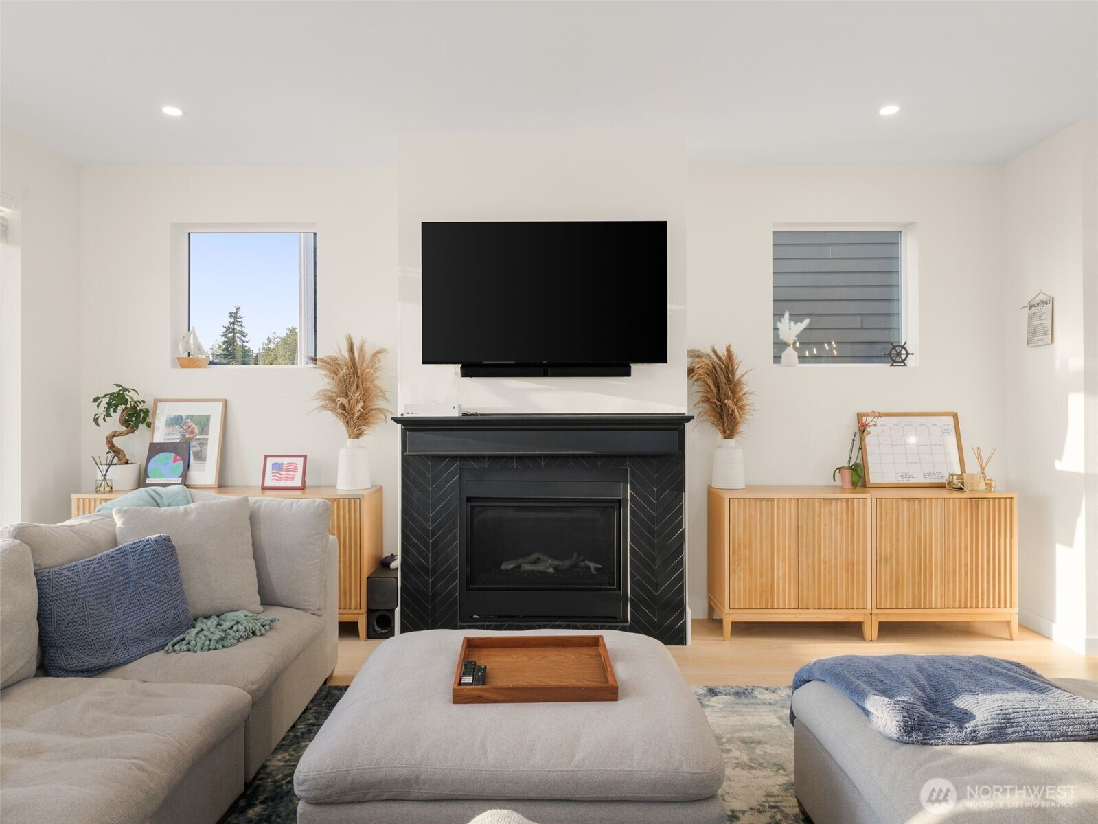 This stunning former model home offers clean, modern luxury with custom finishes throughout. Step through the front door to a versatile main-level primary suite w/walk-in closet & ensuite bath, perfect for multi-generational living or home office. The second level feels open, bright and inviting with sleek custom cabinetry, a striking waterfall island, dedicated dining space, large living room w/gas fireplace and windows that allow for tons of natural light. Upstairs, you'll find generously sized bedrooms, including a primary suite w/ensuite bath. Other features include a two car garage, driveway parking, gated front entry and easy access to both 405 and I-5! Don't miss out on this gorgeous like-new home that blends efficiency with style!