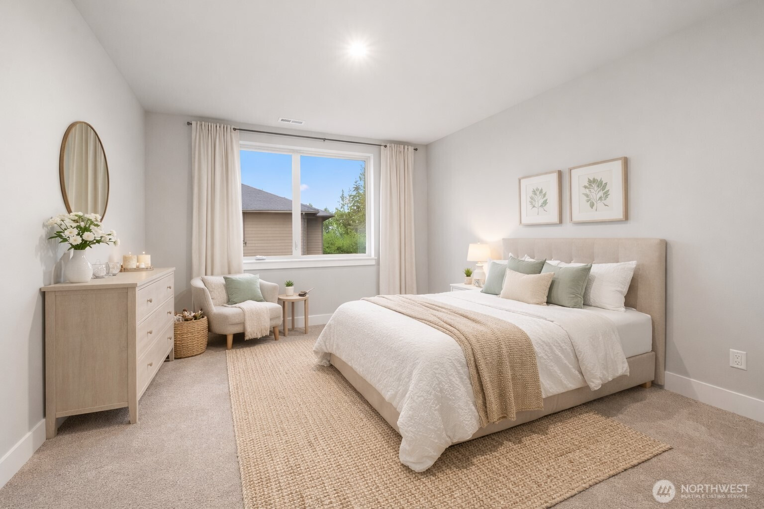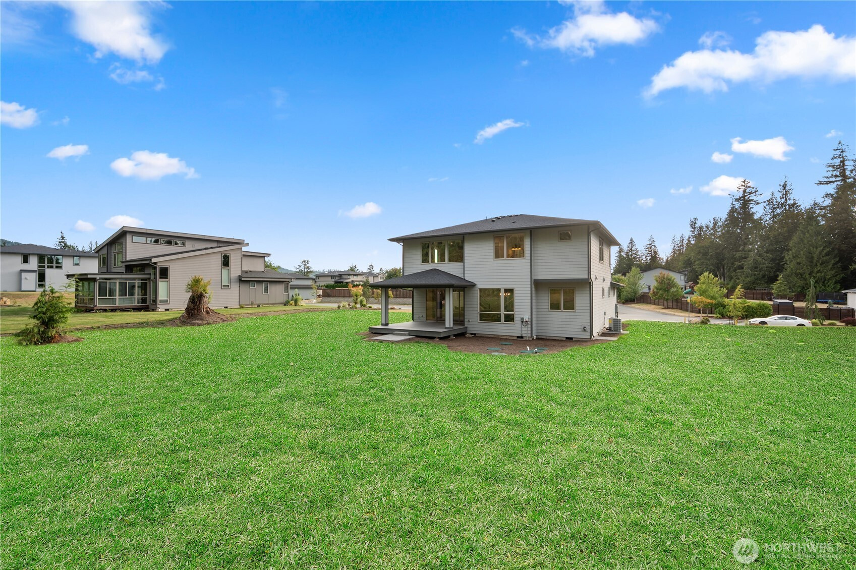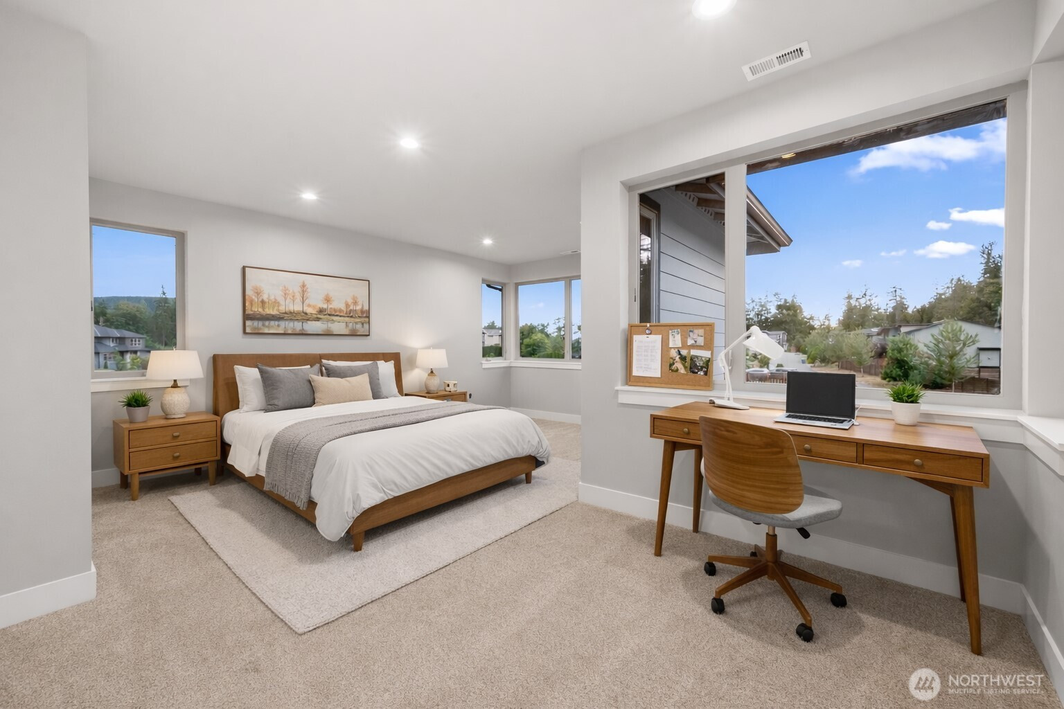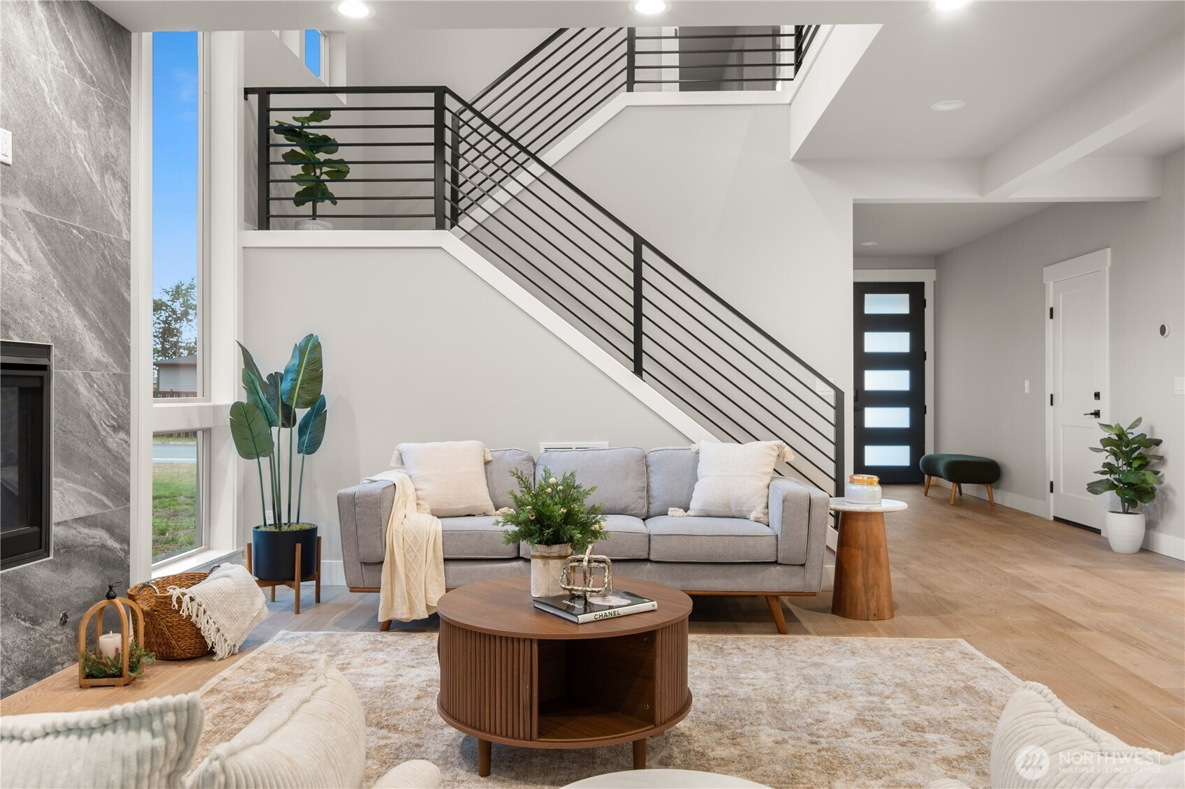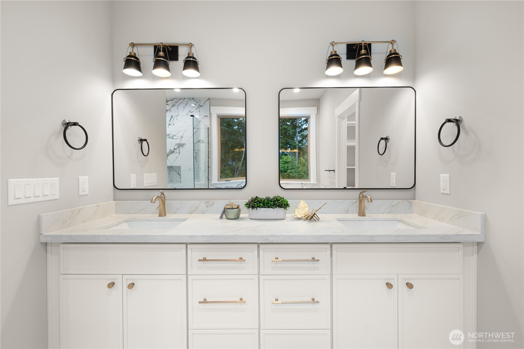 Nestled in private greenery with mountain views,this new build offers a blend of comfort and privacy.Spacious gourmet kitchen features 8-feet island, quartz countertops,elegant accent dining cabinetry with shelving and wine cooler,coffee nook built-in, premium smart appliances, modern lighting and fixtures.The bright great room boasts soaring floor-to-ceiling windows and modern gas fireplace.9 feet ceilings, closet systems and hardwood floors throughout.The luxurious primary suite with huge shower, freestanding tub and spacious walk-in closet.A second HUGE bedroom upstairs boasts office space.3rd bedroom includes walk-in closet and built-in make up table.Enjoy covered deck.Huge leveled lot with so much potential.