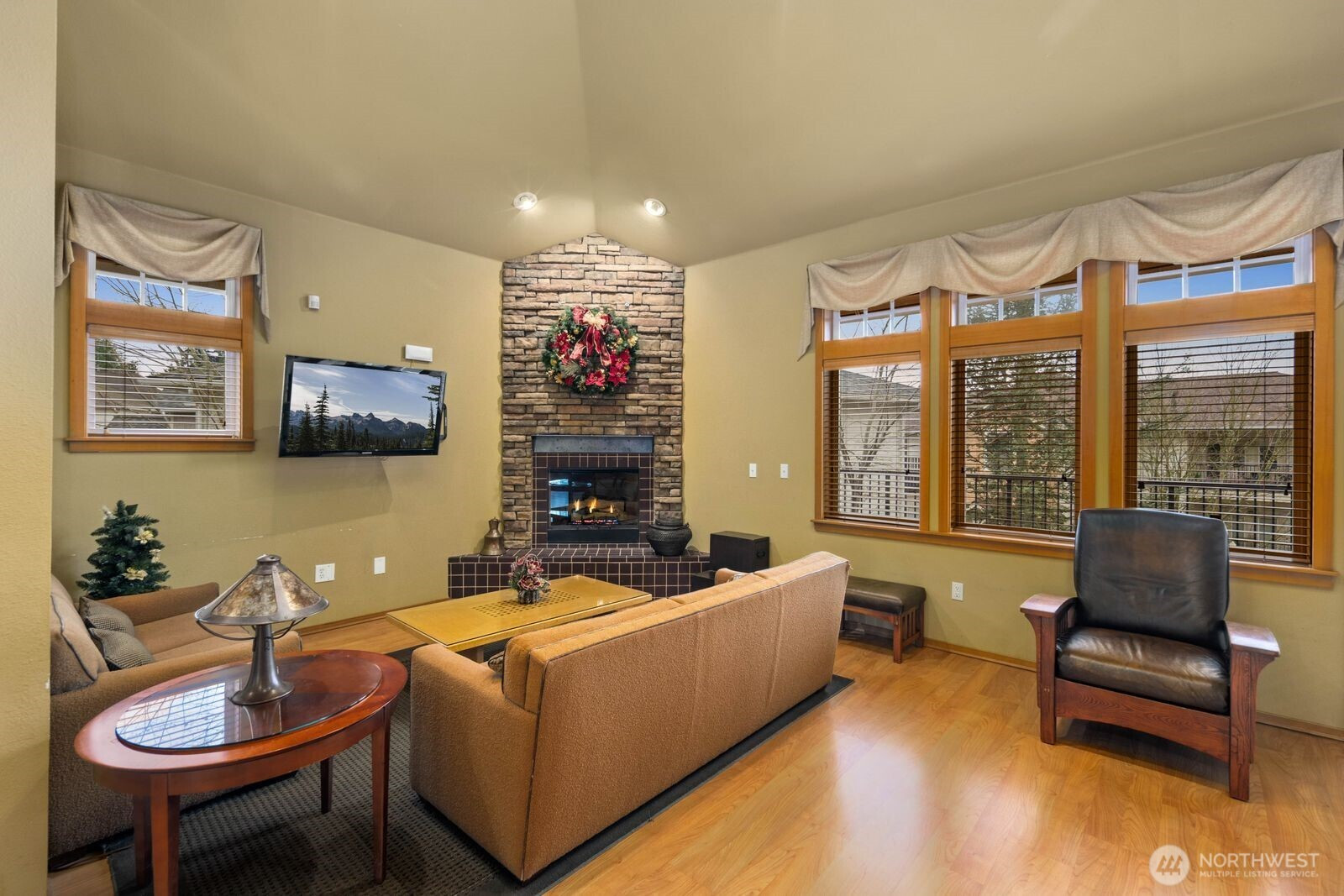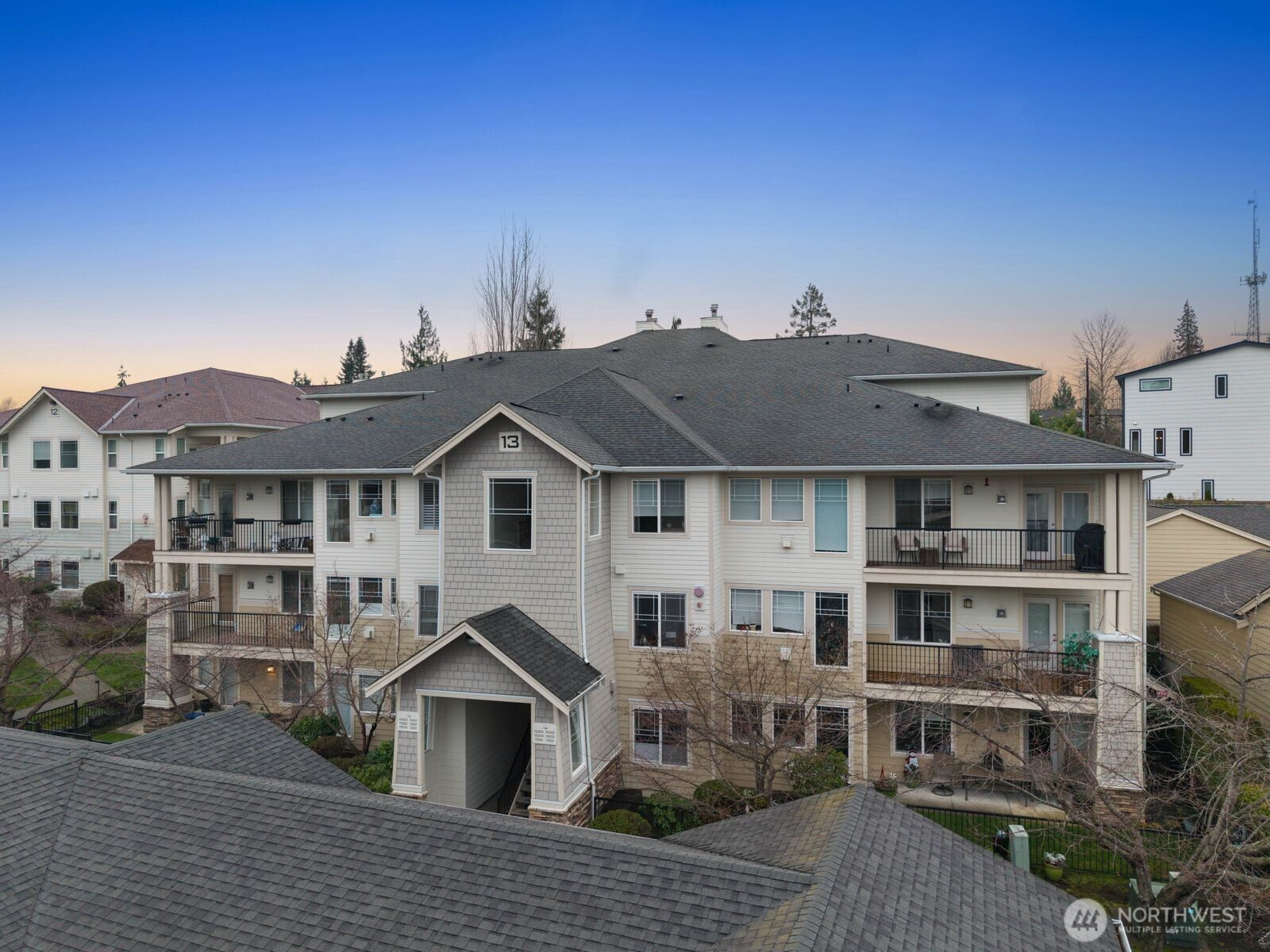Ideally located in Lynnwood's desirable Highwood Ridge gated community, this beautifully maintained end-unit condo offers comfortable and peaceful living. Step inside to a spacious 1,073sf open-concept floor plan, tall ceilings and fresh interior paint & carpets. Large living room with cozy gas fireplace, large windows and expansive private covered patio with storage. Chef's kitchen boasts maple cabinets, SS appliances and breakfast bar that opens to the dining room. The generous primary suite features an en-suite bathroom with dual sinks, soaking tub and walk-in closet. Generous 2nd bedroom, ¾ bathroom and in-unit washer/dryer. Impressive community clubhouse with owner's lounge, movie theater & well-equipped gym. Dedicated garage parking.