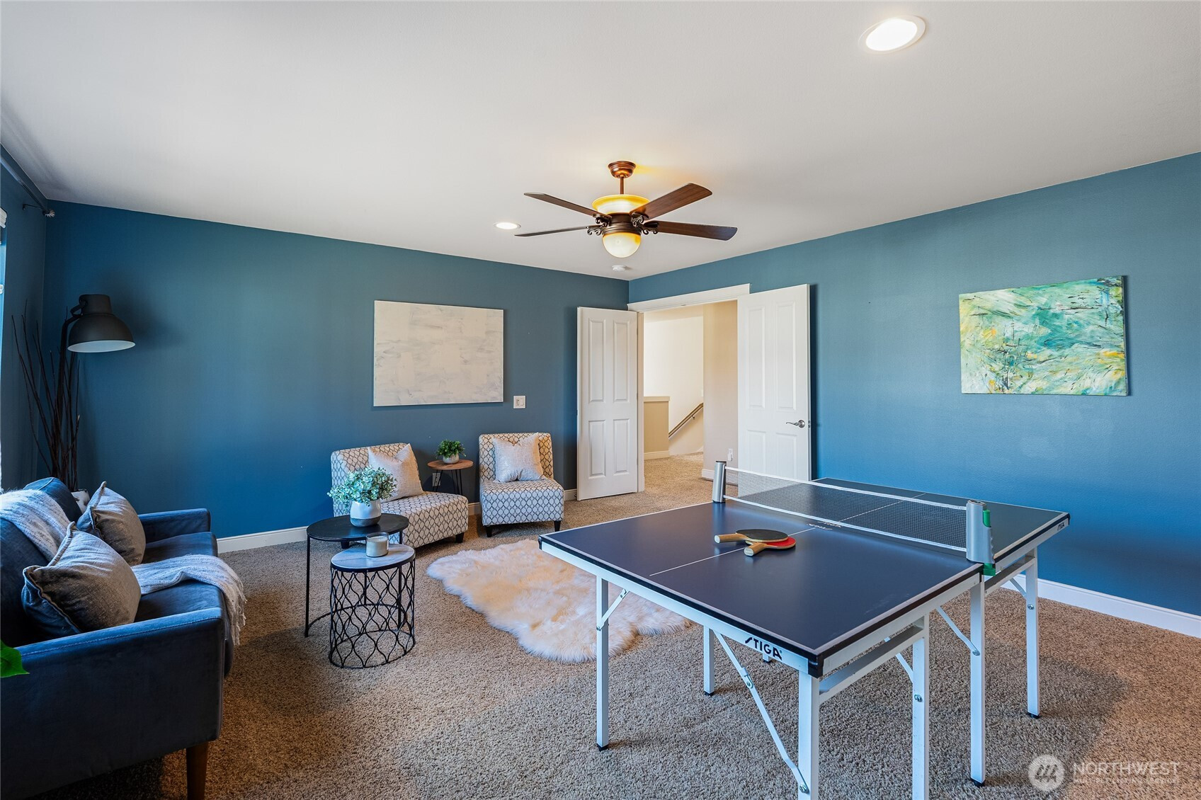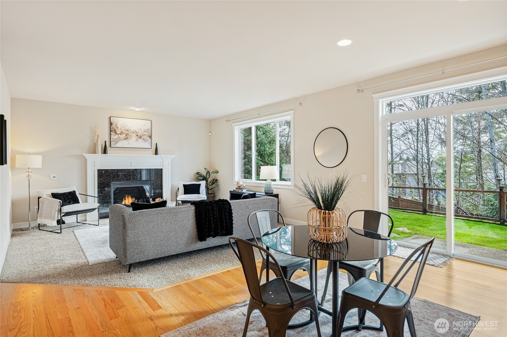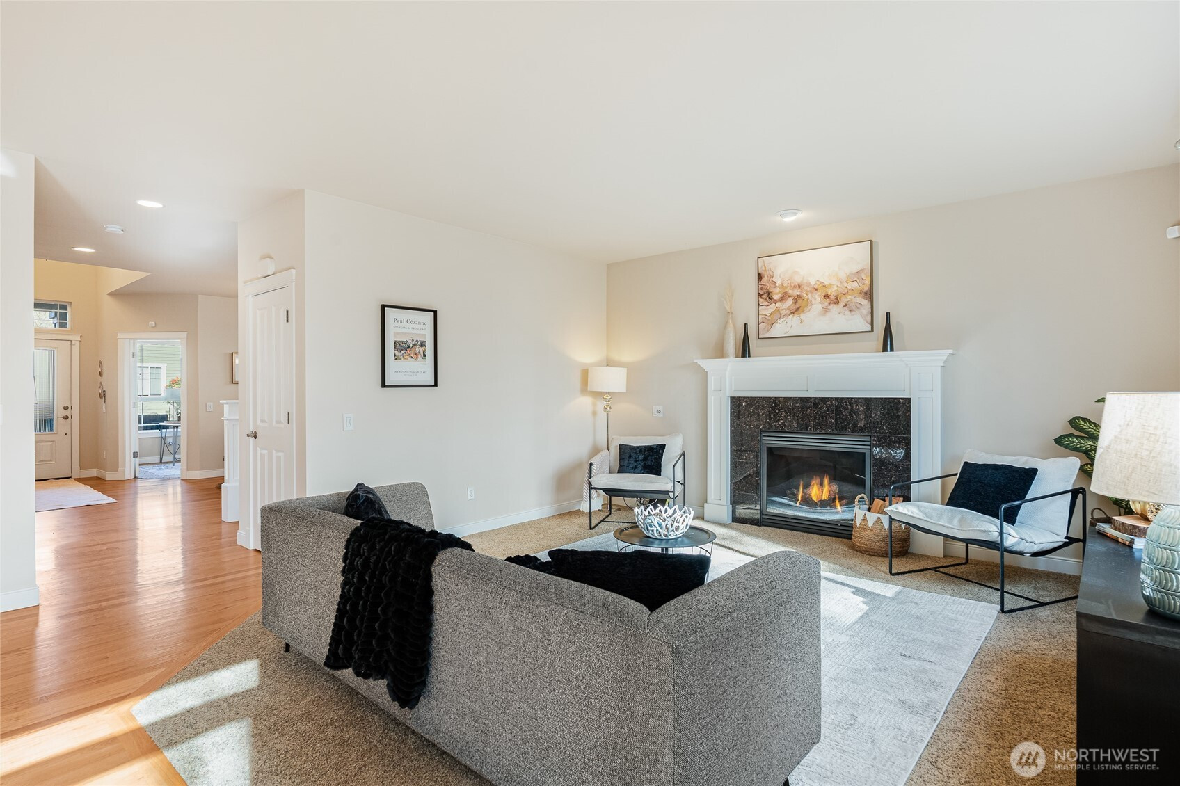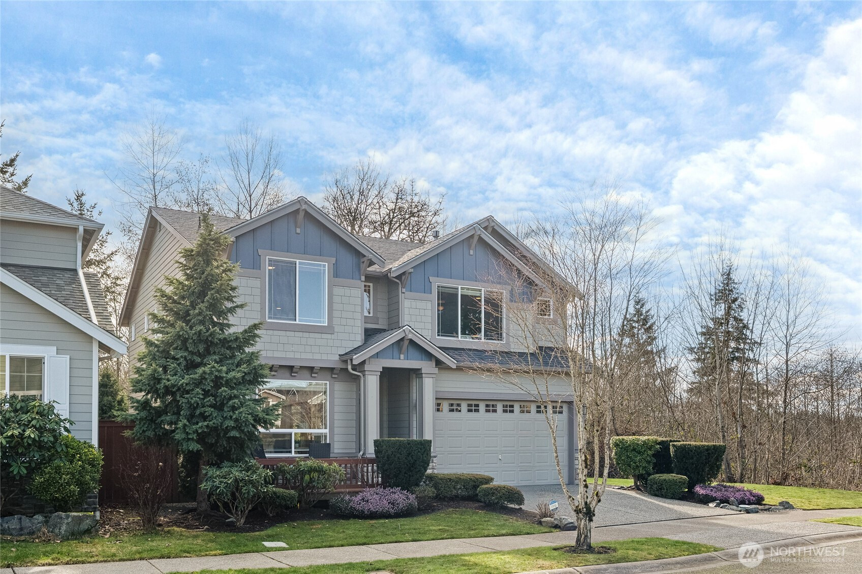 Beautifully maintained large 3 bedroom, 2.5 bath home offering a desirable open floor plan with Mt Rainier and greenbelt views. Ideally positioned on a private end lot in a quiet location, this home offers perfect commuter accessibility with added privacy in a peaceful setting. Hardwood floors welcome you through the entry and continue into the dining and living rooms where a gas fireplace creates a warm focal point. The chef inspired kitchen features cherry cabinetry, a generous granite island with gas range, newer stainless steel appliances, walk in pantry, and an eating space that flows seamlessly into the main living area. A sliding glass door connects indoor and outdoor living, opening to an expansive patio ideal for entertaining or relaxing. The main level includes a dedicated office/studio space, while upstairs, a spacious bonus room provides flexibility for guests, work, media, or play. The primary suite offers a ceramic tile bath with an upgraded large walk in shower and dual walk in closets. Two additional bedrooms, a full bath, and an open loft sitting area complete the upper level. Durable Hardi Plank siding with stone accents enhances curb appeal, while modern comforts include A/C, gas furnace and heat pump, and an attached two car garage. Ideal commuter location with easy access to i5, i405, and Green and Orange rapid transit lines. A rare blend of privacy, functionality, and views.
