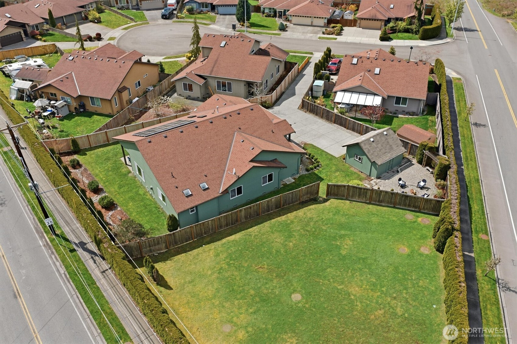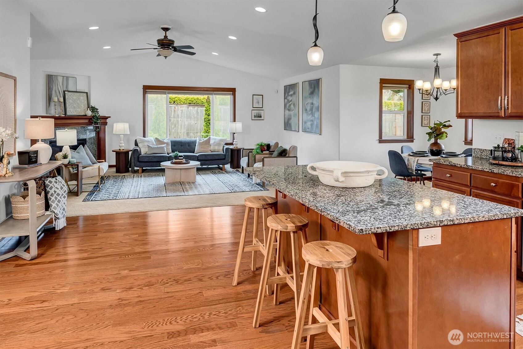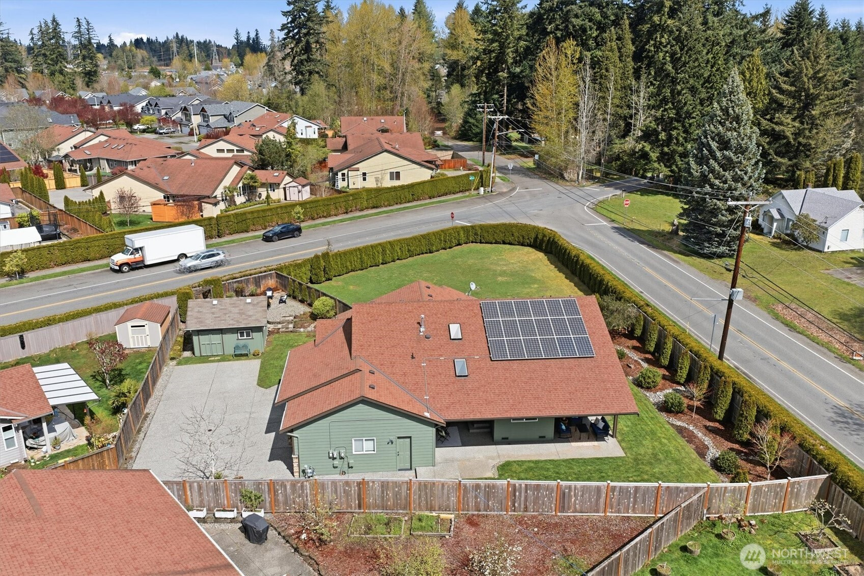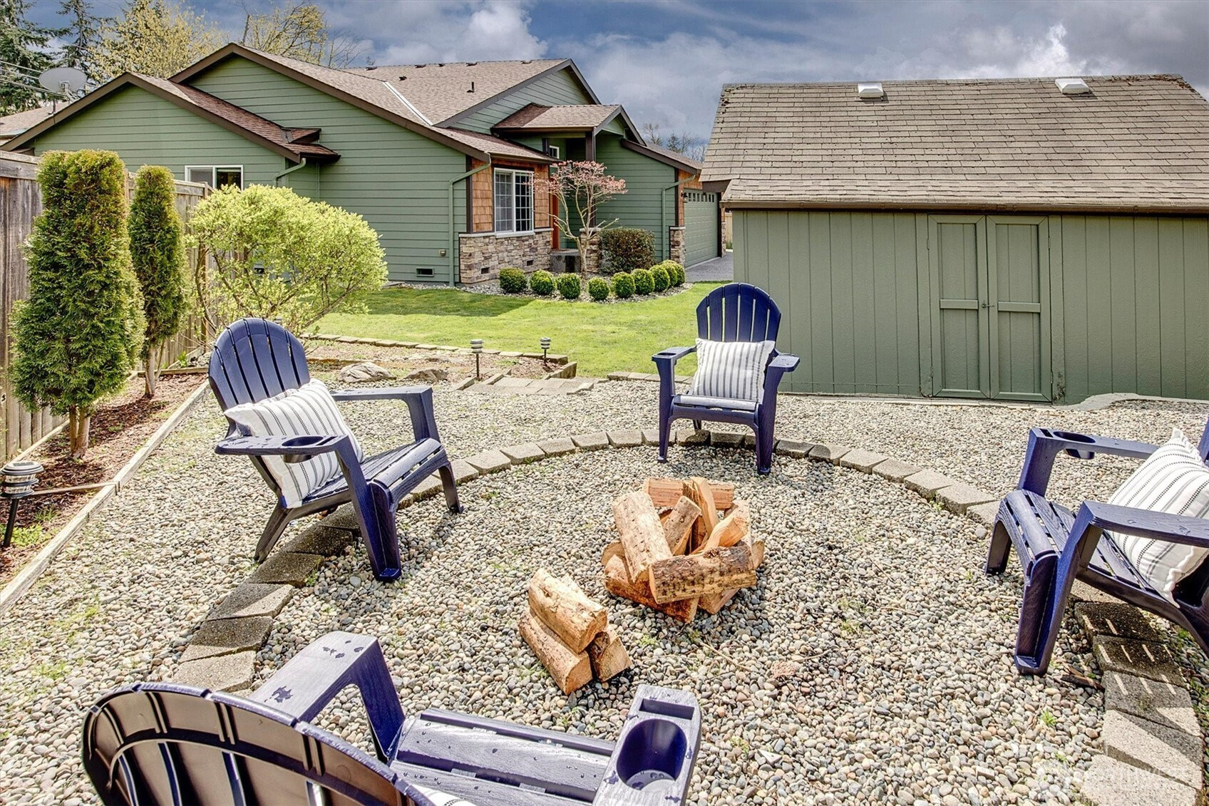 A rare opportunity to own a newer-built, recently updated true single-level rambler that seemlessly blends style and comfort. An open-concept layout enhances both entertaining and everyday living, offering a natural flow between spaces. The gas fireplace creates year-round warmth and ambiance. The kitchen features granite countertops, a spacious center island and a new LG SS appliance suite including a microwave, refridgerator, oven w/air fry & convection options and dishwasher. The primary suite offers a private en-suite bath complete with a soaking tub, Two additional bedrooms are thoughtfully arranged on a single level with no interior stairs for effortless living. Just off the entry, a dedicated office or bonus room adds flexibility. A rare 3-car garage provides abundant parking and storage. Recent updates include fresh interior and exterior paint, along with energy-efficient solar panels, skylights that bring in natural light, and stylish updated sconce lighting throughout the hallways. This home is ideally positioned adjacent to a private spacious community lawn, perfect for large gatherings and entertainment. A spacious workshop and an additional storage shed. Covered outdoor areas provide the perfect setting for BBQ's, as well as a firepit for summer nights or year-round enjoyment. Just minutes from Mill Creek shopping and amenities. EZ access to I-5 & I-405 ensures seamless commuting and connectivity!