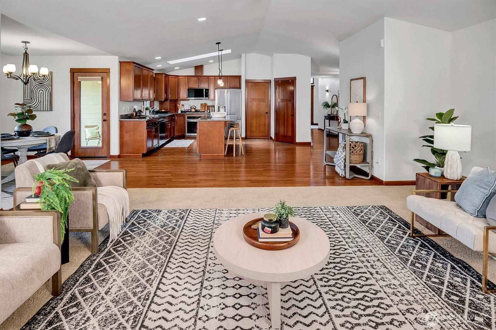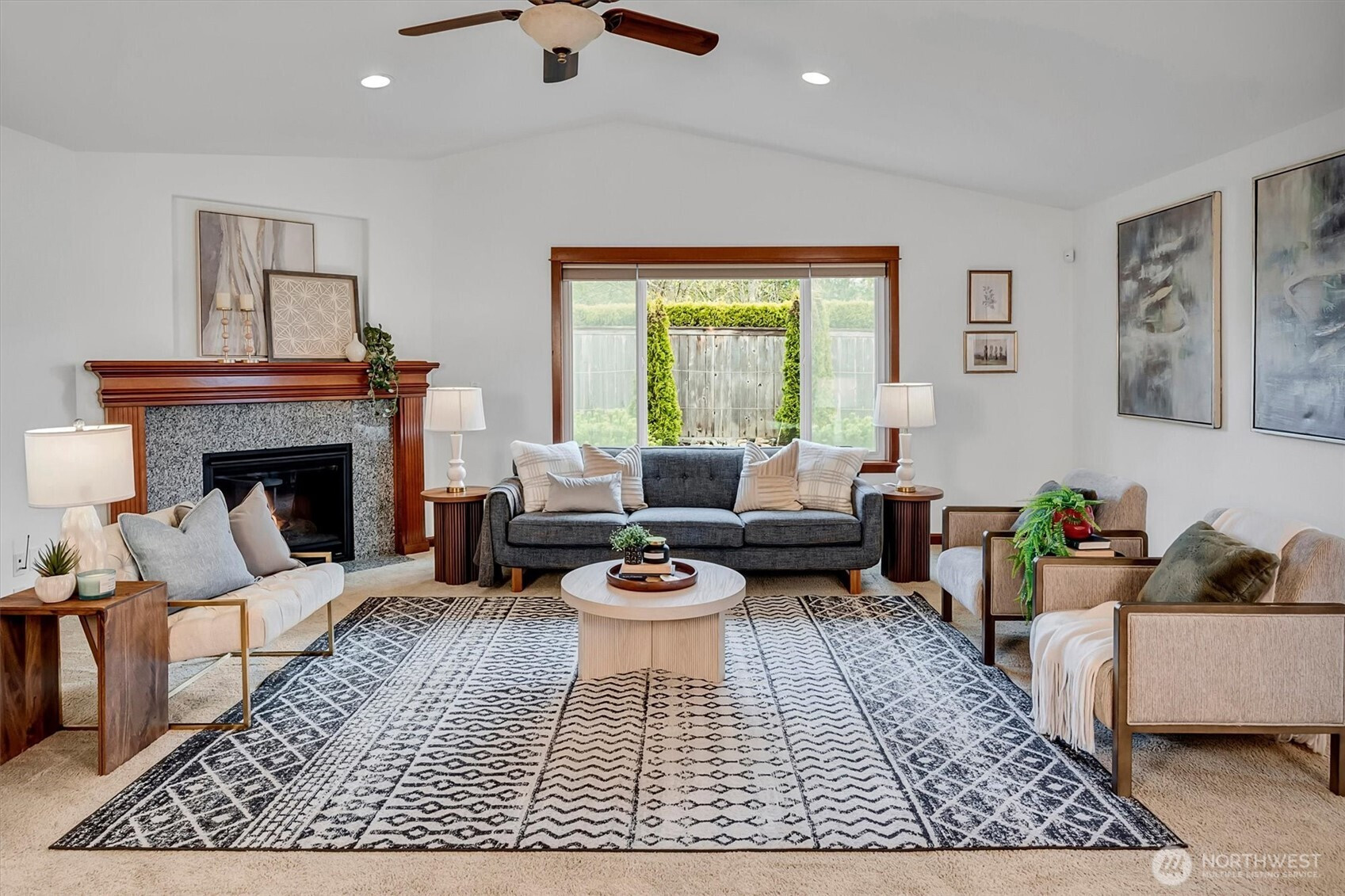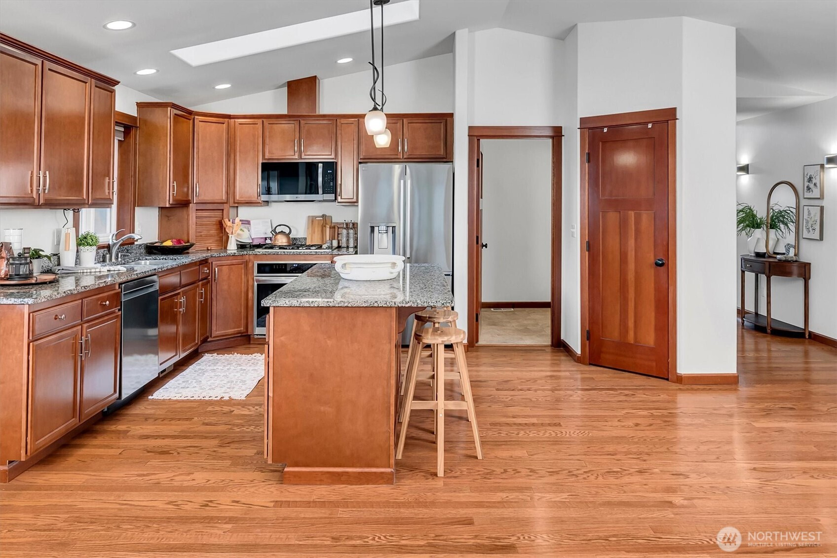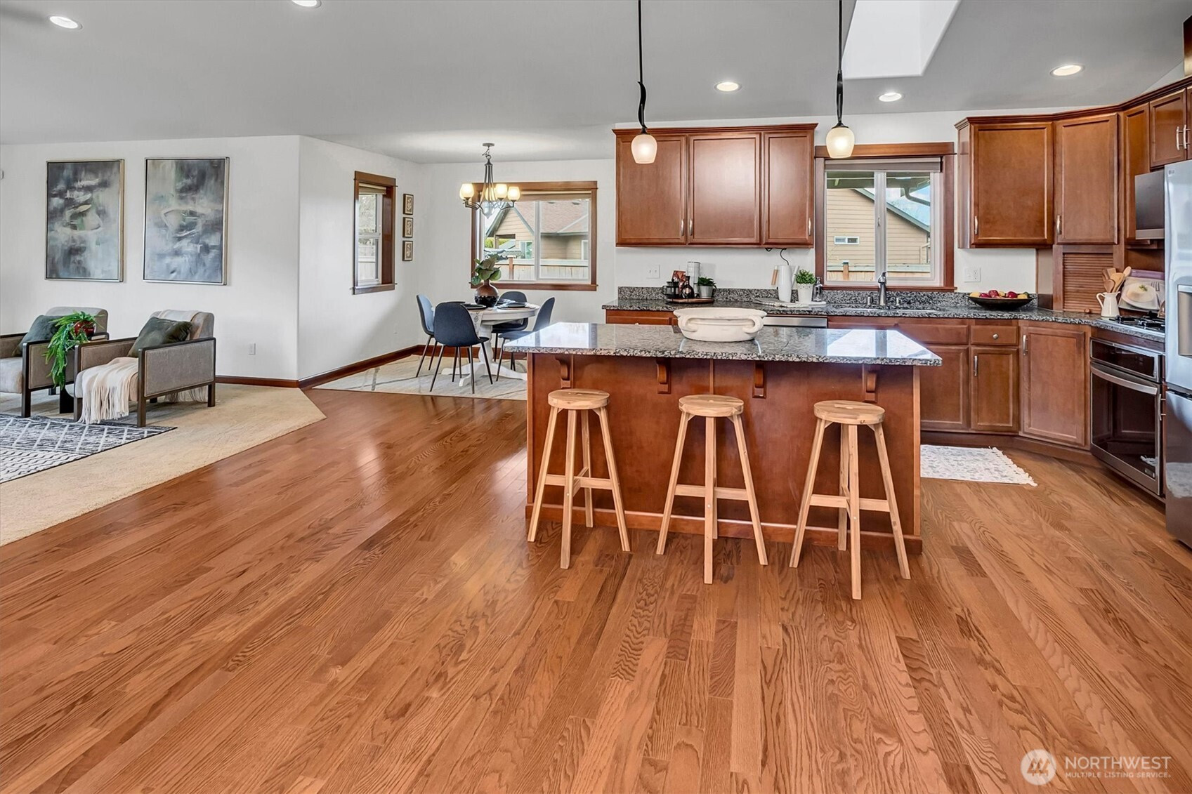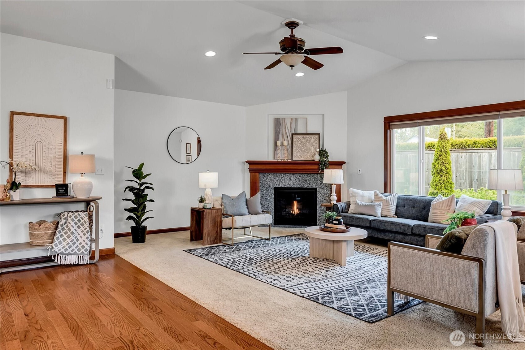 A rare opportunity to own a newer-built, recently updated true single-level rambler that seemlessly blends style and comfort. An open-concept layout enhances both entertaining and everyday living, offering a natural flow between spaces. The gas fireplace creates year-round warmth and ambiance. The kitchen features granite countertops, a spacious center island and a new LG SS appliance suite including a microwave, refridgerator, oven w/air fry & convection options and dishwasher. The primary suite offers a private en-suite bath complete with a soaking tub, Two additional bedrooms are thoughtfully arranged on a single level with no interior stairs for effortless living. Just off the entry, a dedicated office or bonus room adds flexibility. A rare 3-car garage provides abundant parking and storage. Recent updates include fresh interior and exterior paint, along with energy-efficient solar panels, skylights that bring in natural light, and stylish updated sconce lighting throughout the hallways. This home is ideally positioned adjacent to a private spacious community lawn, perfect for large gatherings and entertainment. A spacious workshop and an additional storage shed. Covered outdoor areas provide the perfect setting for BBQ's, as well as a firepit for summer nights or year-round enjoyment. Just minutes from Mill Creek shopping and amenities. EZ access to I-5 & I-405 ensures seamless commuting and connectivity!