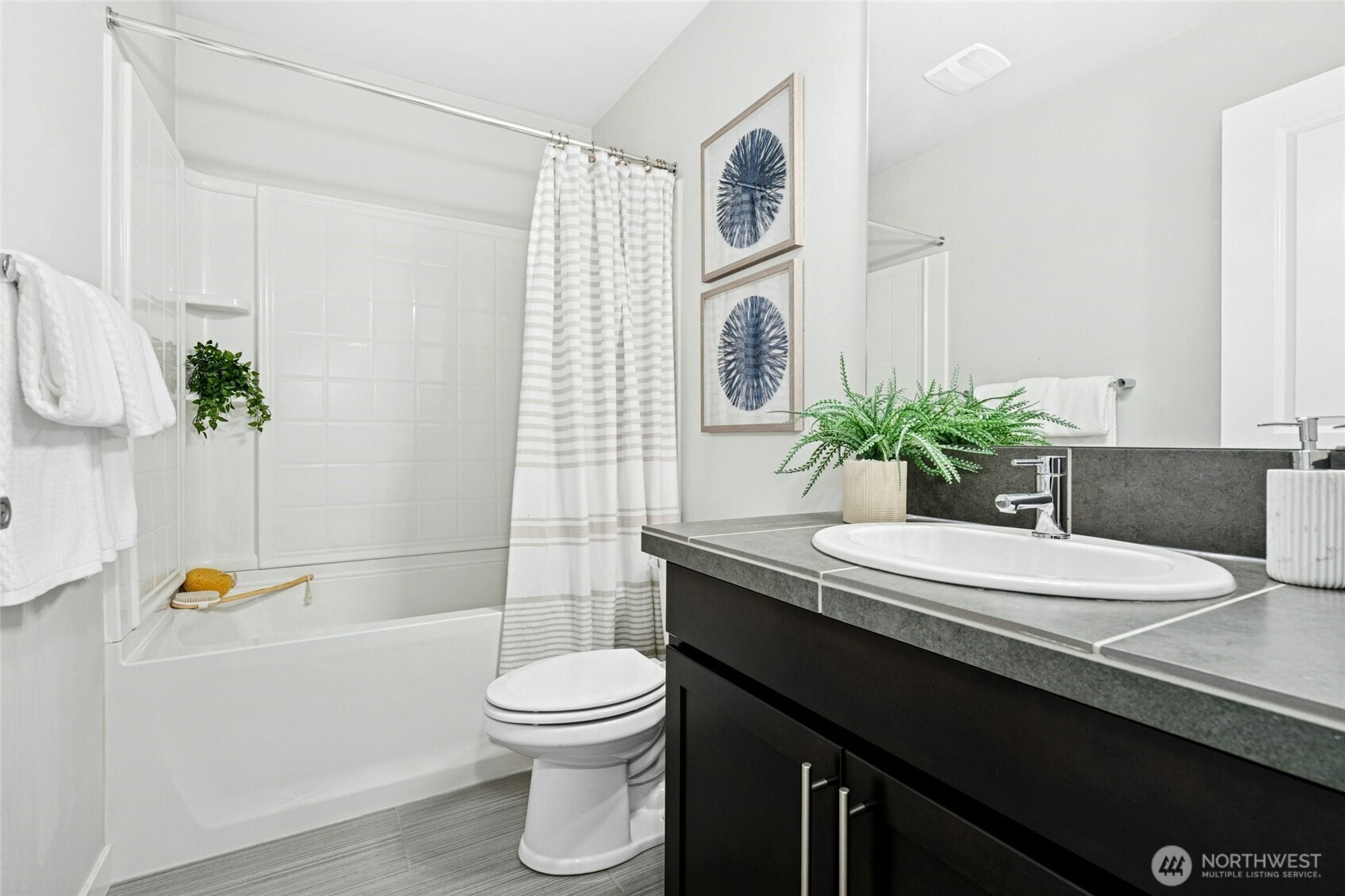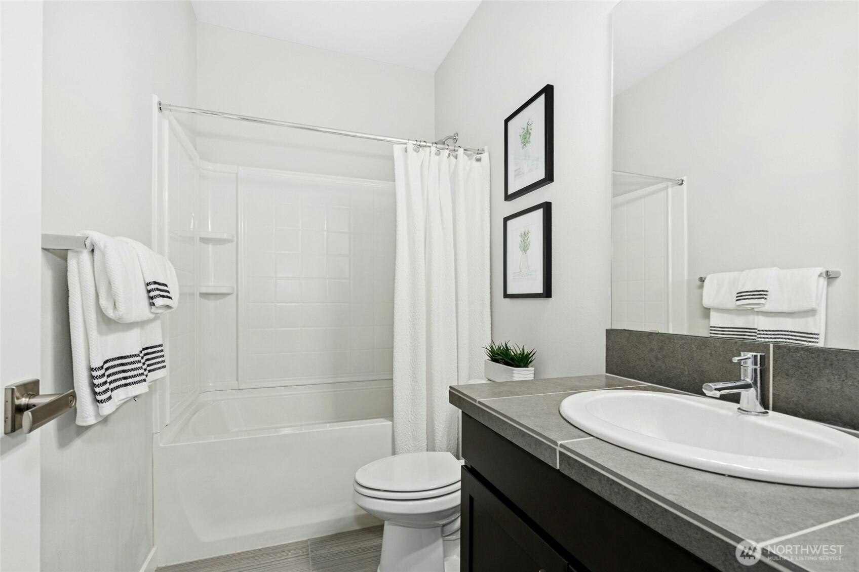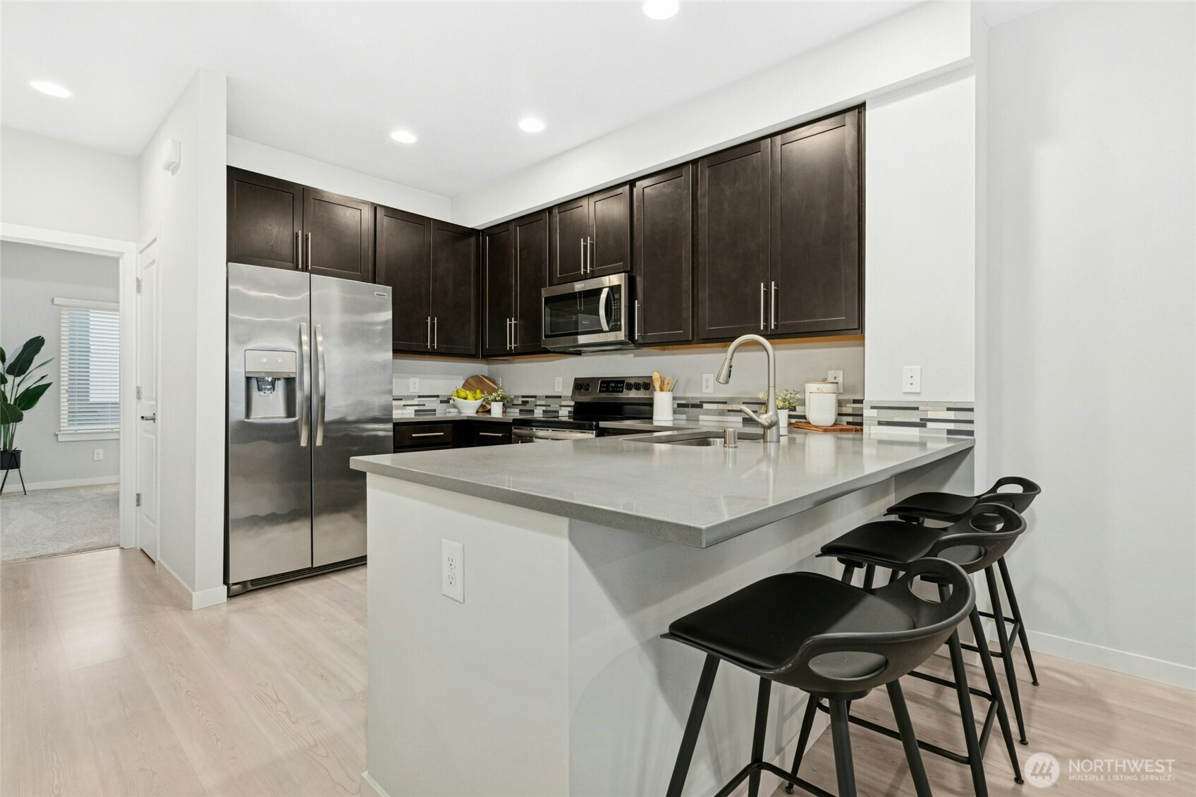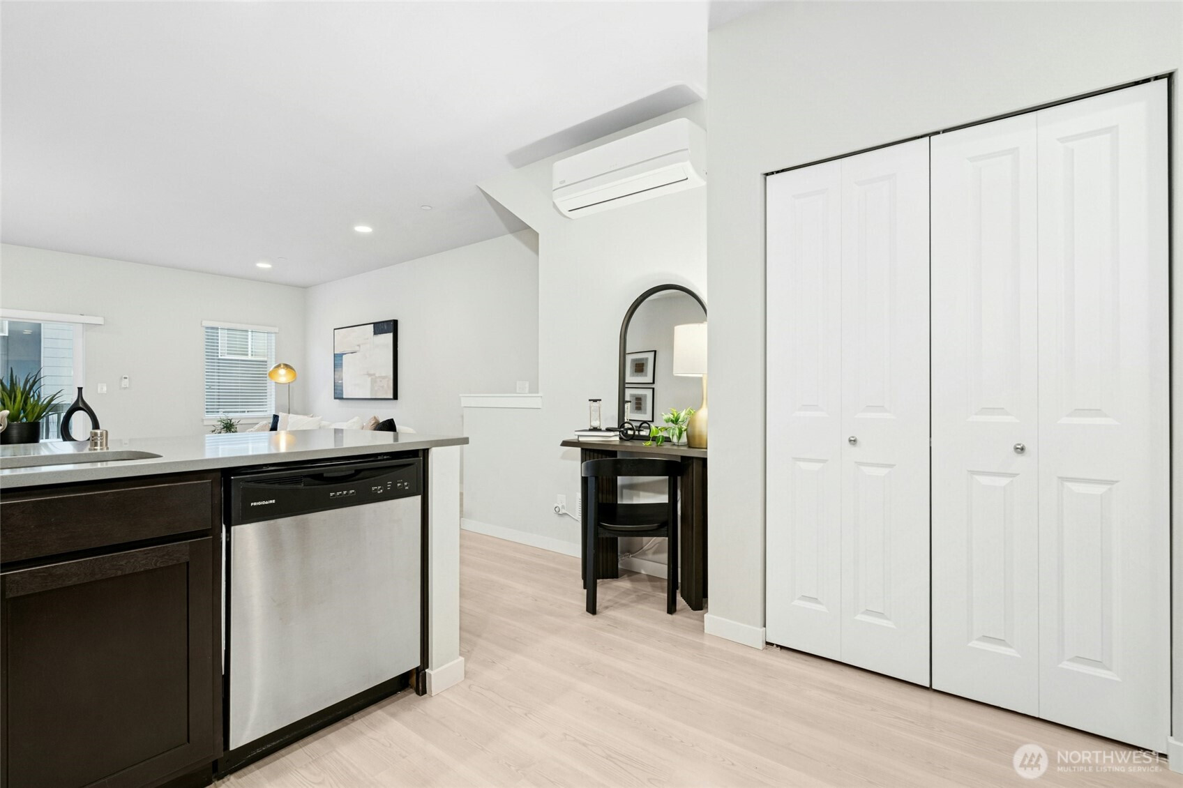 Best-value Lynnwood townhome offering modern design, flexible living, and an exceptional location. Nestled in a quiet, well-maintained community, this home is minutes to I-5 and I-405—convenient for commuting yet peaceful with no freeway noise. A Microsoft shuttle stop is just 0.5 miles away, and Ziply Fiber internet is available, ideal for today’s work-from-home or hybrid lifestyle. Enjoy close proximity to Ash Way Park & Ride, Lynnwood Light Rail Station, Alderwood Mall, Martha Lake, dog parks, everyday conveniences, and easy access to the Interurban Trail for walking, running, or biking. This move-in-ready, like-new townhome features an open-concept layout with a spacious kitchen, dining, and living area opening to a private deck. A main-level bedroom with a full bath offers flexibility for guests, a home office, or multigenerational living. Upstairs, the light-filled primary bedroom provides a relaxing retreat, while the third bedroom includes a walk-in closet. The two-car tandem garage offers extra space for storage, a home gym, or workspace. High-end finishes include quartz countertops, stainless steel appliances, luxury laminate flooring, tiled bathrooms, in-unit washer and dryer, and a mini-split system for efficient year-round comfort. Community amenities include a playground, outdoor fitness station, and guest parking. With no rental cap, this like-new townhome is an outstanding opportunity for both homeowners and investors. Pre-inspected!