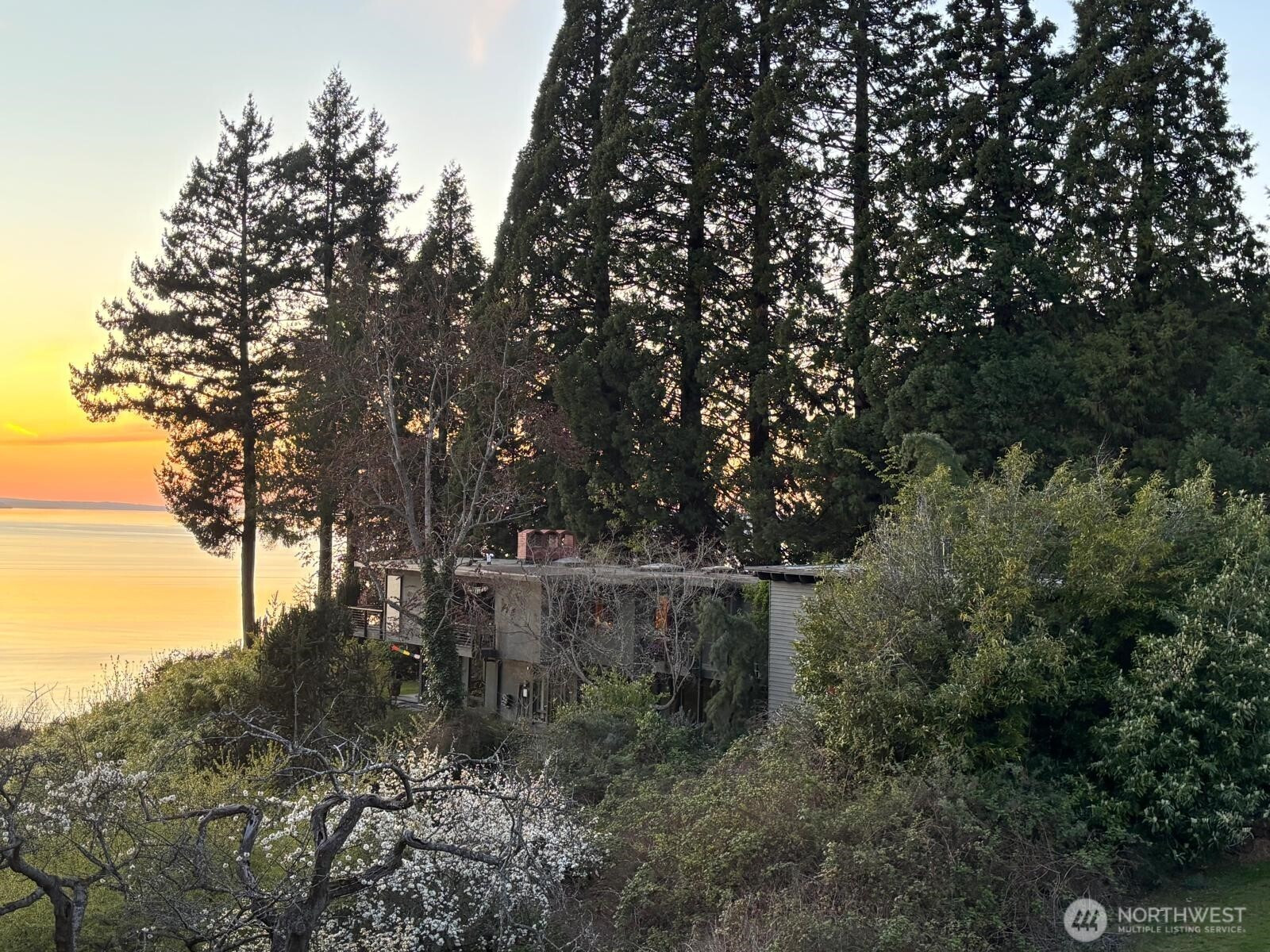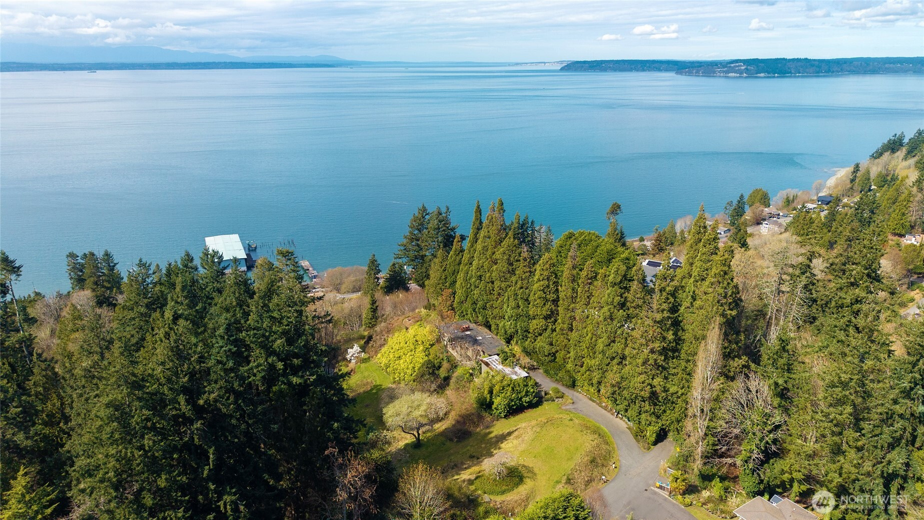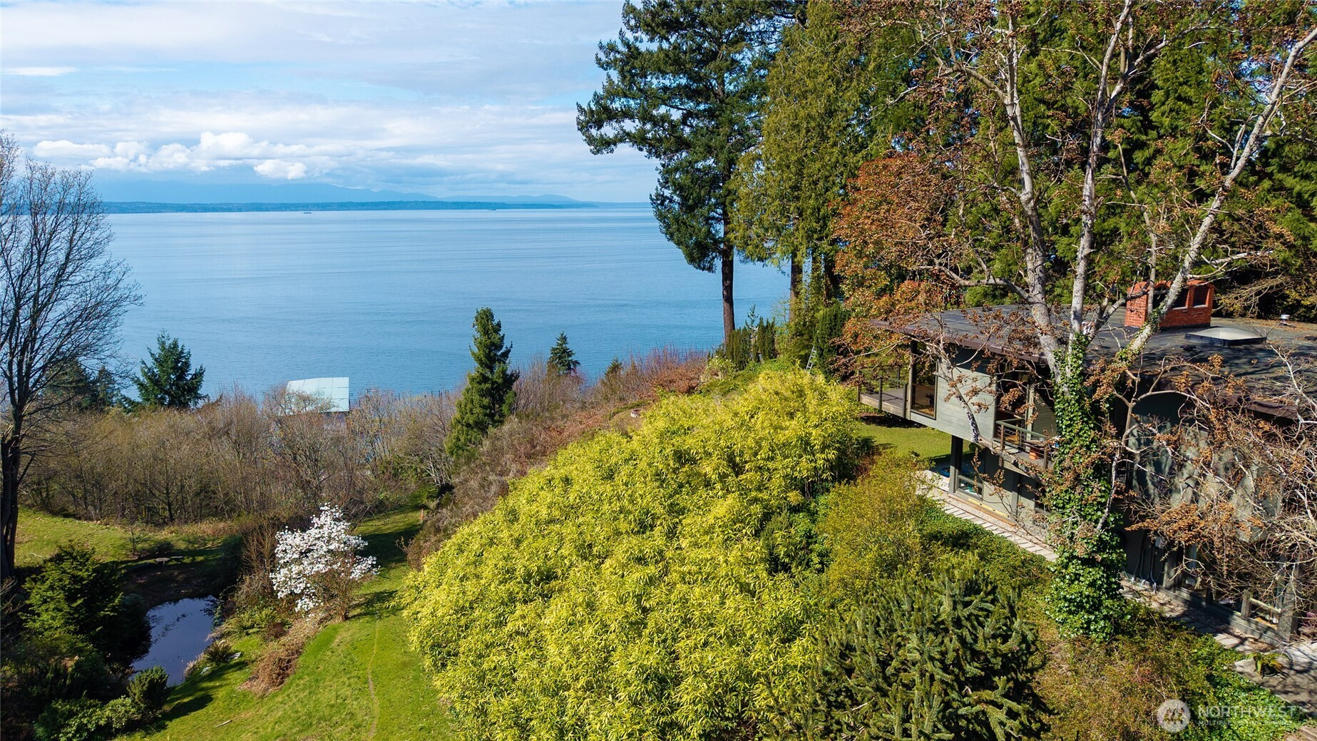 Greenness is a private four lot residential park ~ 20 miles north of Seattle on Puget Sound’s coast. It’s centrally located and when traffic’s light ~ 30 minutes to downtowns Seattle, Bellevue, or Everett. Lot I is Greenness’ most favored and includes the top, west, and south slopes of its own coastal promontory rising up from a vibrant wildlife refuge stretching along the steep coastal bluff with unobstructed solar access and spectacular panoramic views of the Olympic Mountains and Peninsula, Whidbey Island, and Admiralty Inlet. Its house was conceived, designed, and largely built in 1962 by Grace LaRose, a very brave, artistic, and determined woman. Like many other Northwest artists, architects, and design thinkers, Grace was drawn to the time’s most contemporary international design style from Germany and Japan with its more open, functional, flexible, and minimalistic floor plans and expansive view windows interconnecting interior and exterior spaces that became so popular throughout the world. Perfectly aligning and recessing the house’s steel reinforced concrete daylight basement into the site’s slopes, Grace provided unobstructed solar access to heat the earth sheltered thermal mass below. With an advanced custom fireplace and 4’ overhangs to block summer’s sun, it could be the Northwest’s first resource conserving earth sheltered passively solar heated house. Since purchasing the estate 31 years ago, the owners have made several improvements and have plans for more.