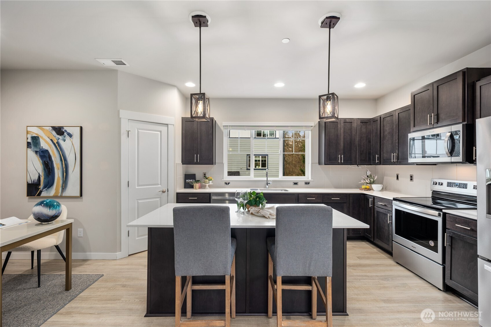 Zoned for Woodside Elementary (rated 9) and Henry M. Jackson High School (rated 9), this home sits on a PREMIUM CORNER LOT W/PRIVACY in one of the most desirable pockets of the community—set on a quiet dead-end street with three-side open views and exceptional natural light with no neighboring building obstructions. Take in serene pond views from the deck and balcony, and enjoy an indoor dining area that keeps the outlook wide open with no visual blockers. Comfort and convenience shine through thoughtful upgrades, including ceiling fans in three bedrooms, custom designer closets in the primary suite and one guest bedroom, and an insulated garage finished with premium epoxy-coated flooring. Both the primary bath and an additional full bath feature bidet systems, with a heated seat in the primary for an extra touch of everyday luxury. Just minutes to Mill Creek Town Center for shopping, dining, and coffee, plus quick access to essentials like Safeway and Fred Meyer. Nearby parks and trail options—including the North Creek Trail—make it easy to step outside and recharge. PRE-INSPECTED!!