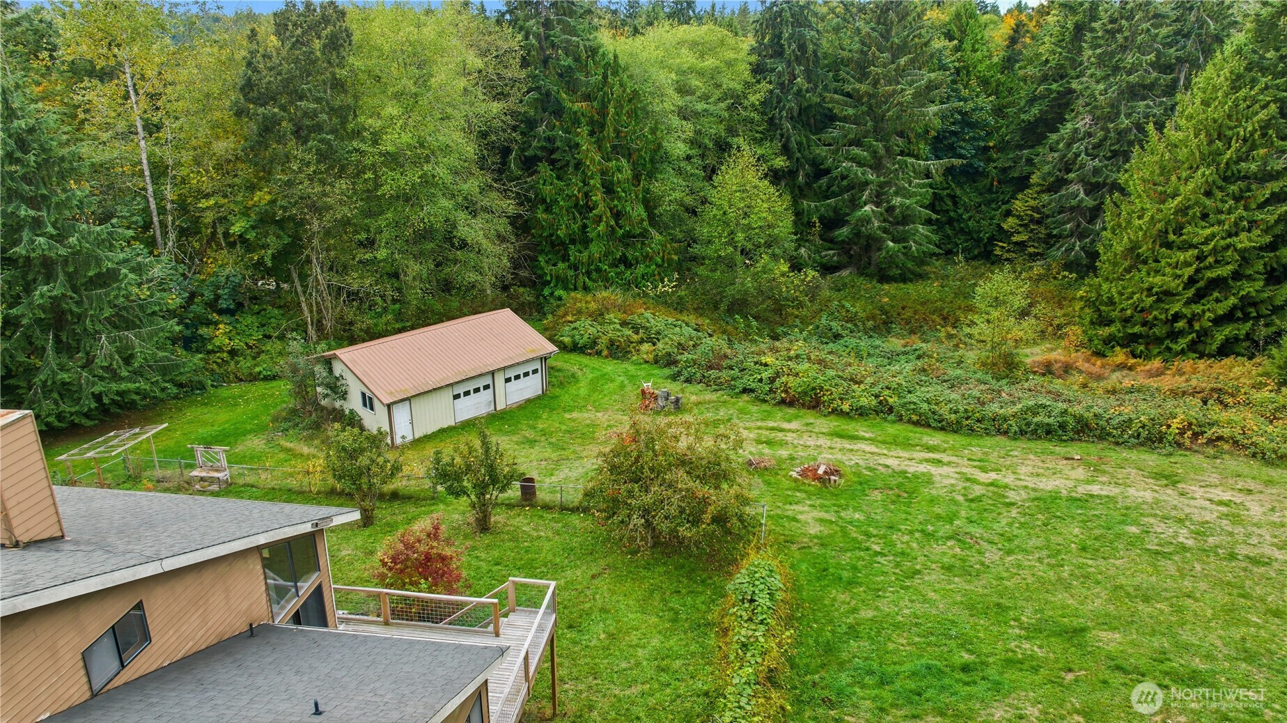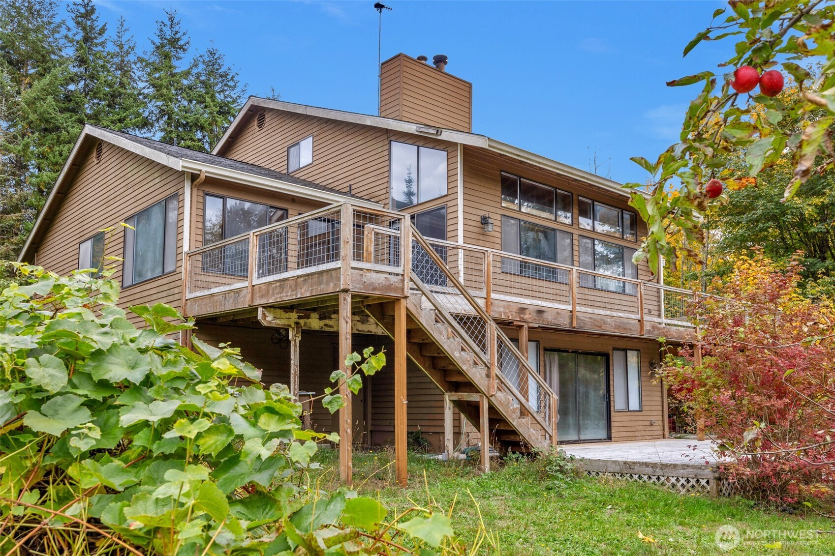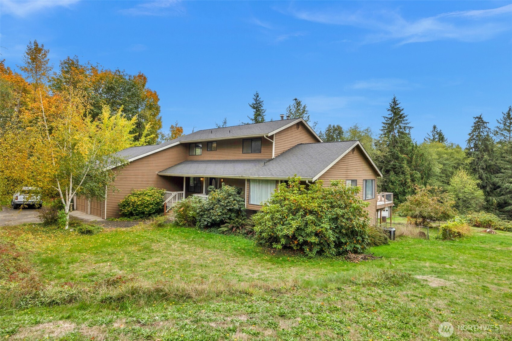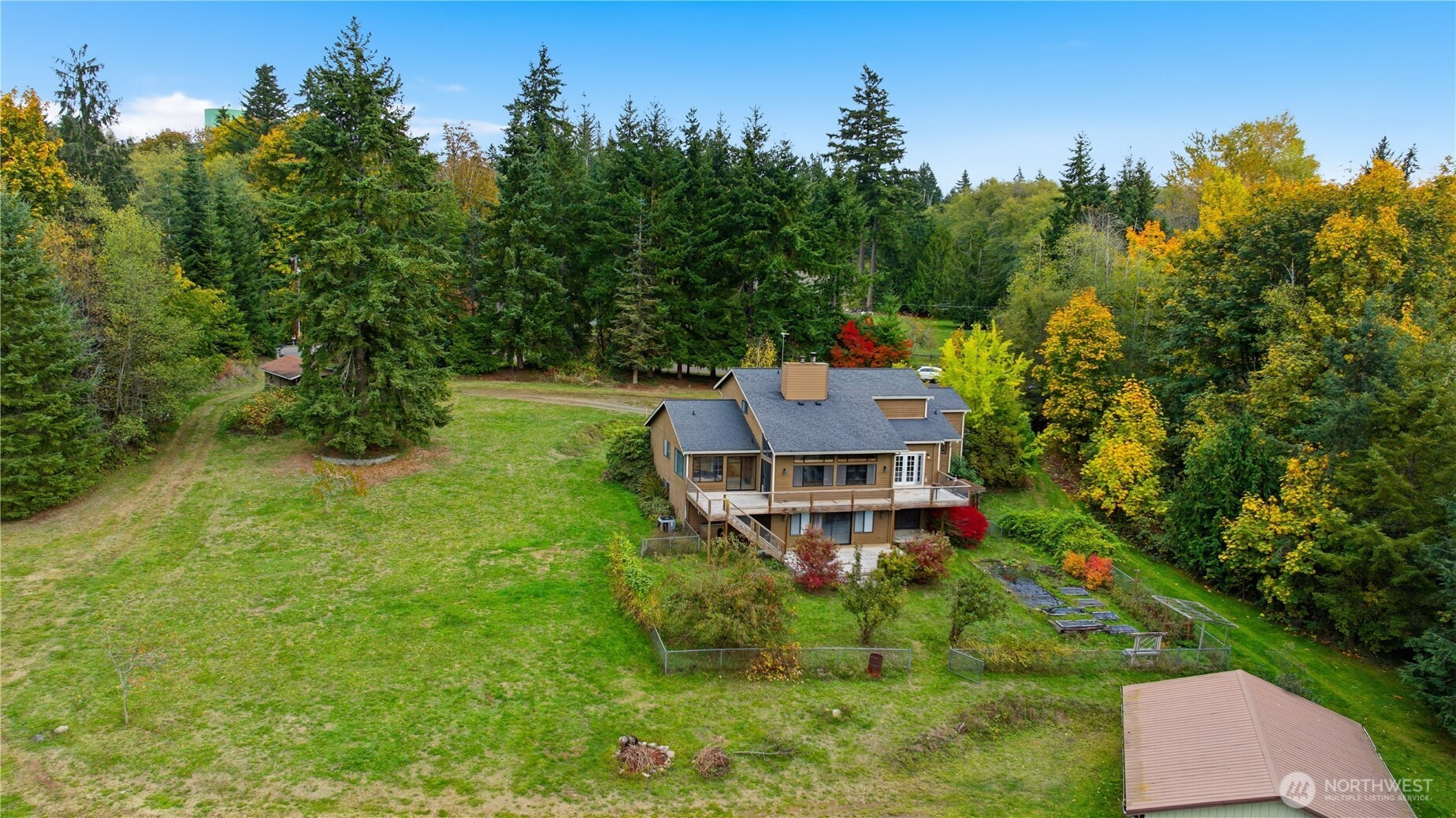 Peaceful living on just shy of 5 private acres in prestigious Kayak Estates. This 4000 sqft home offers 4-beds, 4 baths multiple living areas and great room with soaring ceilings and walls of windows that fill the space with natural light. Updated Kitchen offers plenty of storage, custom cabinetry & views of the surrounding trees. French doors open to a huge deck perfect for entertaining. Basement w/ separate entrance and kitchen offers potential for a mother-in-law suite or rental. Detached 24x30 garage, chicken coop, little barn, fruit trees, marketable timber & endless possibility for gardening, hobbies, or projects in multiple outbuildings. Just needs a little updating. Its the largest home on acreage with a detached shop on the market!
