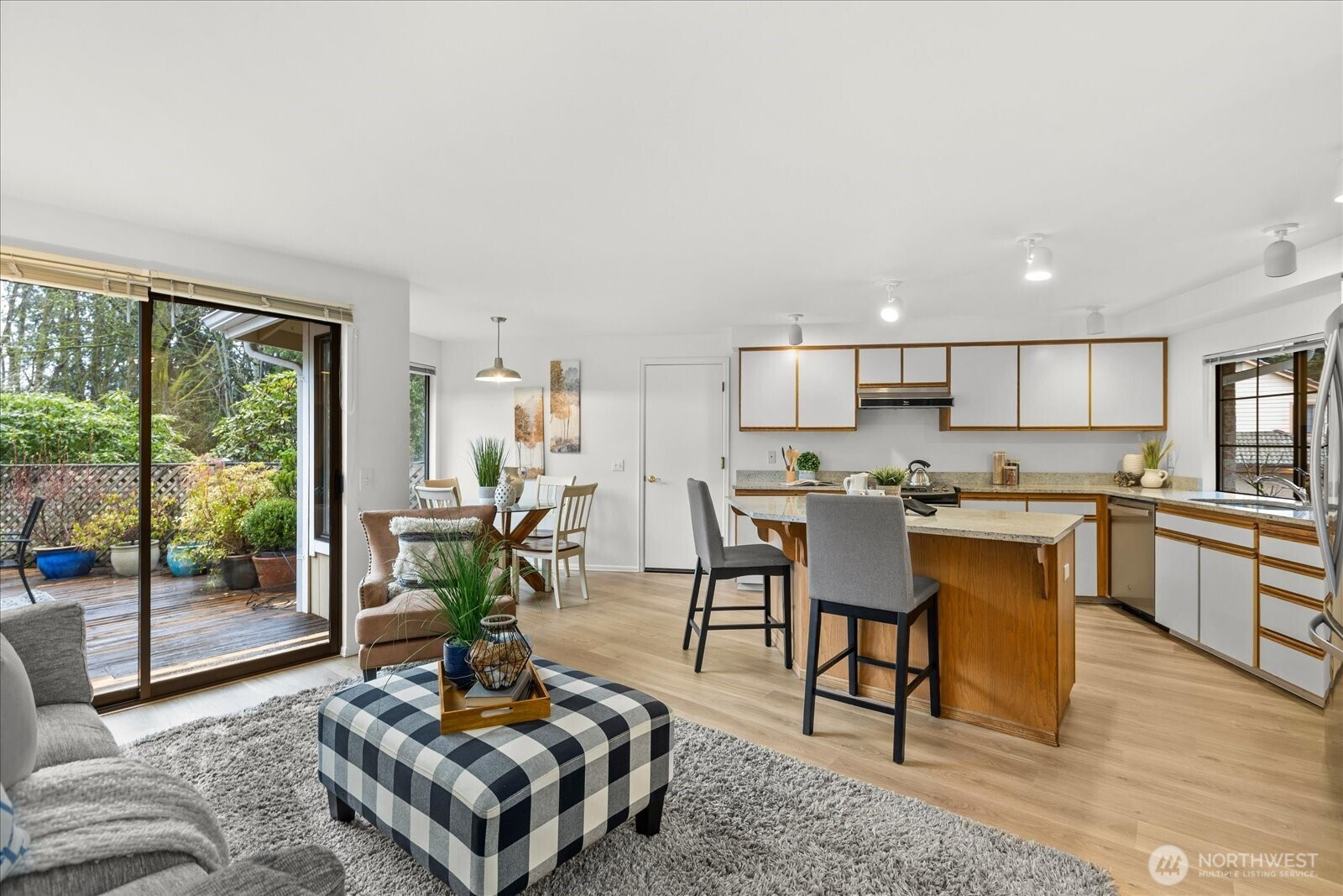 Welcome to this beautifully refreshed rambler in the desirable Emerald Heights neighborhood of Mill Creek! This 2-bedroom, 2-bath home shines with fresh interior paint and brand-new flooring throughout, offering a clean and fresh feel from the moment you step inside. Vaulted ceilings in the living and dining areas create a bright, open atmosphere, perfect for everyday living and entertaining. Cozy living space off of the open kitchen area and eating space. The primary suite features access to deck, a walk-in closet and a 5-piece bath with separate water closet. Enjoy the convenience of a full-size laundry room, a fully fenced yard, and dedicated garden space—ideal for relaxing or cultivating your green thumb. This move-in ready home combines comfort, functionality, and low-maintenance living in a sought-after community close to parks, shopping, and amenities. Pre-inspected for buyer convenience!