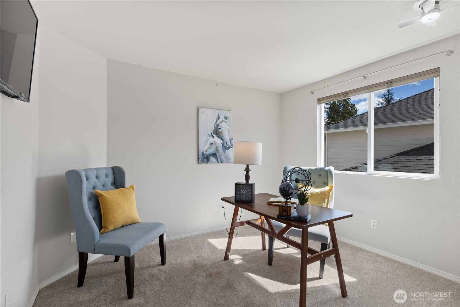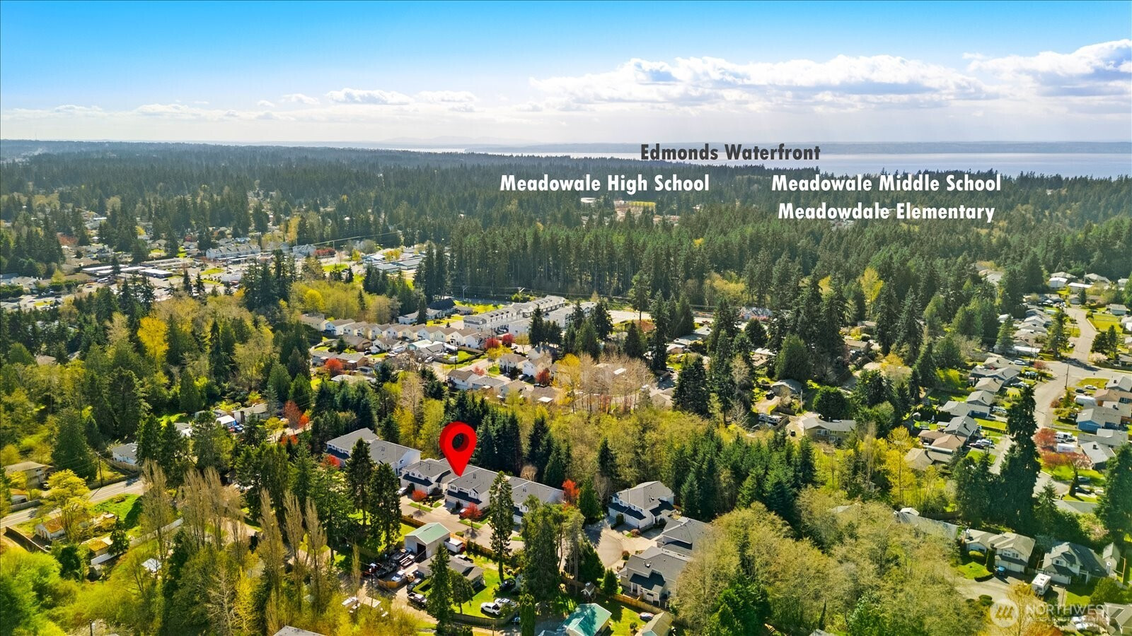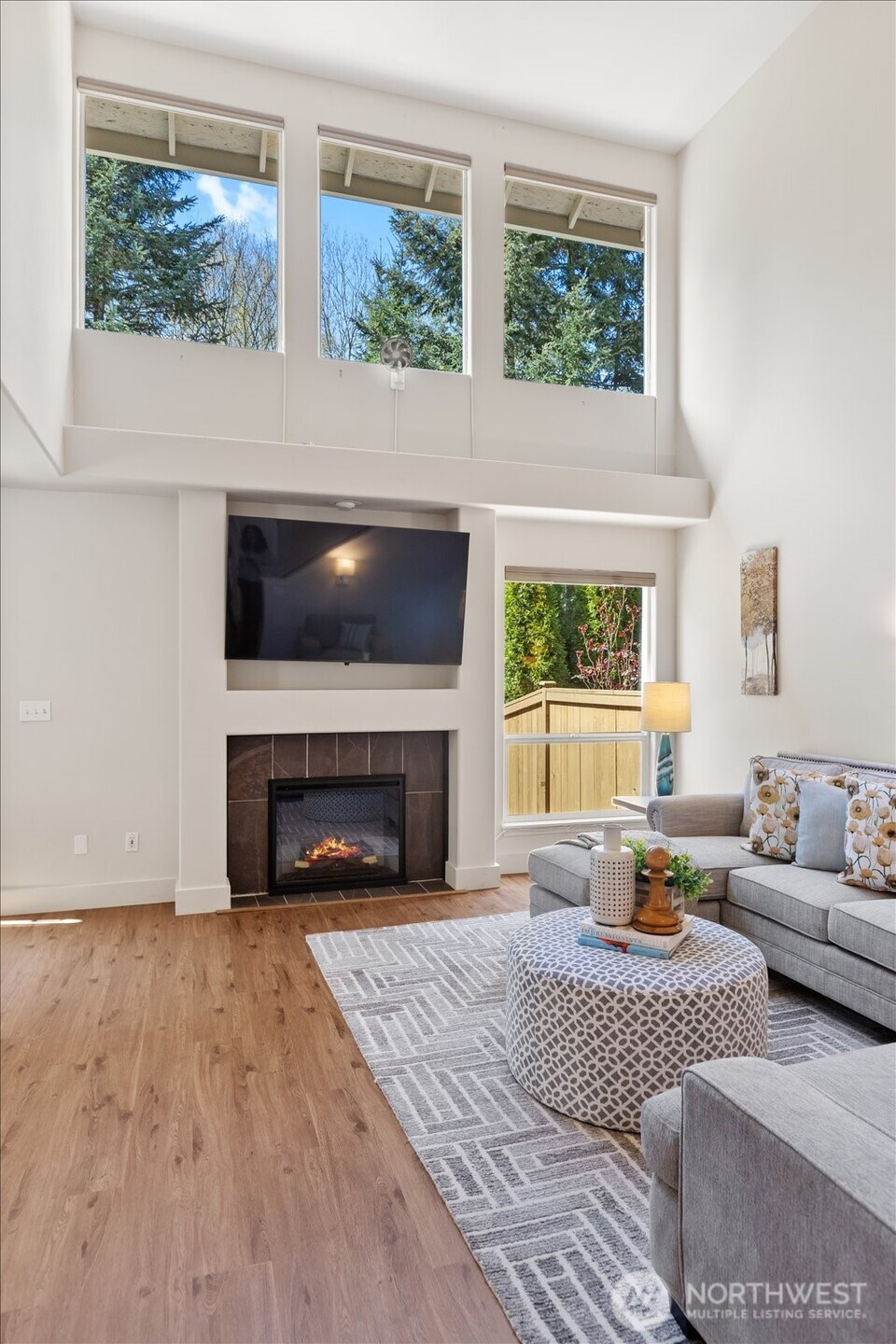 Discover refined comfort in this beautifully maintained three-bedroom townhome in Edmonds, designed to live like a detached two-story residence. Tucked toward the end of a quiet cul-de-sac and surrounded by mature trees, Tannenbaum is an intimate enclave of just 16 duplex-style homes bordering a serene greenbelt. Thoughtfully designed interiors are filled with natural light. The inviting living room showcases soaring ceilings, expansive windows, and a cozy electric fireplace—creating a warm yet airy gathering space. The main level also features a dining area, convenient utility room, and powder bath for effortless everyday living. Upstairs, you’ll find three spacious bedrooms, including a well-appointed primary suite, along with two full bathrooms and abundant storage throughout. Step outside to a fully fenced backyard retreat with a grassy area and patio—ideal for relaxing, entertaining, or enjoying the peaceful natural surroundings. Residents enjoy direct access to nearby nature trails, enhancing the sense of tranquility. The HOA provides exterior maintenance, lawn service, water, and sewer, offering low-maintenance living in a private setting—just minutes from shopping, dining, and all that Edmonds has to offer.