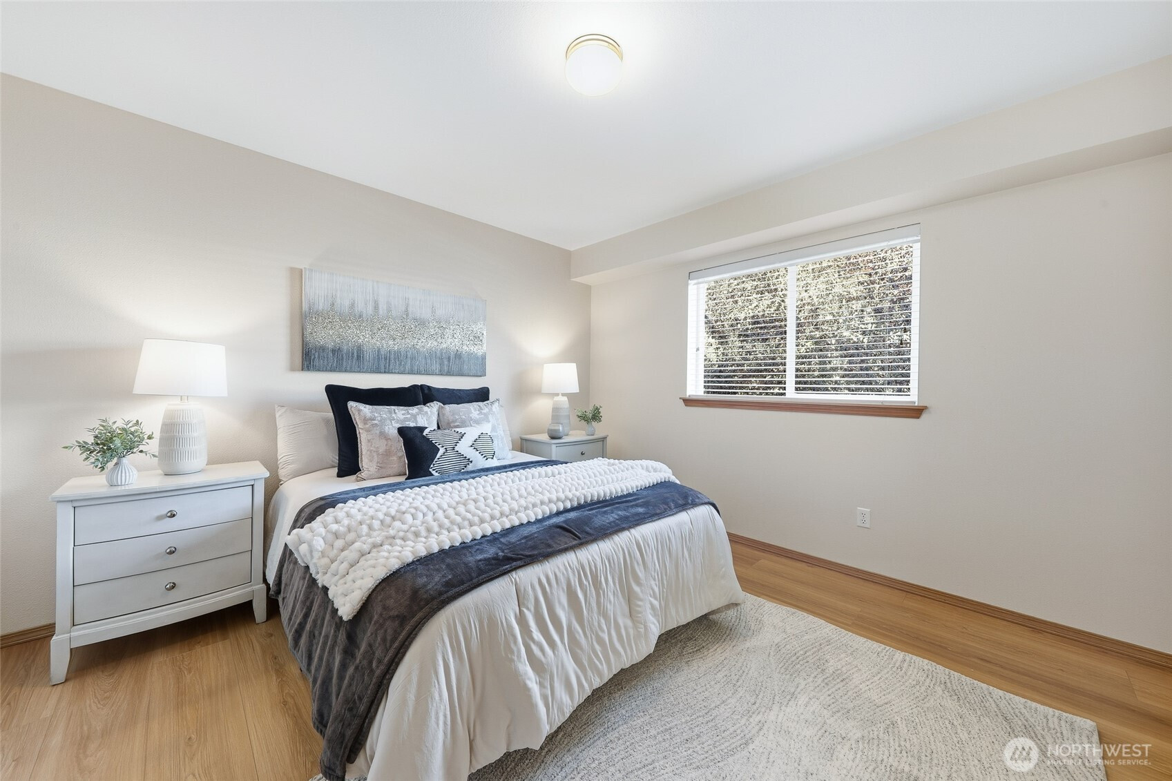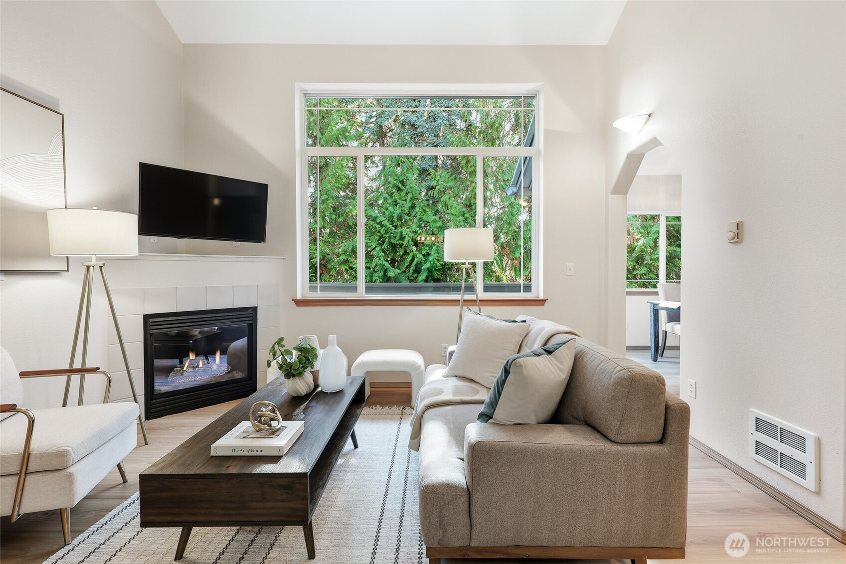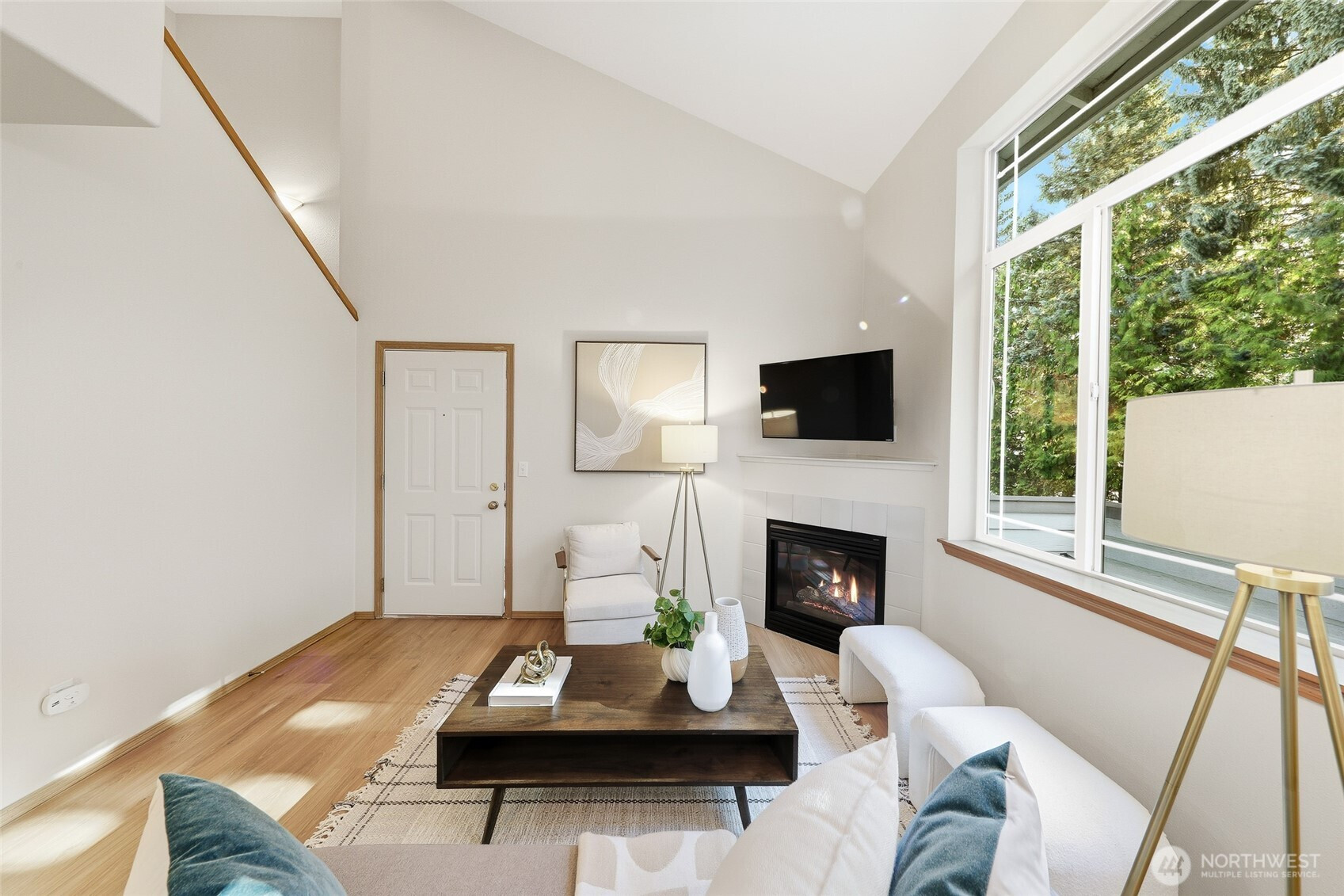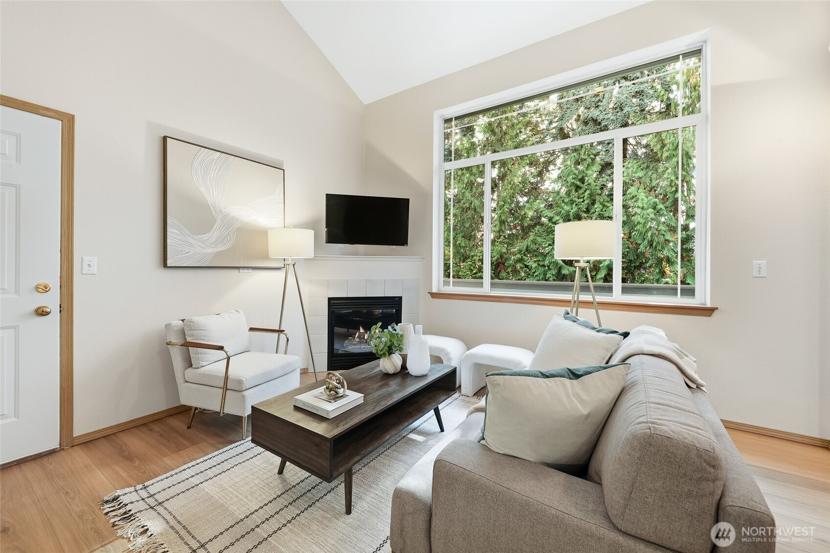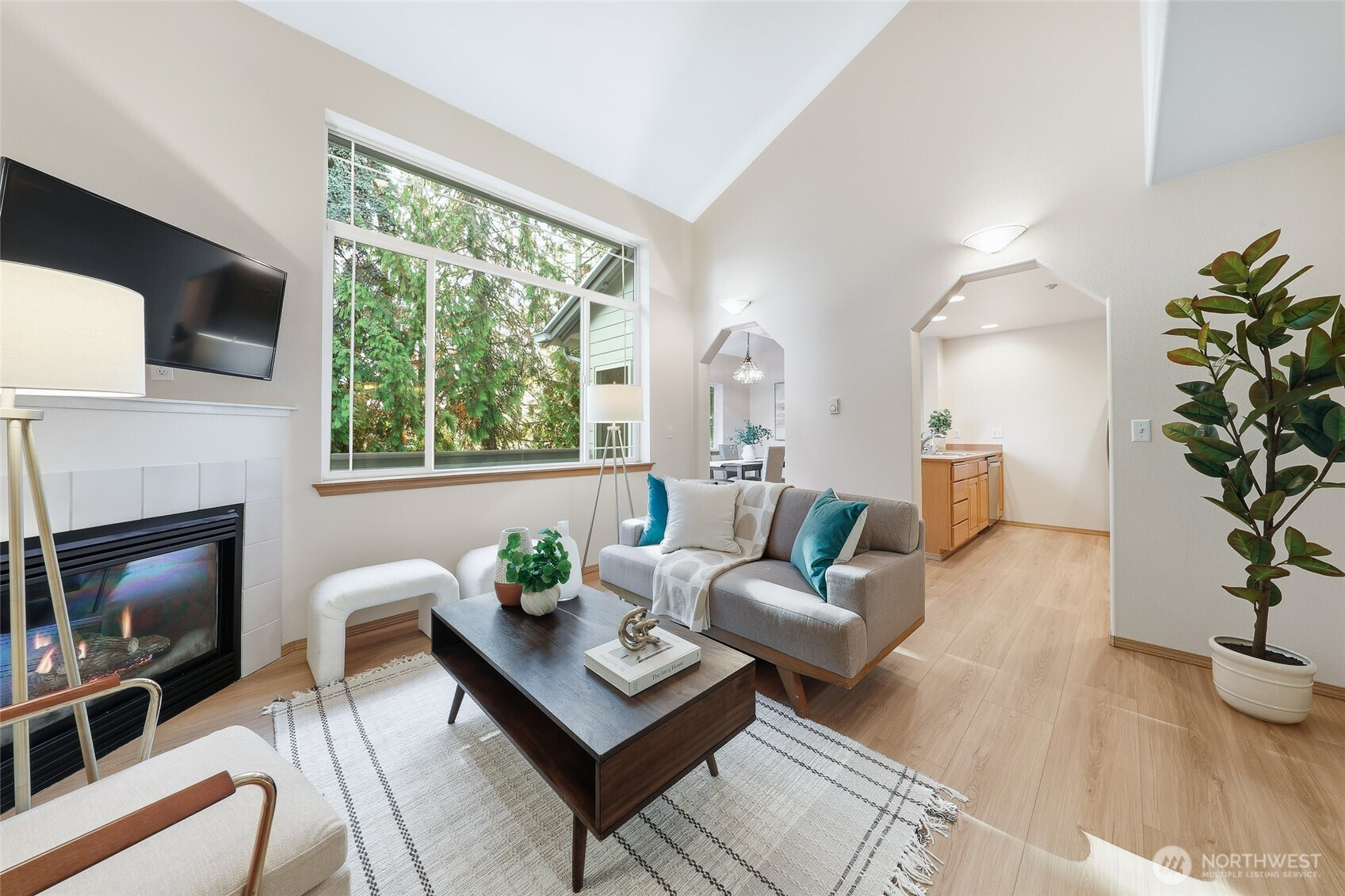 Experience elegant living in this beautifully updated 3 bedroom, 2 bath townhome-style condo, thoughtfully designed for comfort & style. A main-floor bedroom adds convenience, while soaring vaulted ceilings & a cozy gas fireplace create a warm, inviting atmosphere. Freshly painted with new flooring throughout & new appliances, the home is truly move-in ready. The dining area opens to a private deck overlooking a tranquil, tree-lined setting. Exceptional extras include a private garage (oversized), bonus carport & an expansive 11’3"x 10'11" storage rm—perfect for a wine cellar, workshop, or hobby space. Ideally located w/easy access to I-5, I-405, transit, shopping & the upcoming light rail. NO RENTAL CAP-an incredible lifestyle & investment
