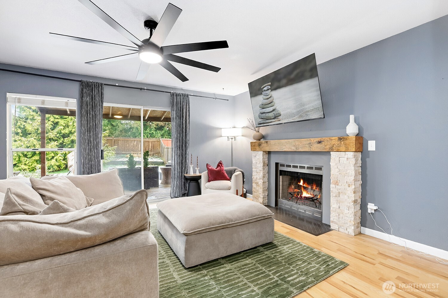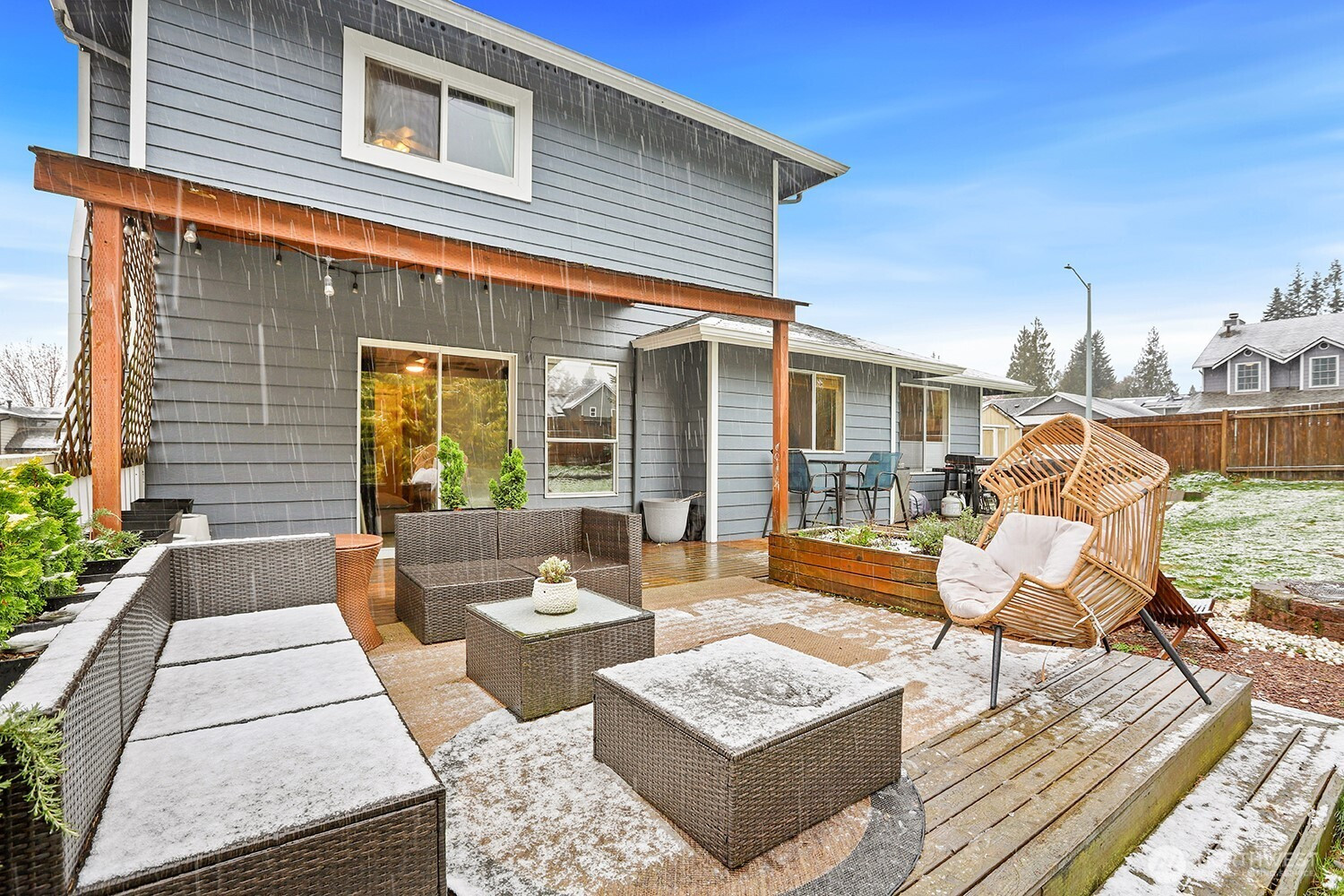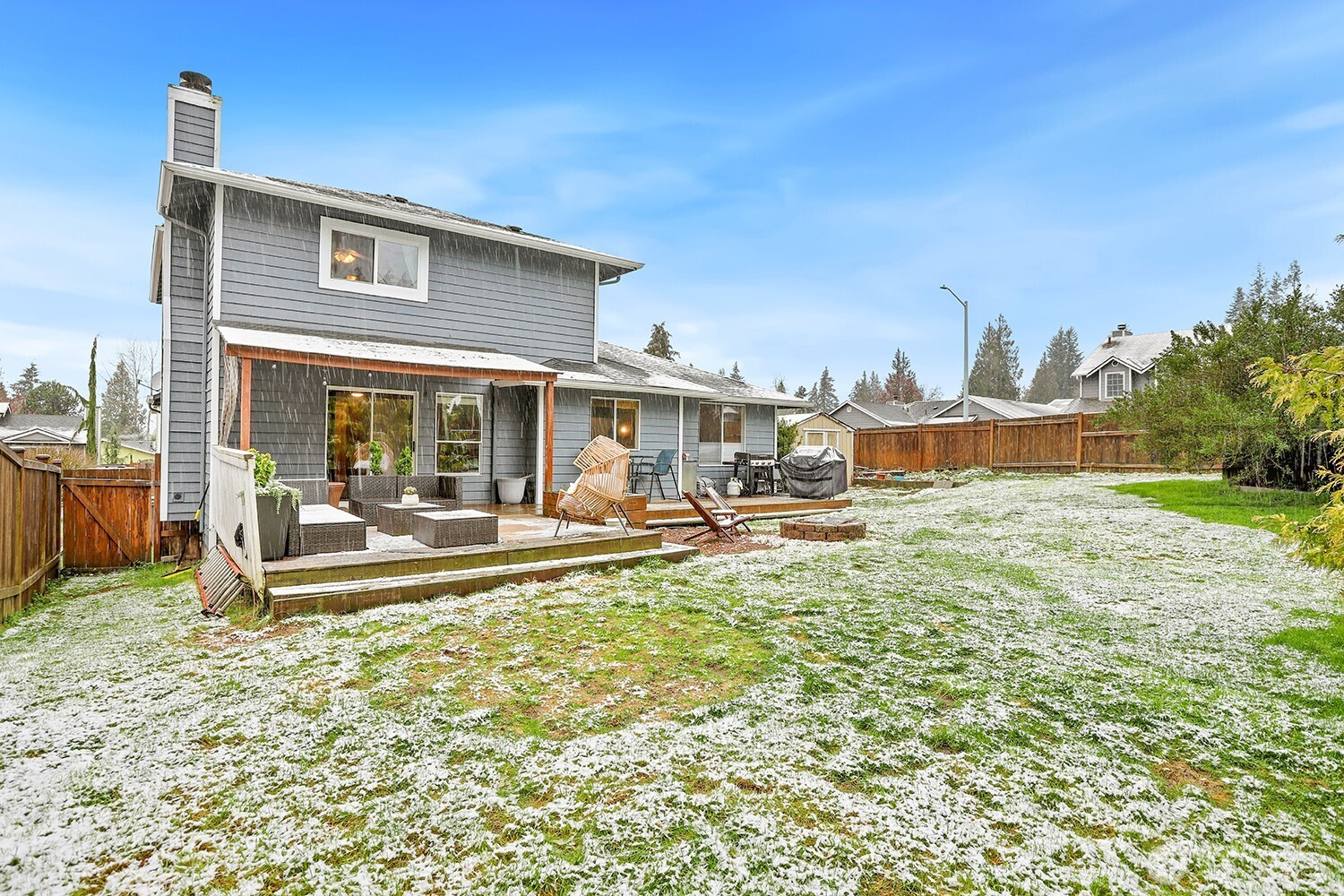 Fantastic opportunity to own in Lake Stevens, and with NO HOA! This 3 bedroom, 2.25 bathroom home is perfectly situated on a spacious corner lot in prime, central location close to everything you need. Enjoy outdoor living with a fully fenced backyard, garden shed, and a relaxing deck—your own private oasis to unwind. Step through your covered country porch, and the interior greets you with vaulted ceilings, a versatile layout featuring a bright living room, dining room, and a cozy family room with a wood-burning fireplace. The kitchen is ideally positioned between the dining and family rooms, making it perfect for both everyday living and entertaining. The living room showcases a beautiful bay window overlooking the front porch, while the generously sized primary suite offers two closets, a full bath, and a vanity area with a skylight that fills the space with natural light. Additional bedrooms are spacious and comfortable, providing flexibility for guests, work, or hobbies. This home blends comfort, functionality, and outdoor enjoyment—don’t miss this opportunity!