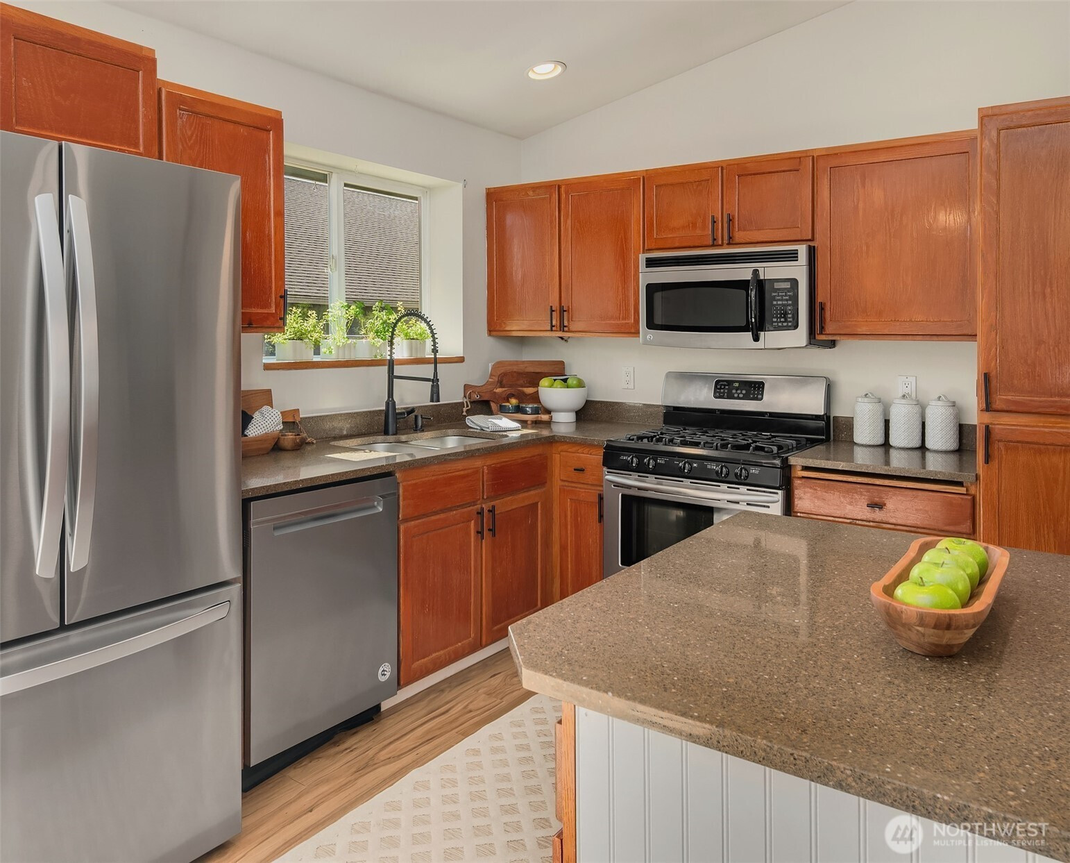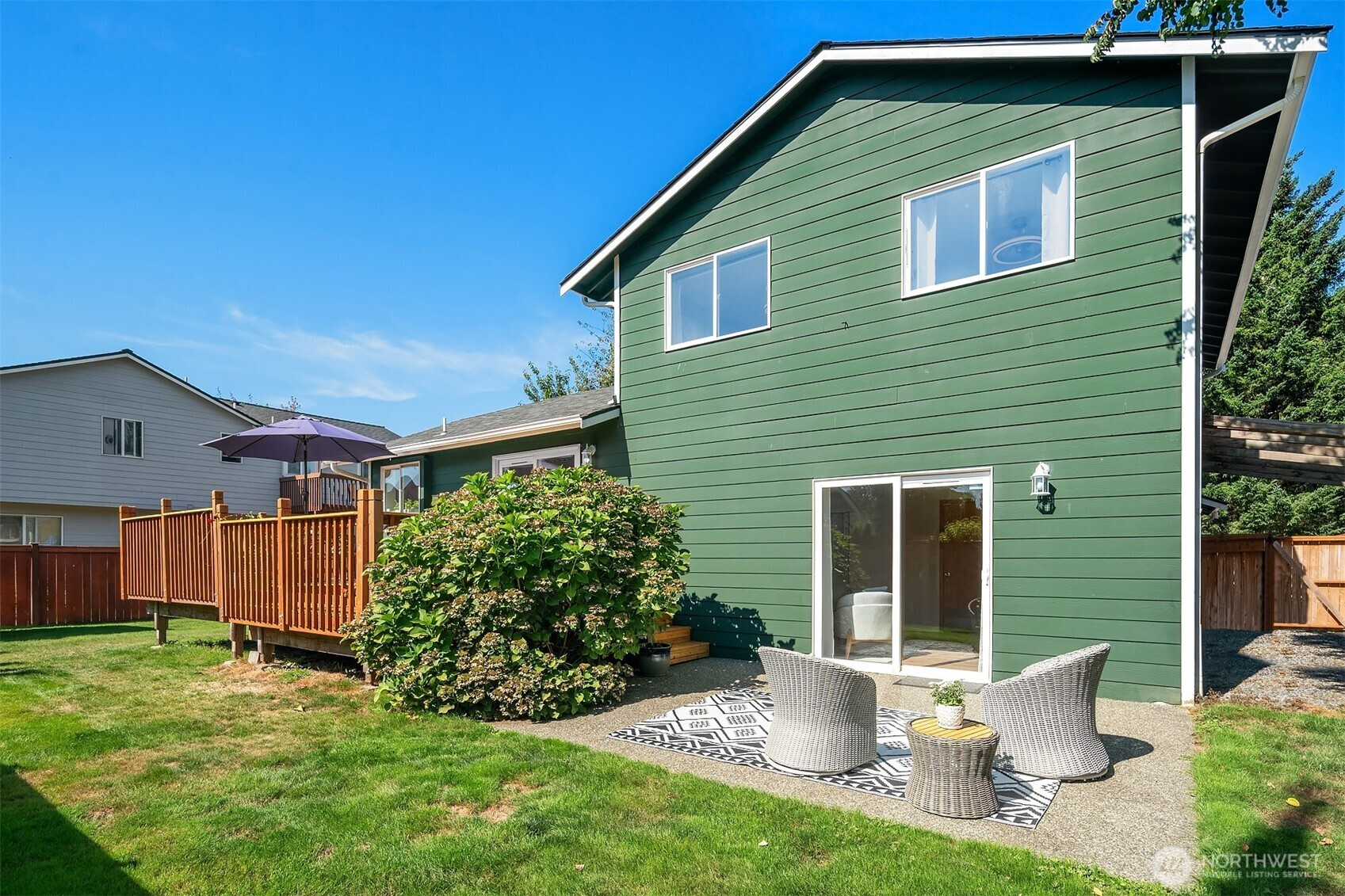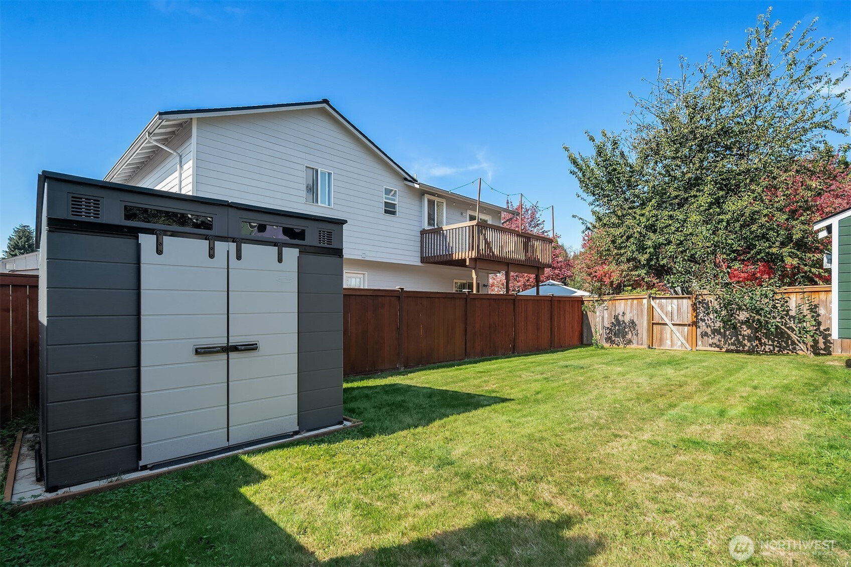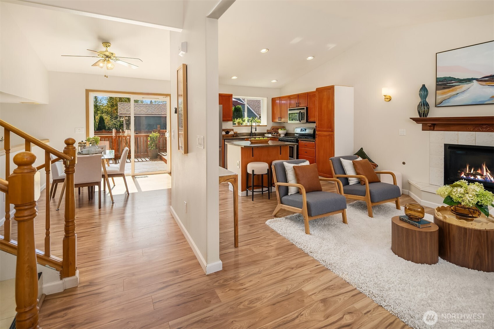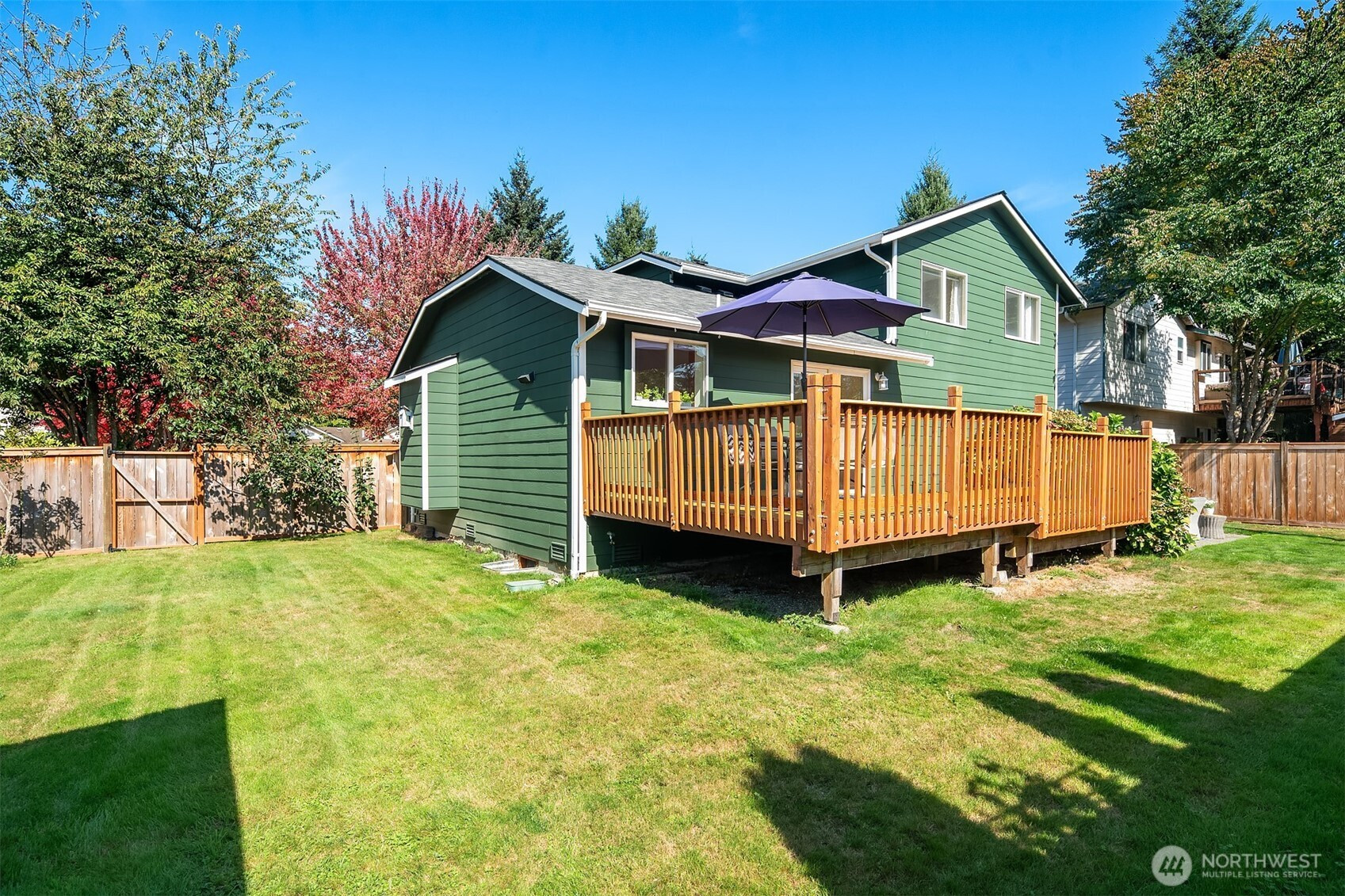 Price Reduced! Storybook charm & convenience await. Lovely tri-level home in the Fryeland's Mountain View community. Bright & inviting great room, vaulted ceilings, gas fireplace. Open-concept kitchen with sleek stone countertops. 3 spacious bedrooms, primary with peaked ceilings & ensuite. Spacious 2nd living space w/powder rm. Patio, oversized deck, outbuilding & a fully fenced yard with the 'just right' balance of play space & low maintenance. Prime Location: Quiet, tree-lined street adjacent to parks & miles of trails. Minutes to Lake Tye, Lords Lake, playgrounds, sports courts, schools, dining & easy commutes! 2025-New decking, fence, washer, fridge. 2022/23-New roof, exterior paint, LVP. Peace of mind-1yr home warranty, pre-inspected.