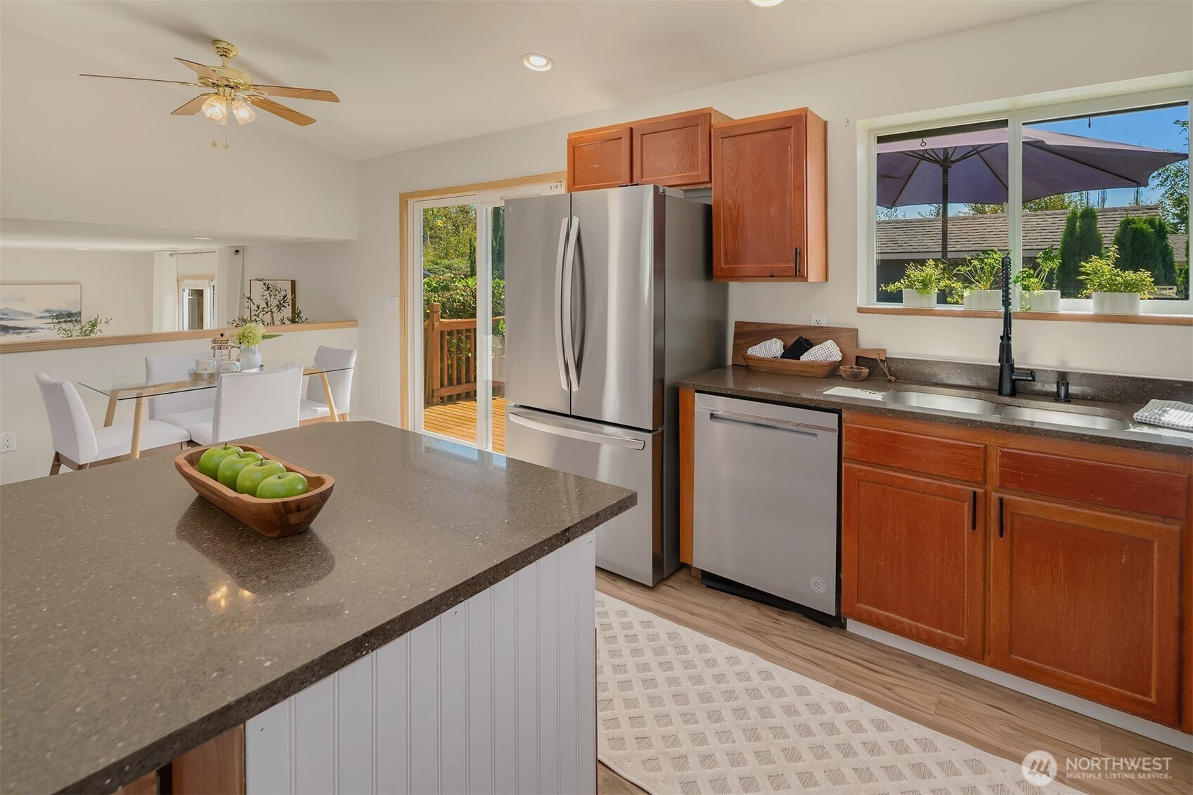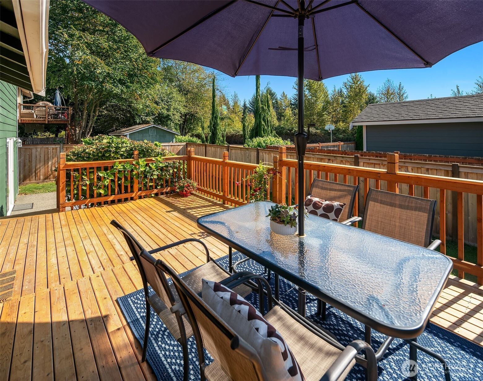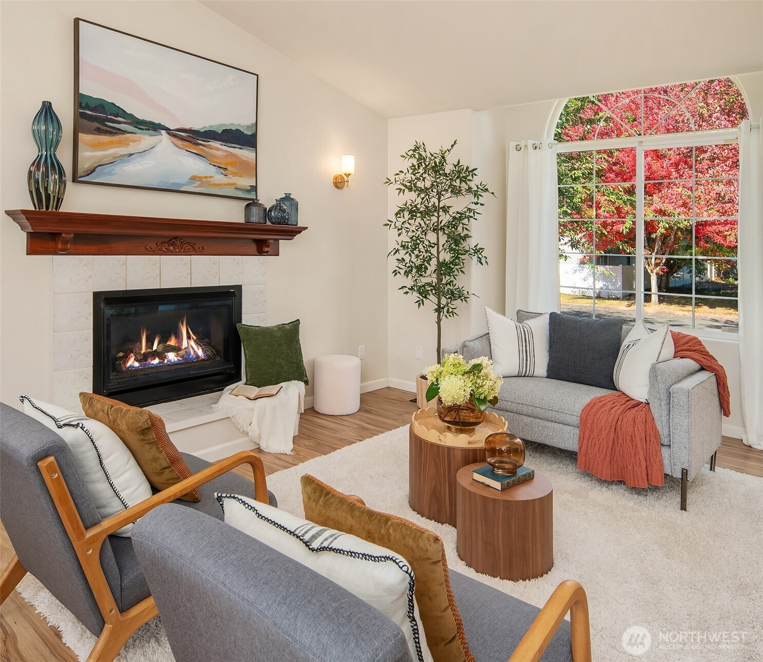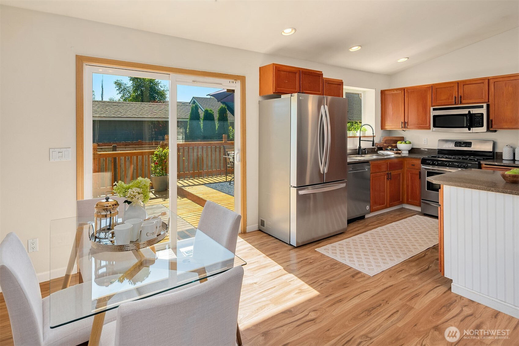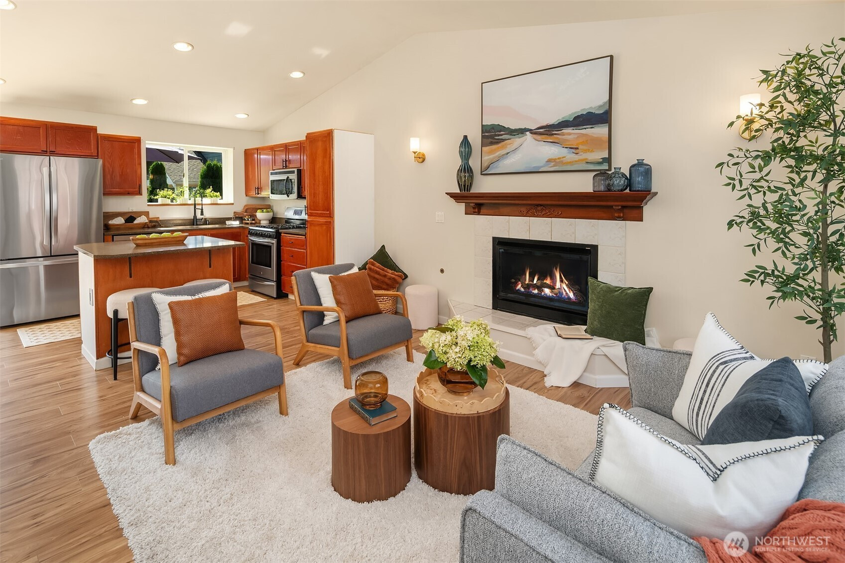 Price Reduced! Storybook charm & convenience await. Lovely tri-level home in the Fryeland's Mountain View community. Bright & inviting great room, vaulted ceilings, gas fireplace. Open-concept kitchen with sleek stone countertops. 3 spacious bedrooms, primary with peaked ceilings & ensuite. Spacious 2nd living space w/powder rm. Patio, oversized deck, outbuilding & a fully fenced yard with the 'just right' balance of play space & low maintenance. Prime Location: Quiet, tree-lined street adjacent to parks & miles of trails. Minutes to Lake Tye, Lords Lake, playgrounds, sports courts, schools, dining & easy commutes! 2025-New decking, fence, washer, fridge. 2022/23-New roof, exterior paint, LVP. Peace of mind-1yr home warranty, pre-inspected.