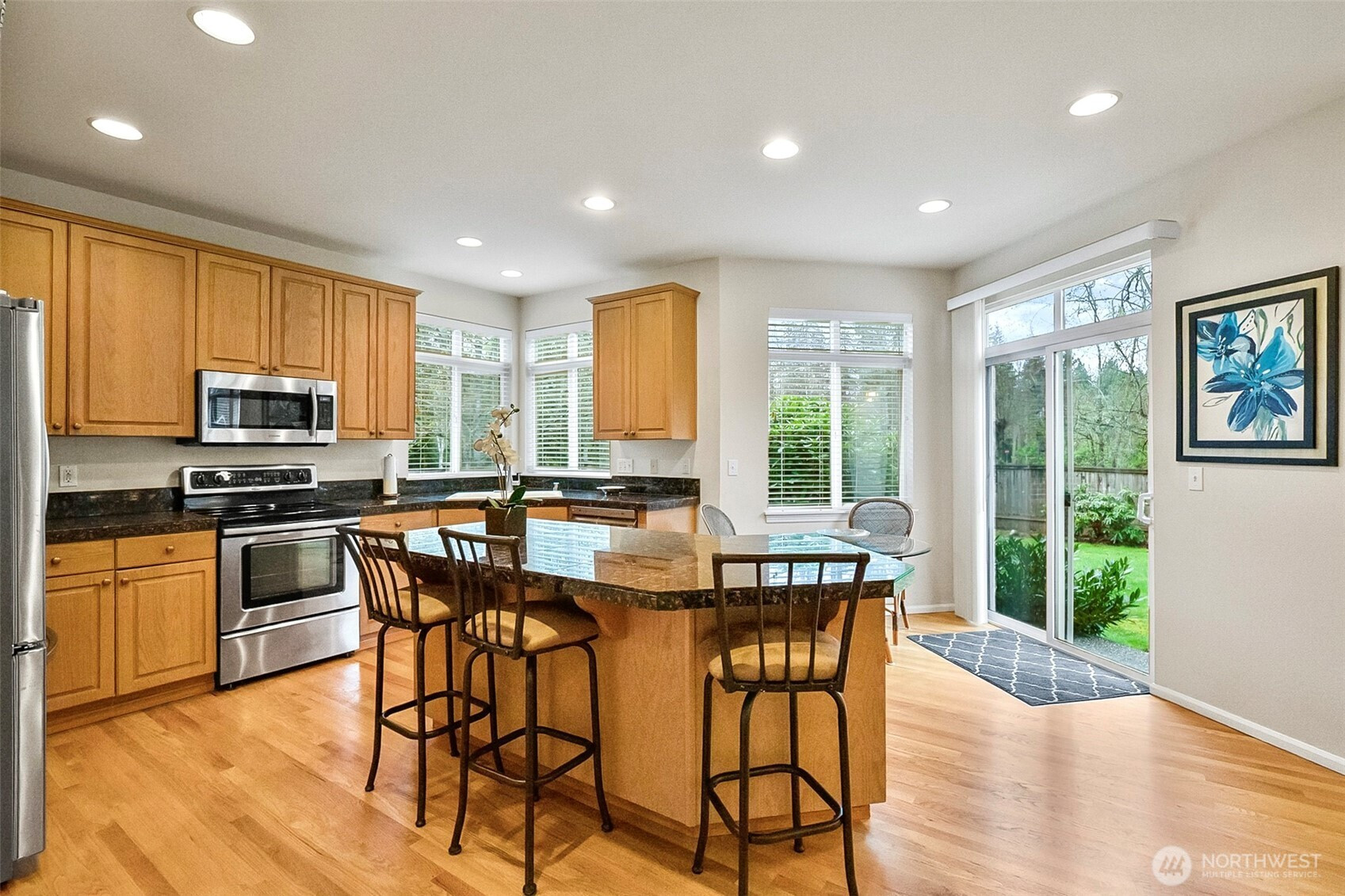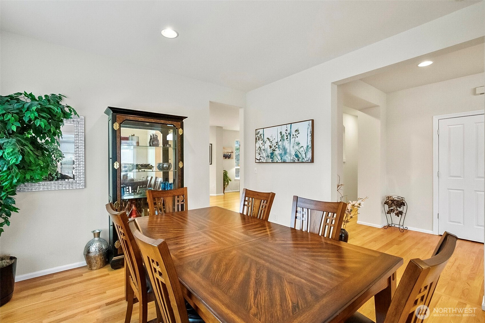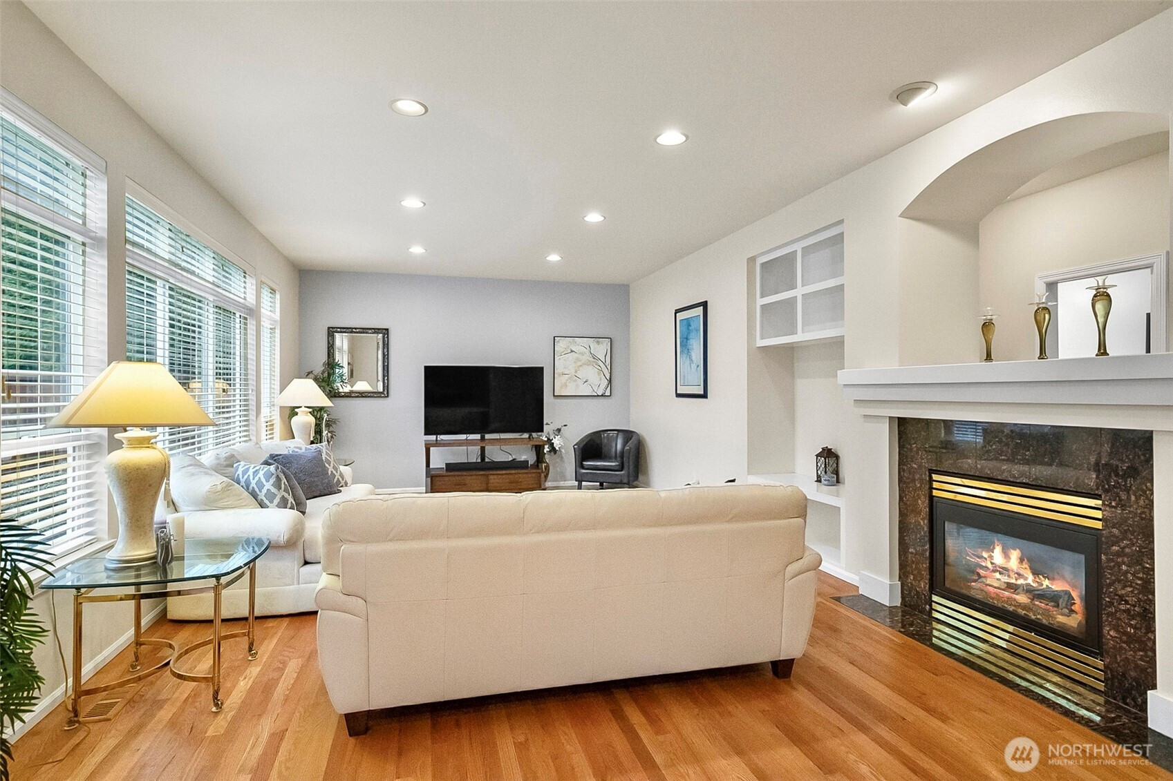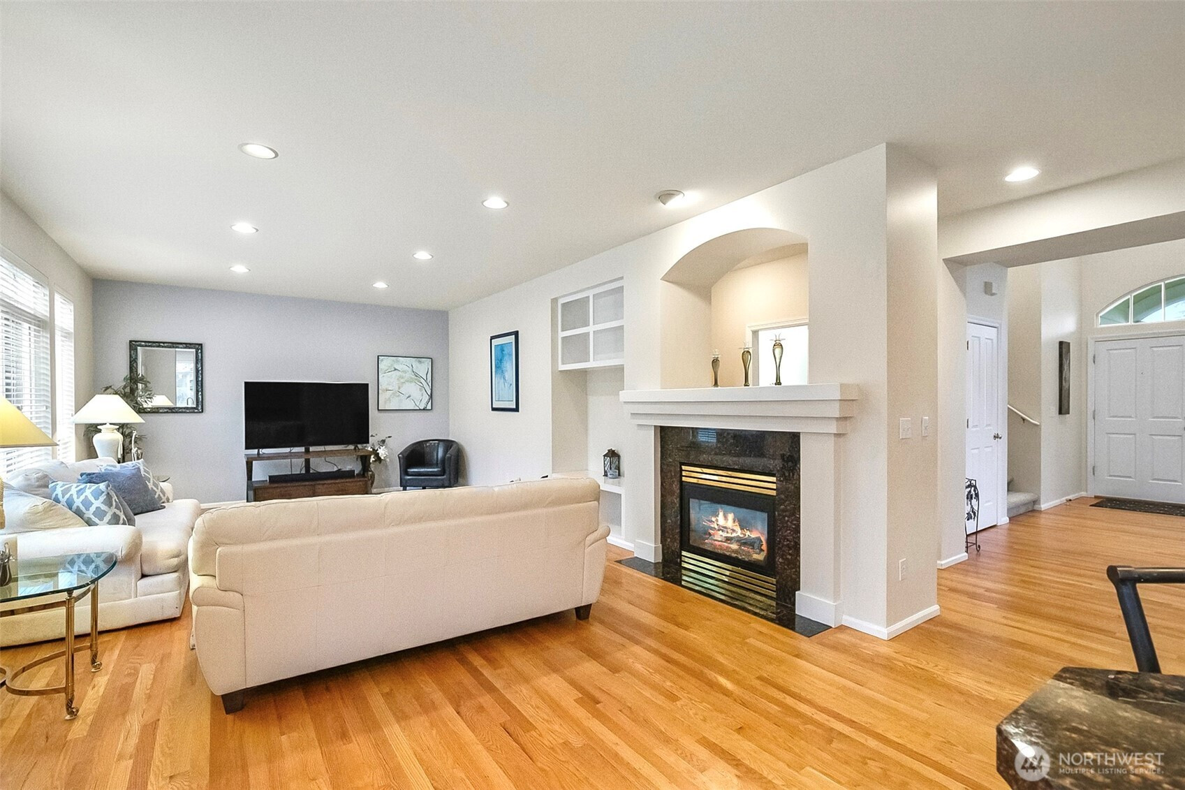 Welcome to the desirable Mill Creek Meadows community, where comfort meets convenience! This lovely home sits on a premium corner lot backing to a serene greenbelt, offering both privacy and peaceful surroundings. Step inside to discover rich solid hardwood floors throughout the main level and elegant, inviting formal living spaces—perfect for both relaxing and entertaining. The open-concept kitchen featuring stainless steel appliances, a spacious center island with seating and a pantry. It flows seamlessly into the expansive family room, complete with a cozy gas fireplace and a charming built-in nook. Upstairs, retreat to the spacious primary suite with a 5-piece ensuite bath and walk-in closet. Two additional guest bedrooms, a full bathroom with tile flooring and extra hallway storage provide comfort and functionality for everyday living. Enjoy outdoor living in the private, fully fenced backyard with an easy-care patio—ideal for gatherings or quiet evenings—plus the added bonus of backing to a tranquil greenbelt. Updates include a durable 50-year roof and Hardie Plank siding for peace of mind. Located within walking distance to Cedar Wood Elementary and Tambark Creek Park, and just minutes from Mill Creek Town Center’s shopping and dining. Commuters will appreciate easy access to I-5 and 405. All within the highly rated Mill Creek School District! This home truly has it all—style, space and an unbeatable location.