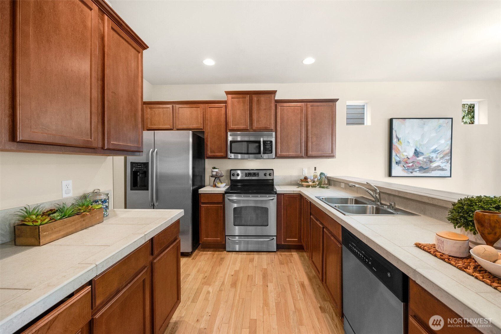 New Price. Charming and Spacious 2-Story Craftsman in quiet Mill Terrace. Front arbor and covered porch lead to a welcoming interior. An open concept floor plan with fine features - solid oak flooring, high ceilings, & fine millwork. Gourmet kitchen with tile counters, seating bar, shaker cabinets, opens to a western-facing dining area & cozy living room with a gas fireplace. Den/office space too. Your primary suite with a 5-piece bath and walk-in is set apart from 2 generously sized bedrooms by a versatile open loft space. Fully fenced back yard features a deck & patio for extra entertainment space. Superb location is a mile+ to the popular Mill Creek Town Center. Close to parks, trails, & many amenities. Quick to I-5, 1-405. Great Schools