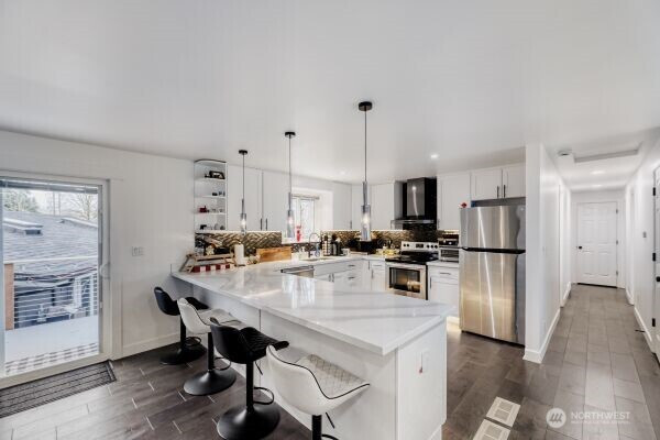 Experience exceptional living in this beautiful two-story Lynwood home, featuring a massive bonus area and an indoor pool for year-round enjoyment. This turnkey residence offers an open floor plan with a stunning kitchen equipped with quartz countertops, sleek white cabinetry, and stainless steel appliances. The main level includes a luxurious primary suite with an attached 3/4 bathroom, along with two spacious bedrooms and a full bath. The finished lower level boasts two large versatile rooms, a wet bar ideal for entertaining, and another full bathroom. The impressive enclosed pool room, approximately 800 square feet, provides a private oasis for relaxation and recreation. Additional highlights include a two-car garage, generous parking space for RV or boat, and a modern interior featuring new flooring, fresh paint, updated doors, trim, lighting, and refinished hardwood floors. This secluded home combines style, comfort, and functionality in a perfect setting.