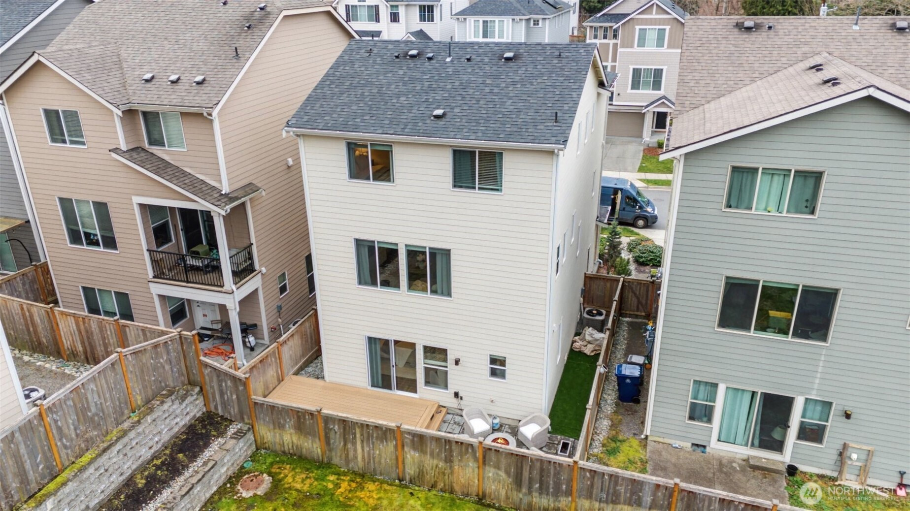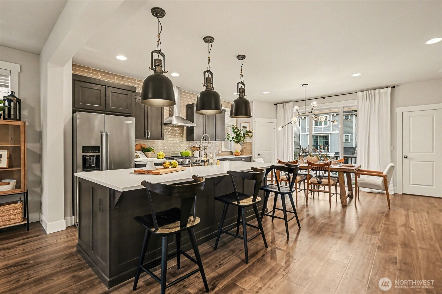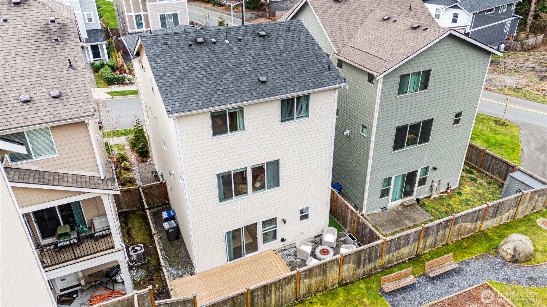 Impeccably maintained stand-alone 3-story home in coveted Dawson Place, built in 2021 with a 2-car garage and central A/C. The open-concept main floor features a chef’s kitchen with gas range, stainless steel appliances, soft-close cabinetry, and two pantries, flowing into the dining area and great room with gas fireplace and deck access. A dedicated office nook adds ideal work-from-home space. Luxury vinyl flooring spans two levels with tasteful trim detail throughout. Upstairs offers a spacious primary suite with walk-in closet and well-appointed bath, plus two additional bedrooms and a full bath. The lower level includes a versatile bonus room with full bath, perfect as a 4th bedroom, guest suite, or office. Enjoy backyard space, community playground, and prime access to Alderwood Mall, I-405, I-5, and the Lynnwood Link Extension.
